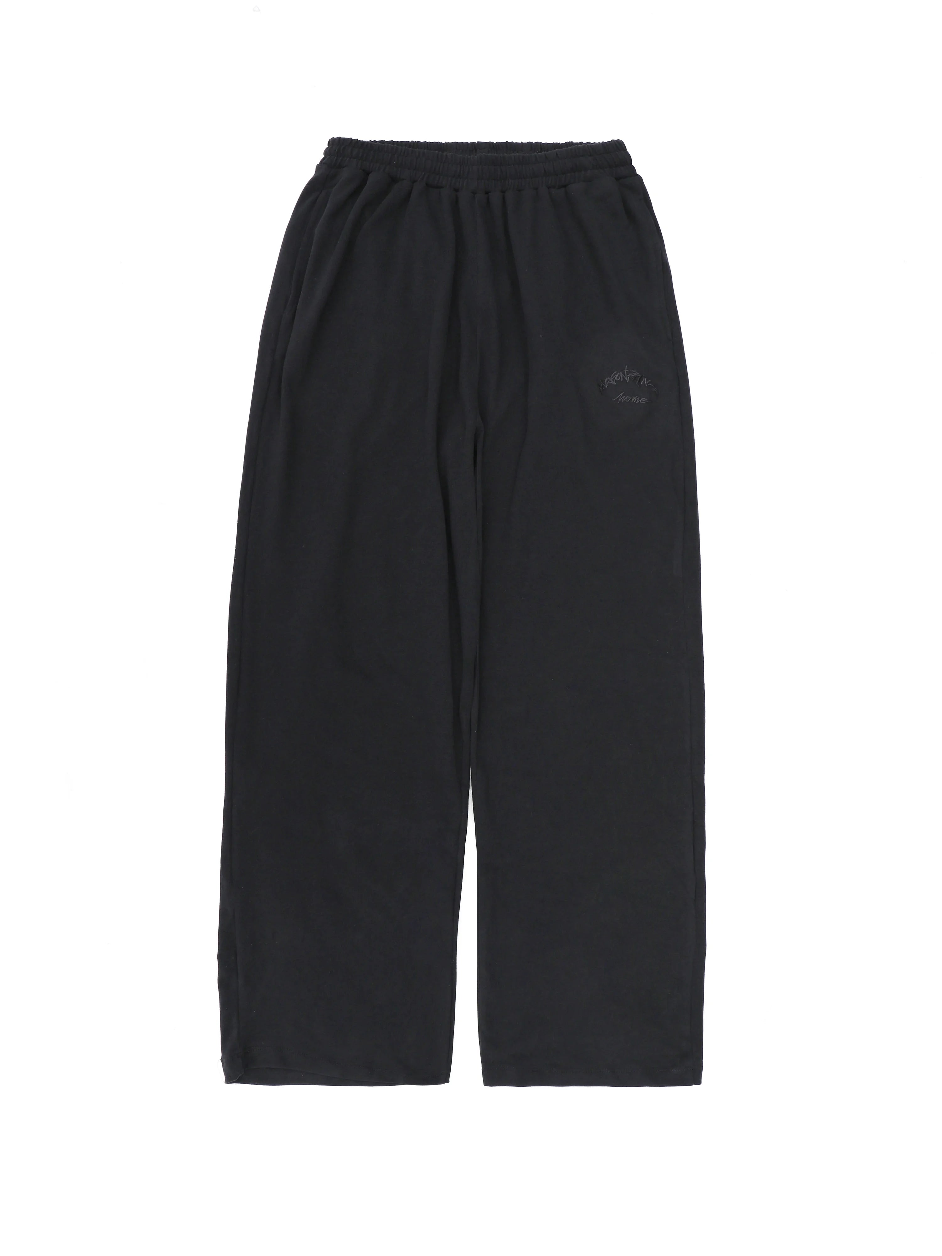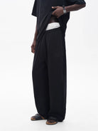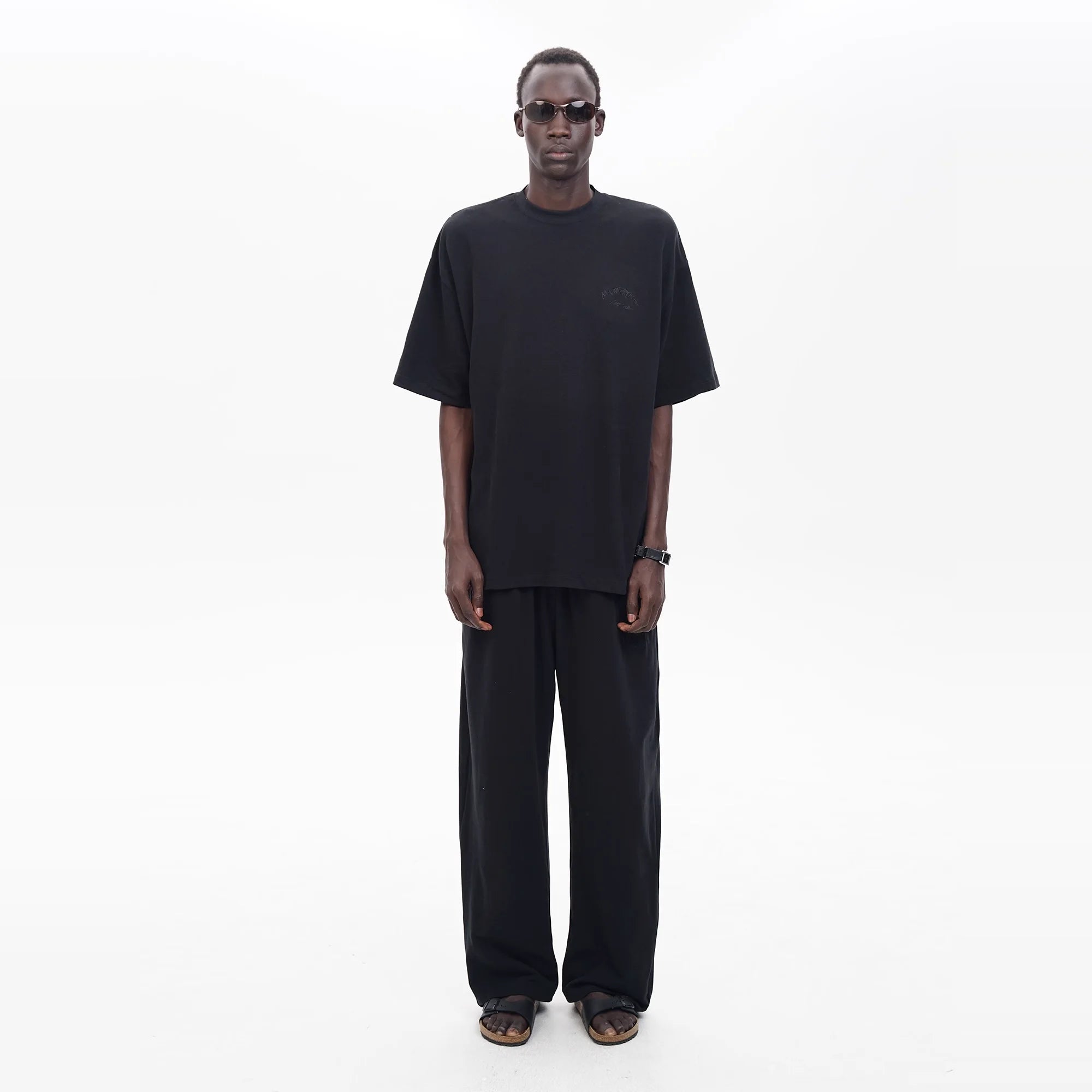 Relax in effortless style with this all-black knit loungewear set for men. The ensemble includes a loose-fitting crewneck T-shirt featuring a subtle tonal graphic on the chest, paired with wide-leg sweatpants for maximum comfort. Designed with a minimalist aesthetic, this set offers a relaxed silhouette ideal for home or casual wear. Complete your look with simple accessories and slide sandals for an understated yet refined vibe.