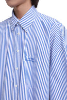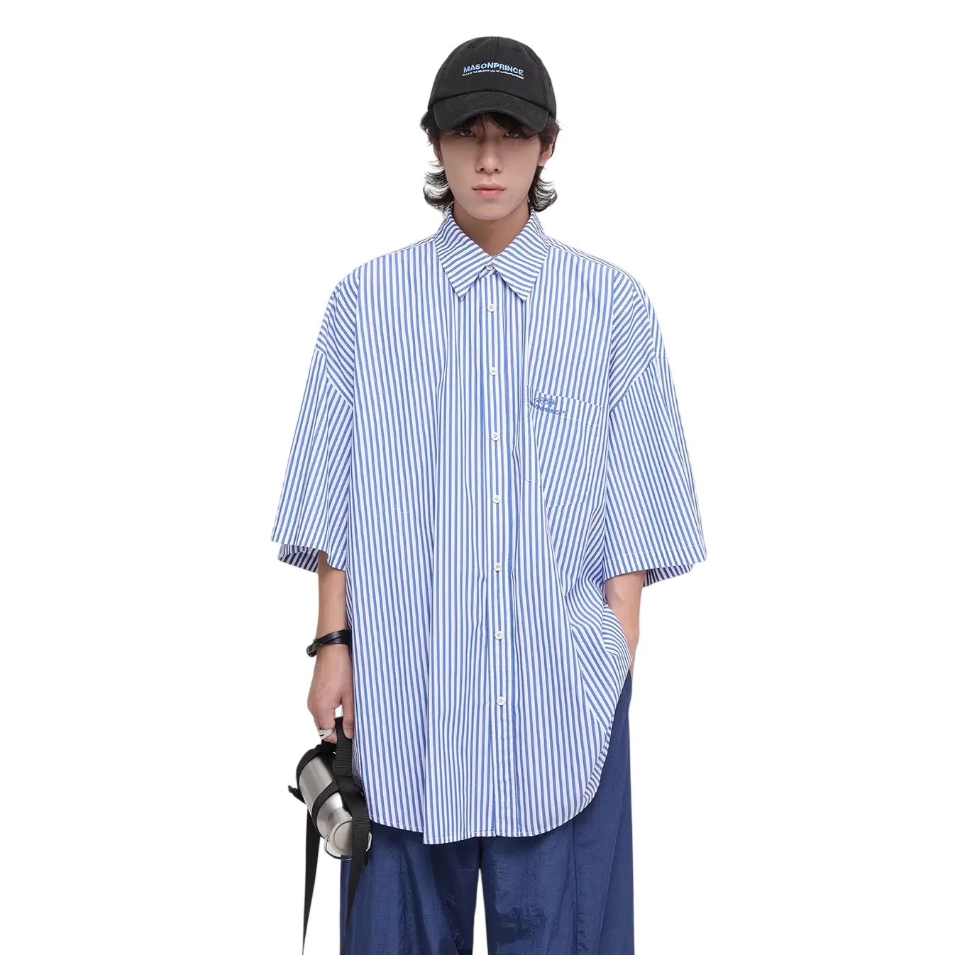 This men's short sleeve shirt features a timeless blue and white vertical stripe pattern for a classic yet casual look. Designed with a button-up front and a traditional pointed collar, it offers a loose, relaxed fit ideal for everyday wear. A subtle chest pocket logo adds a touch of modern detail. The breathable material and oversized cut make it a comfortable choice for summer styling.