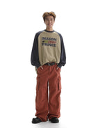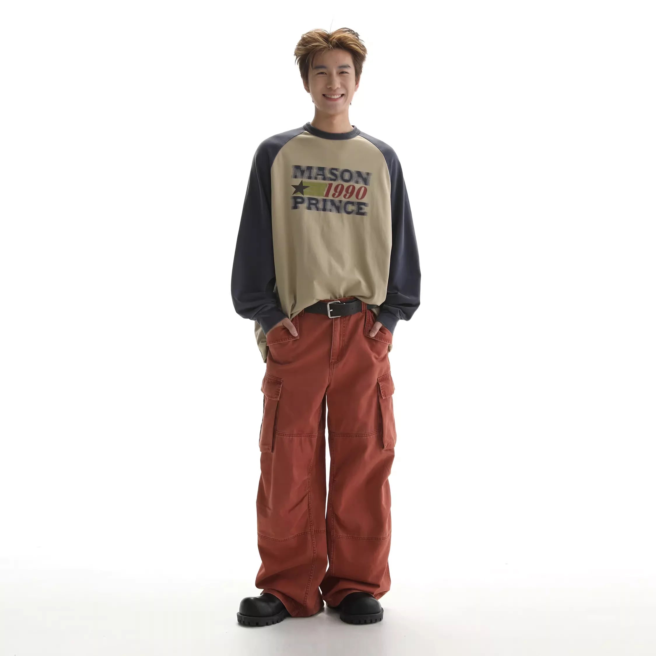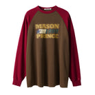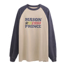 Elevate your casual wardrobe with this men's long sleeve T-shirt, featuring a standout beige and navy colorblock design. The shirt showcases a bold "MASON 1990 PRINCE" graphic print across the front, adding a retro streetwear vibe. Designed for a relaxed, oversized fit, it offers both comfort and style for everyday wear. Perfect for pairing with cargo pants or jeans, this top brings a trendy yet laid-back look to your seasonal outfits.