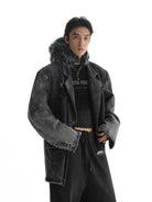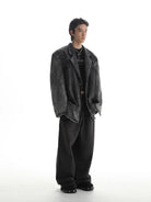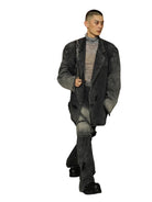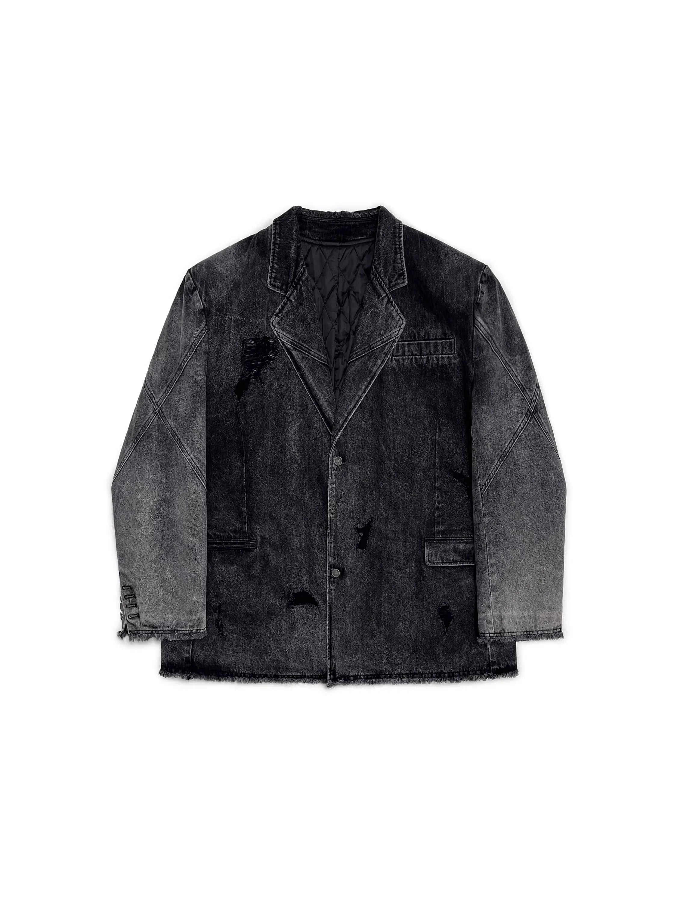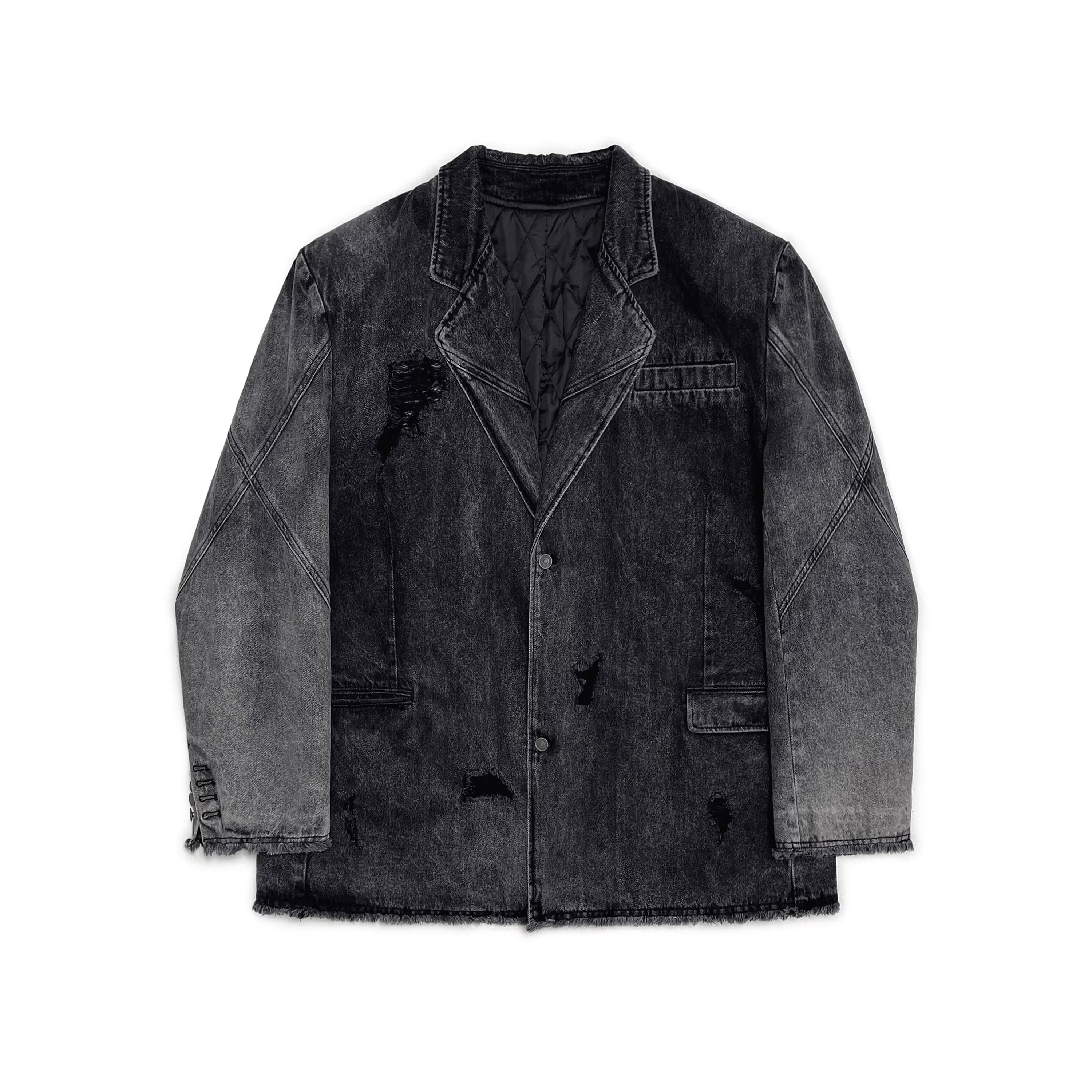 This men's blazer showcases a bold fusion of classic tailoring and rugged streetwear. Designed in a washed black denim, it features a deconstructed silhouette with intentional fraying, distressed detailing, and faded areas throughout for a vintage aesthetic. The single-breasted closure, structured collar, and prominent seam stitching offer a refined touch, while flap pockets at the waist and a welt chest pocket provide functional appeal. Finished with an unfinished hem and quilted inner lining, this piece is ideal for fall and winter styling with an edge.