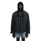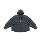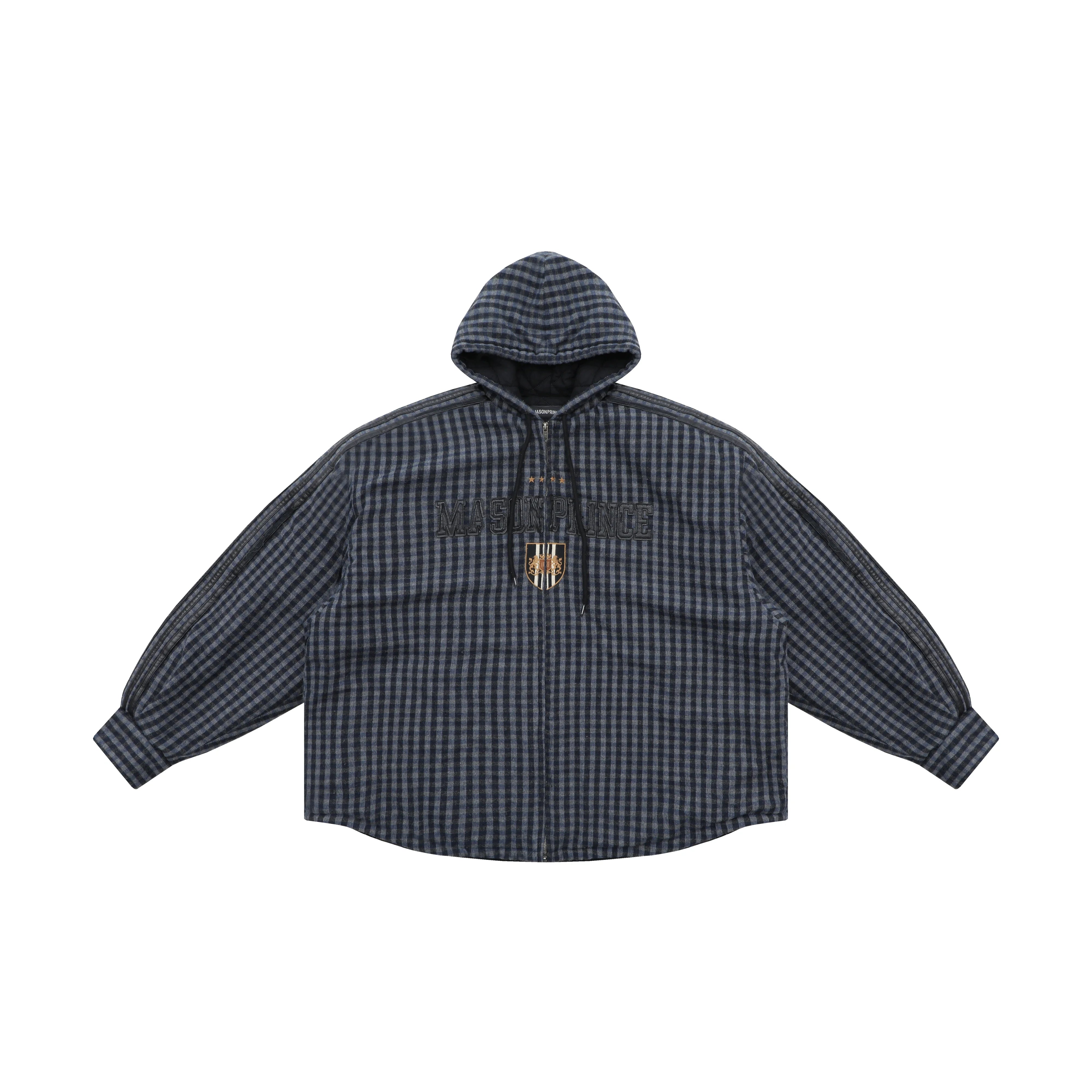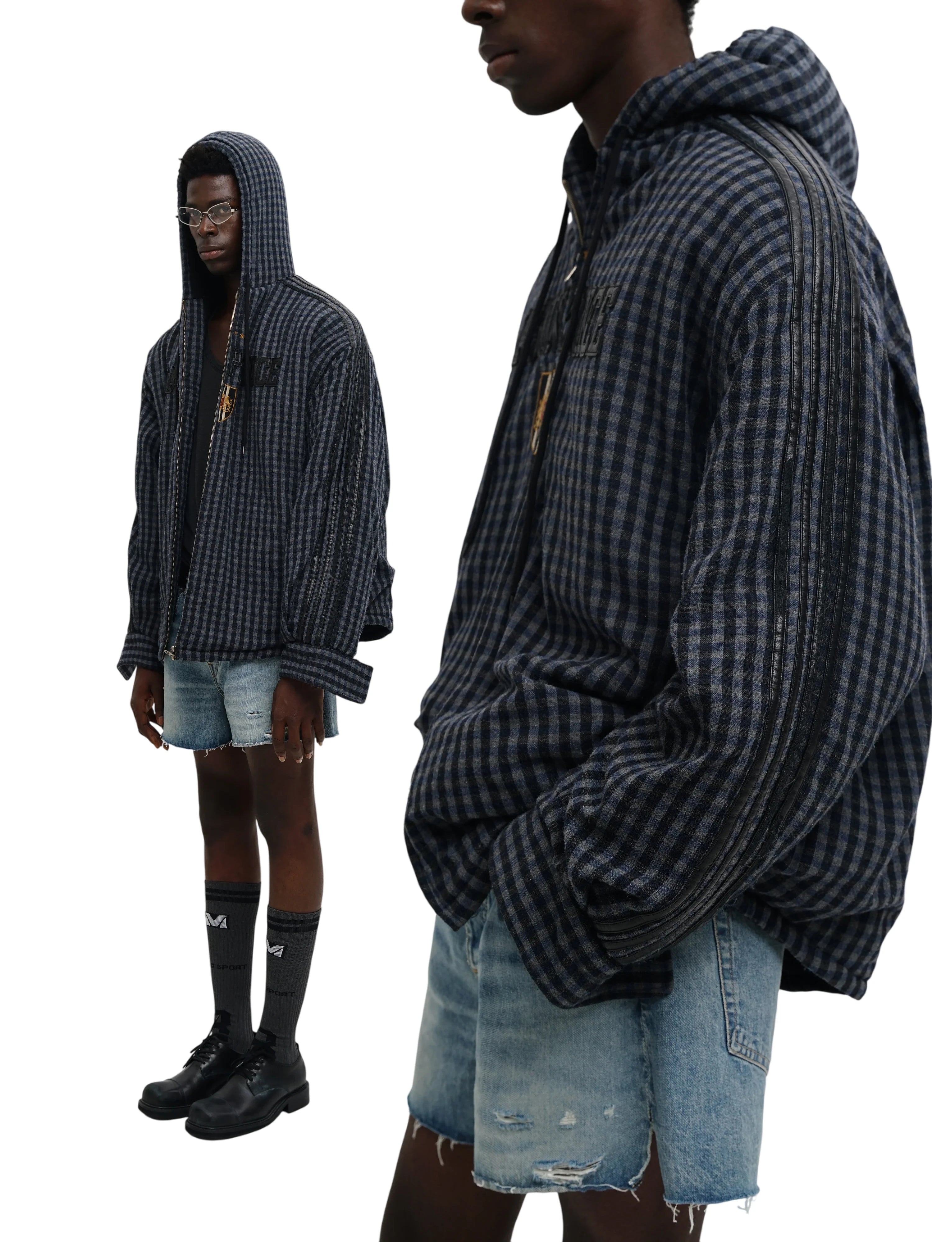 This men's hooded plaid jacket features a dark navy and black color palette with a distressed, vintage finish. Designed with a relaxed, slightly oversized silhouette, it includes long sleeves, a gathered hem, and front zip closure. Embellished with embroidered appliqué details such as crest emblems and text including "MADE IN FRANCE," it offers a bold and unique aesthetic. The adjustable drawstring hood adds a sporty touch, making it a standout piece for casual styling.