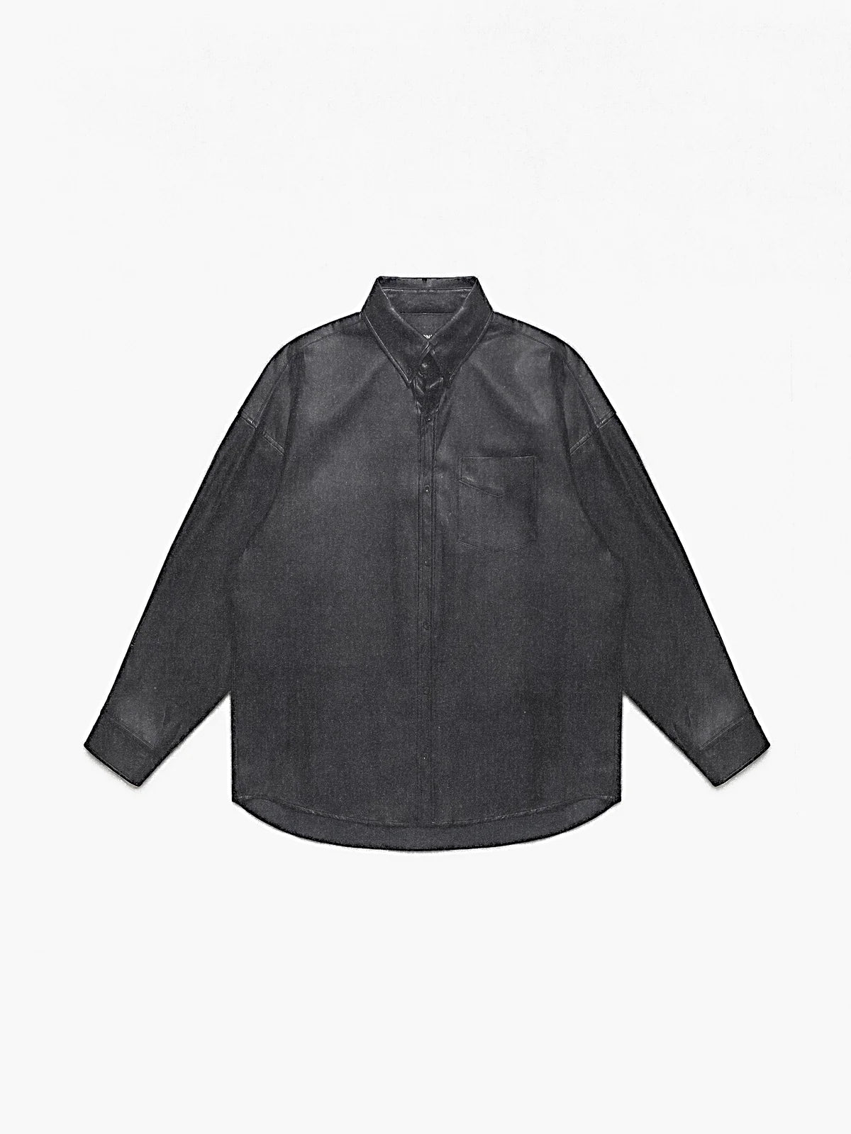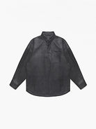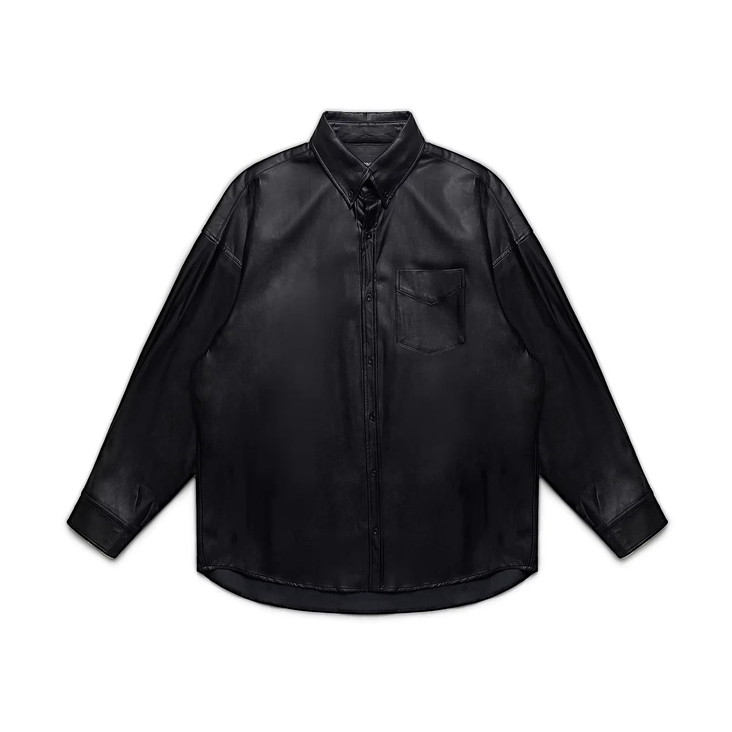 Elevate your streetwear style with this men's faux leather oversized shirt jacket. Designed with a classic button-down front and open collar, its relaxed silhouette offers comfort and versatility. The jacket features a glossy finish, wide-cut long sleeves, and functional chest pockets for a casual yet modern look. Ideal for layering in cooler seasons, it's a statement piece perfect for adding an edge to any outfit.