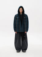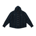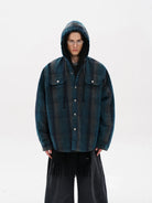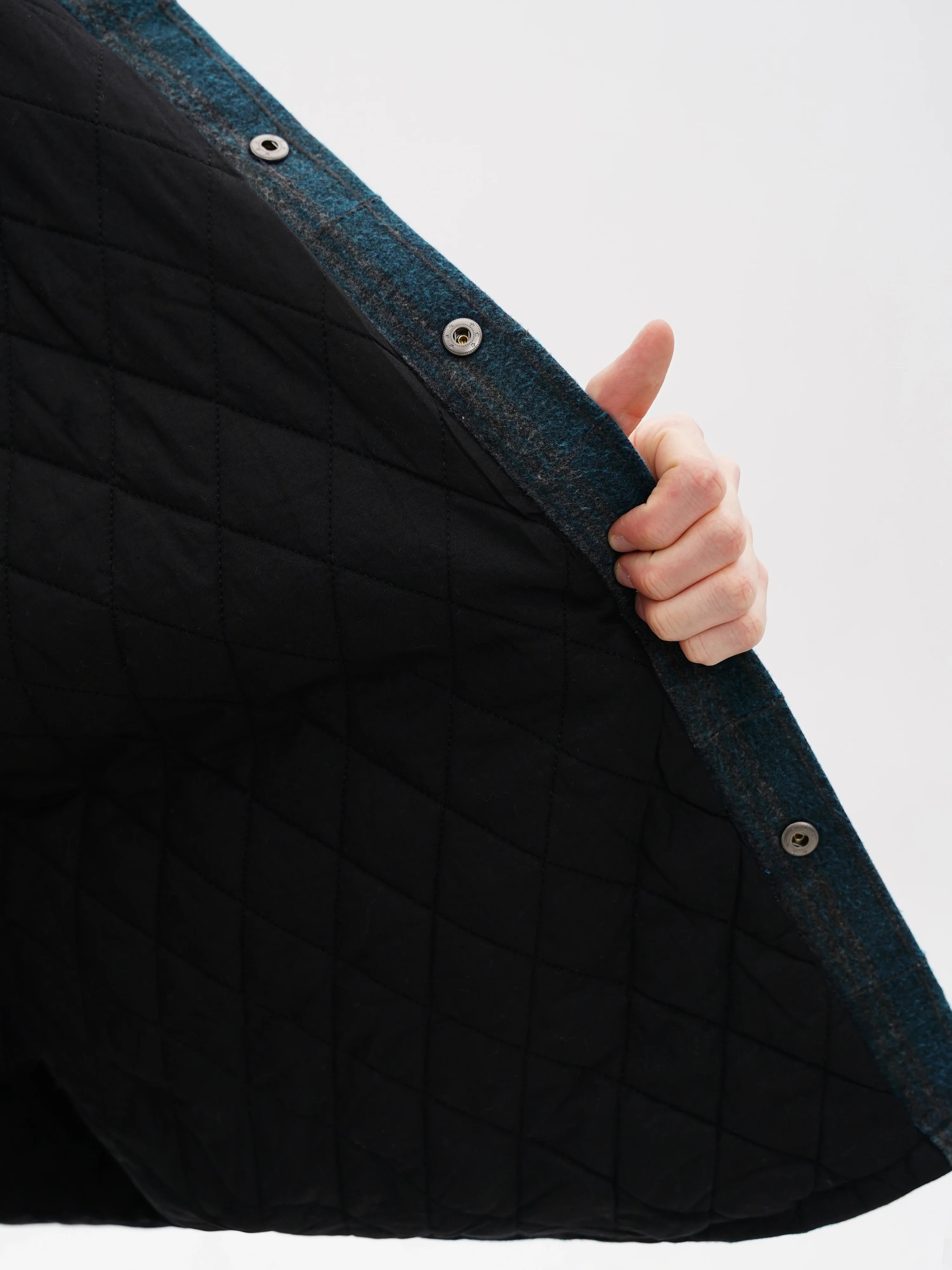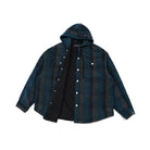 Stay warm and stylish with this men's long-sleeve hooded flannel jacket. Featuring a classic plaid pattern in dark teal, black, and brown tones, this jacket adds a rugged touch to your winter or fall wardrobe. The quilted interior lining offers enhanced insulation and comfort, while the silver snap button front closure ensures ease of wear.