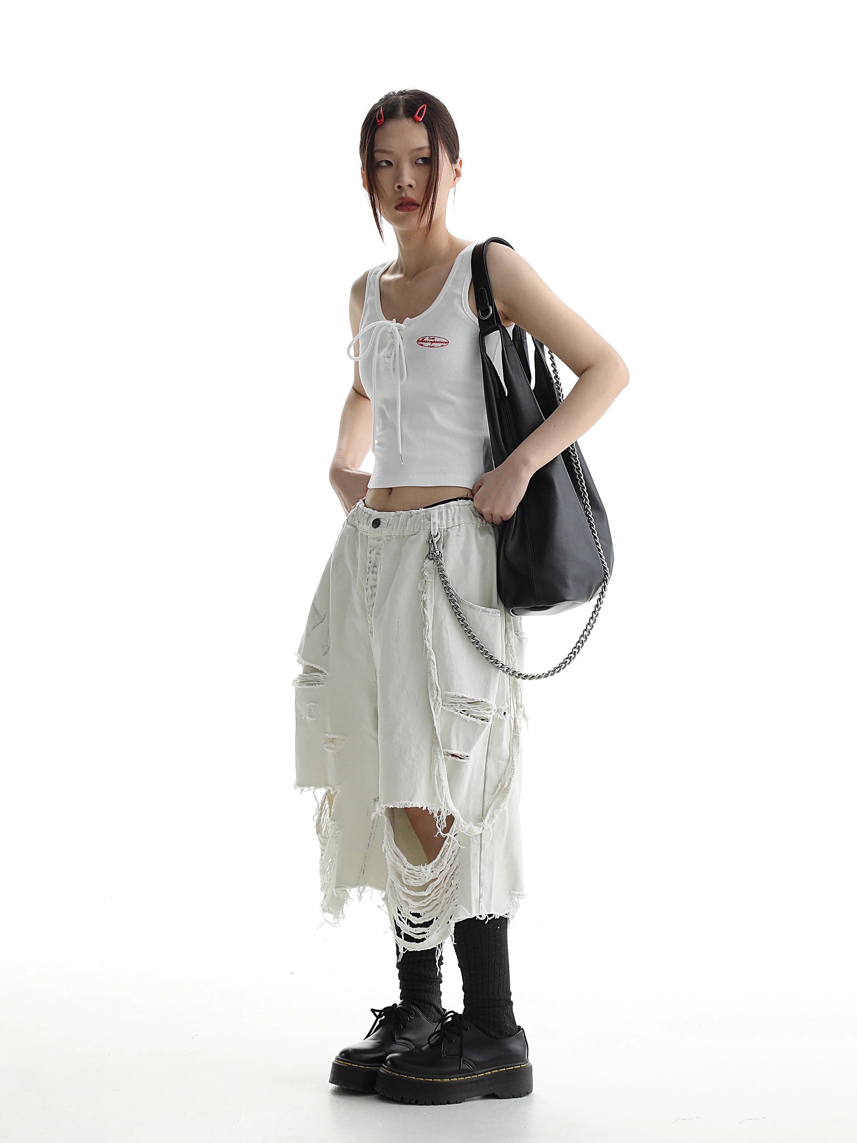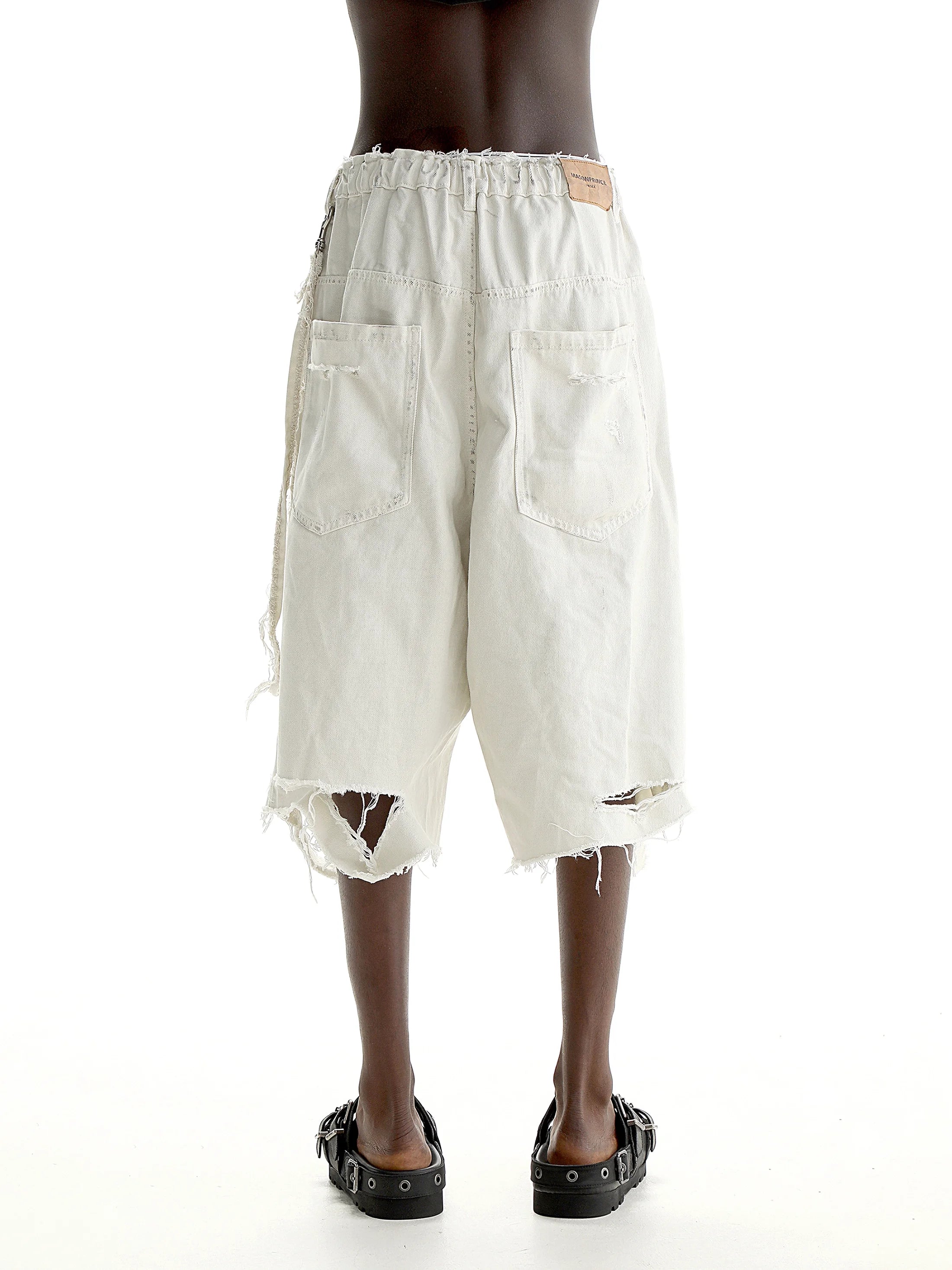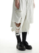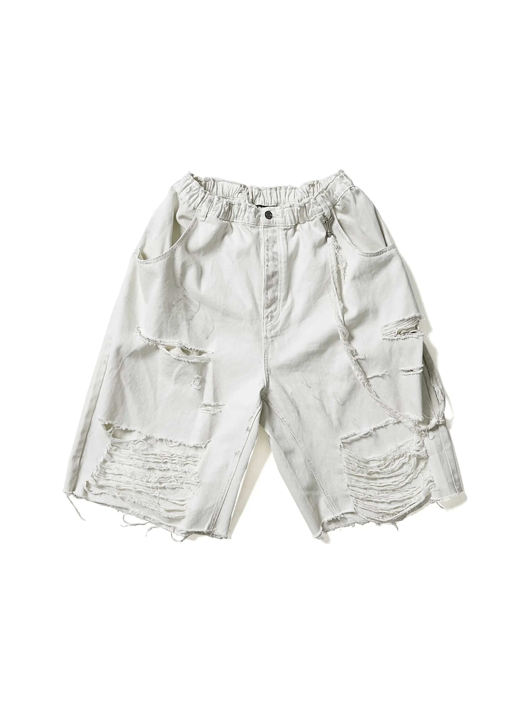 These men's 7/10 length denim shorts feature a unique dirty gray mud-dyed finish, giving them an edgy, worn-in appeal ideal for casual streetwear. Designed with a relaxed, loose fit and heavy distressing throughout, including frayed hems and a below-the-knee cut, they deliver both comfort and bold, modern style. Perfect for summer, these shorts are a distinctive addition to any fashion-forward wardrobe.