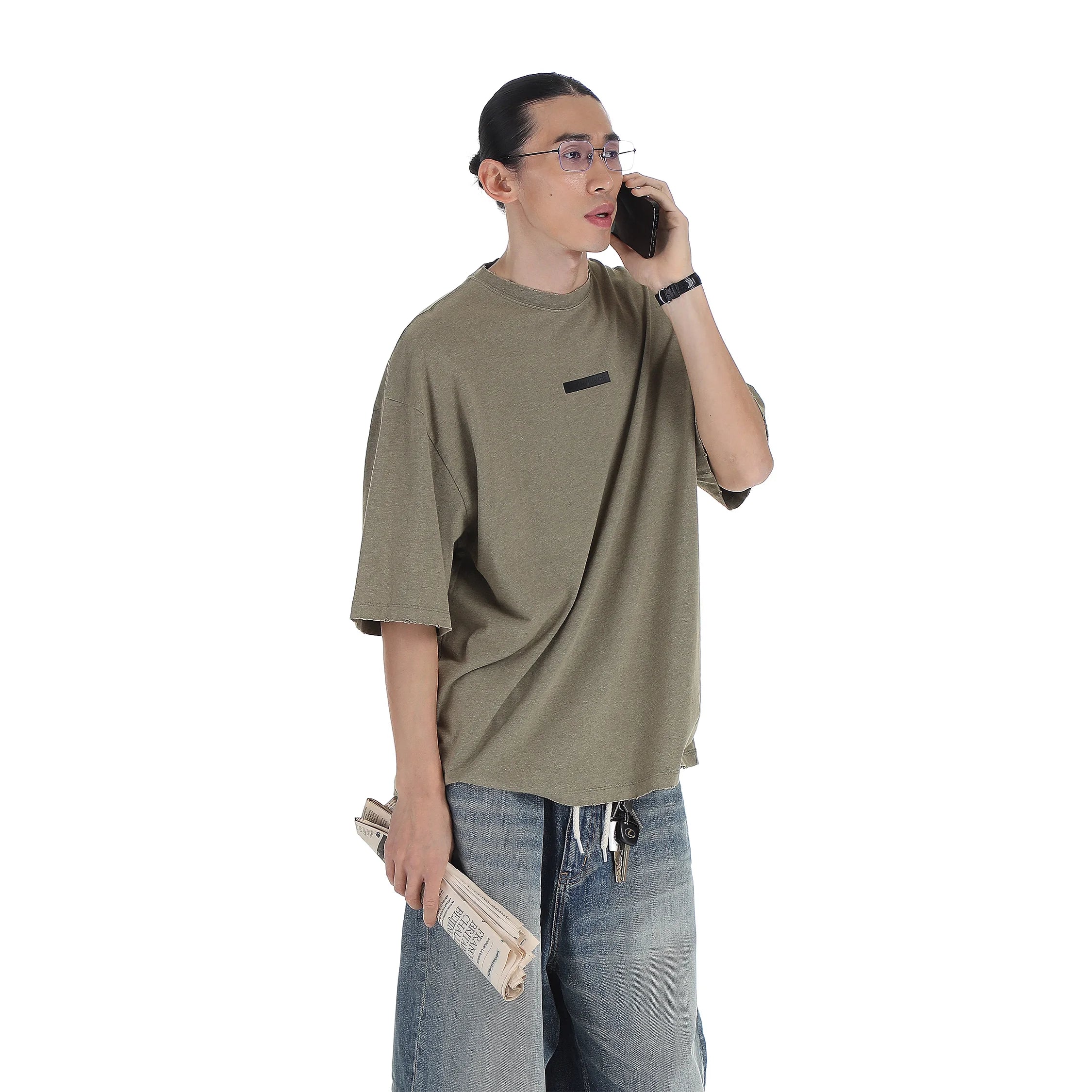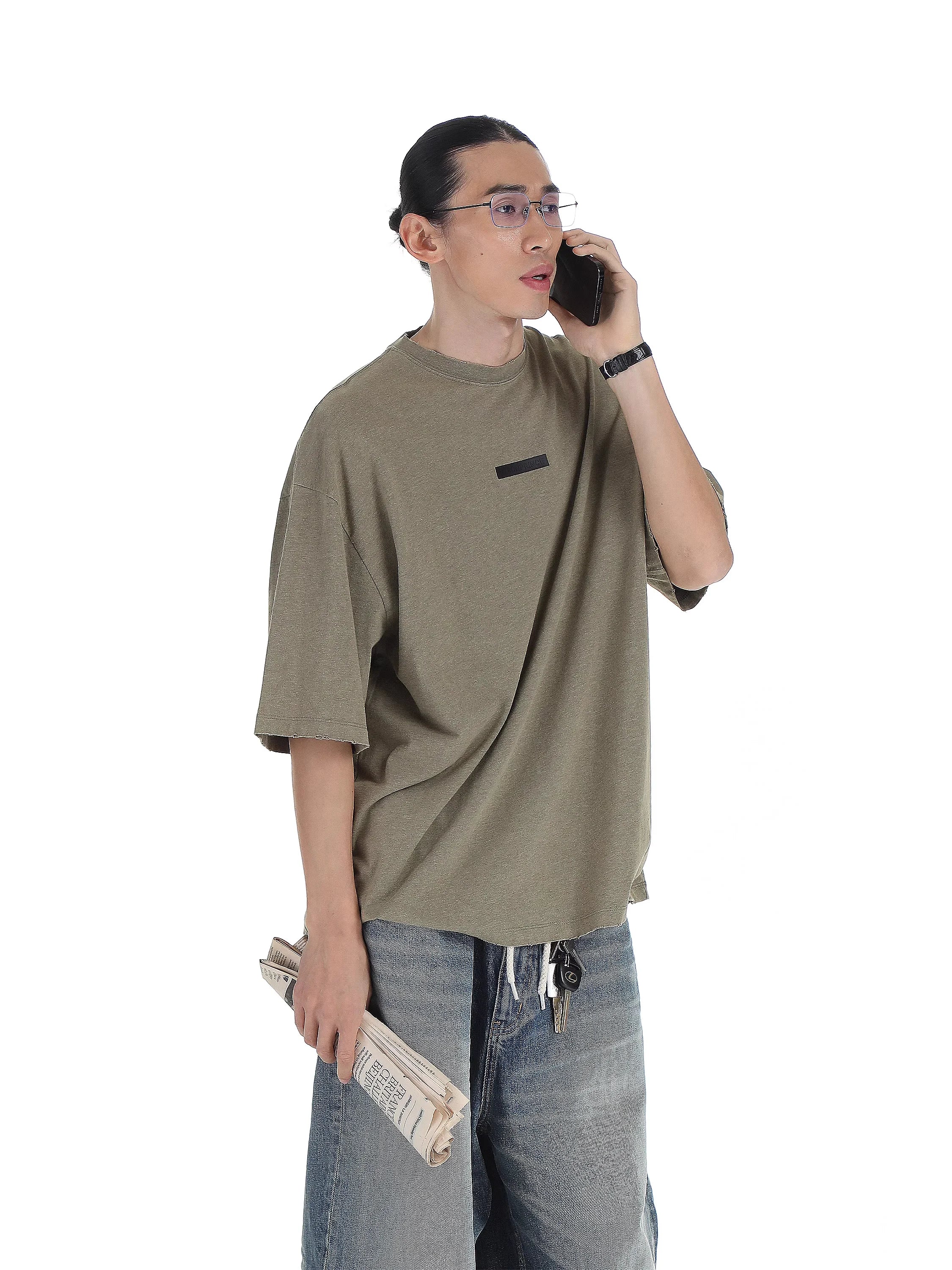 Stay cool and stylish with this men's oversized short sleeve T-shirt, perfect for summer. Made from breathable fabric, it features a relaxed fit with dropped shoulders and a soft olive-green hue. A subtle silicone nameplate adds a modern touch to the chest area, offering minimalist detail for casual looks.