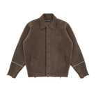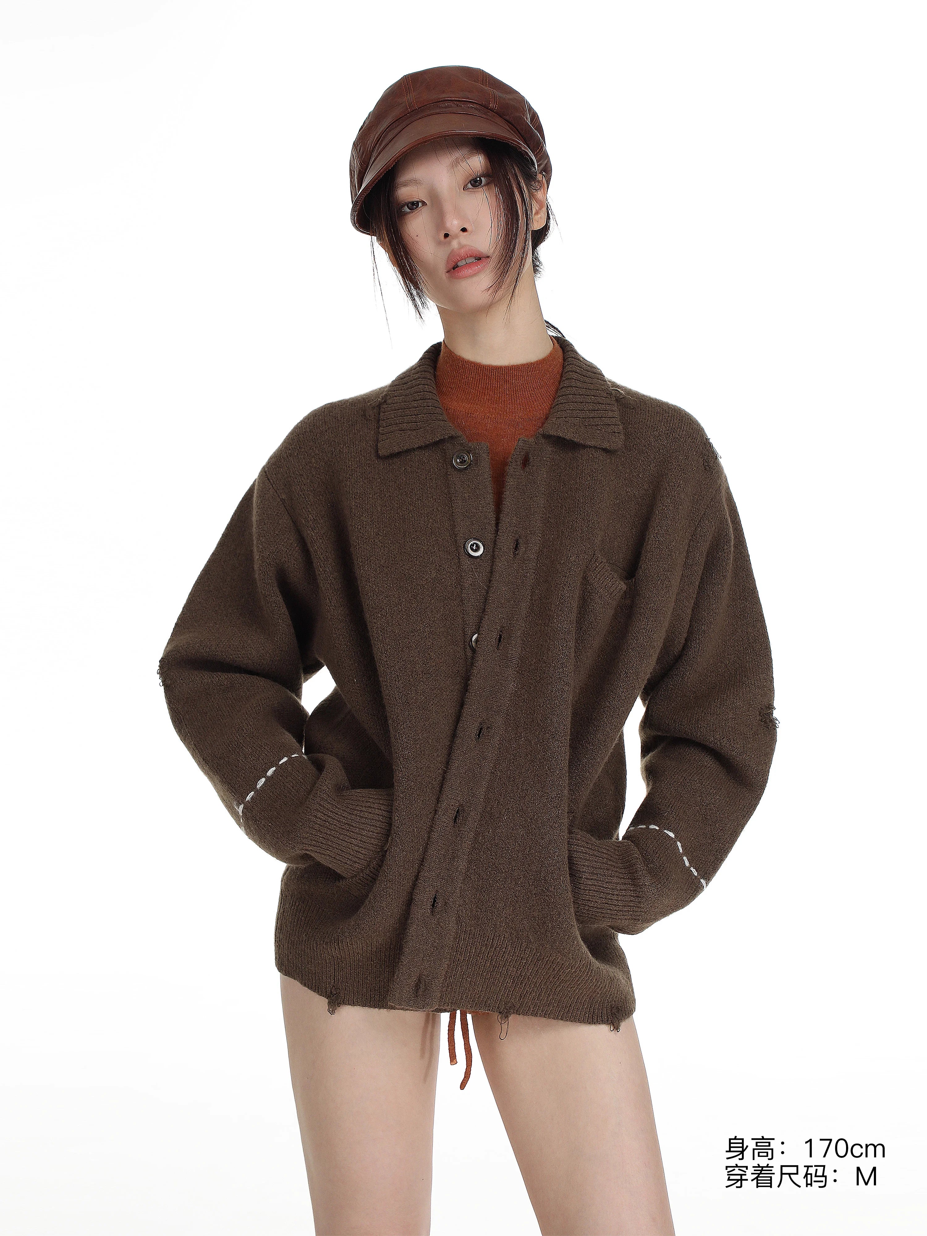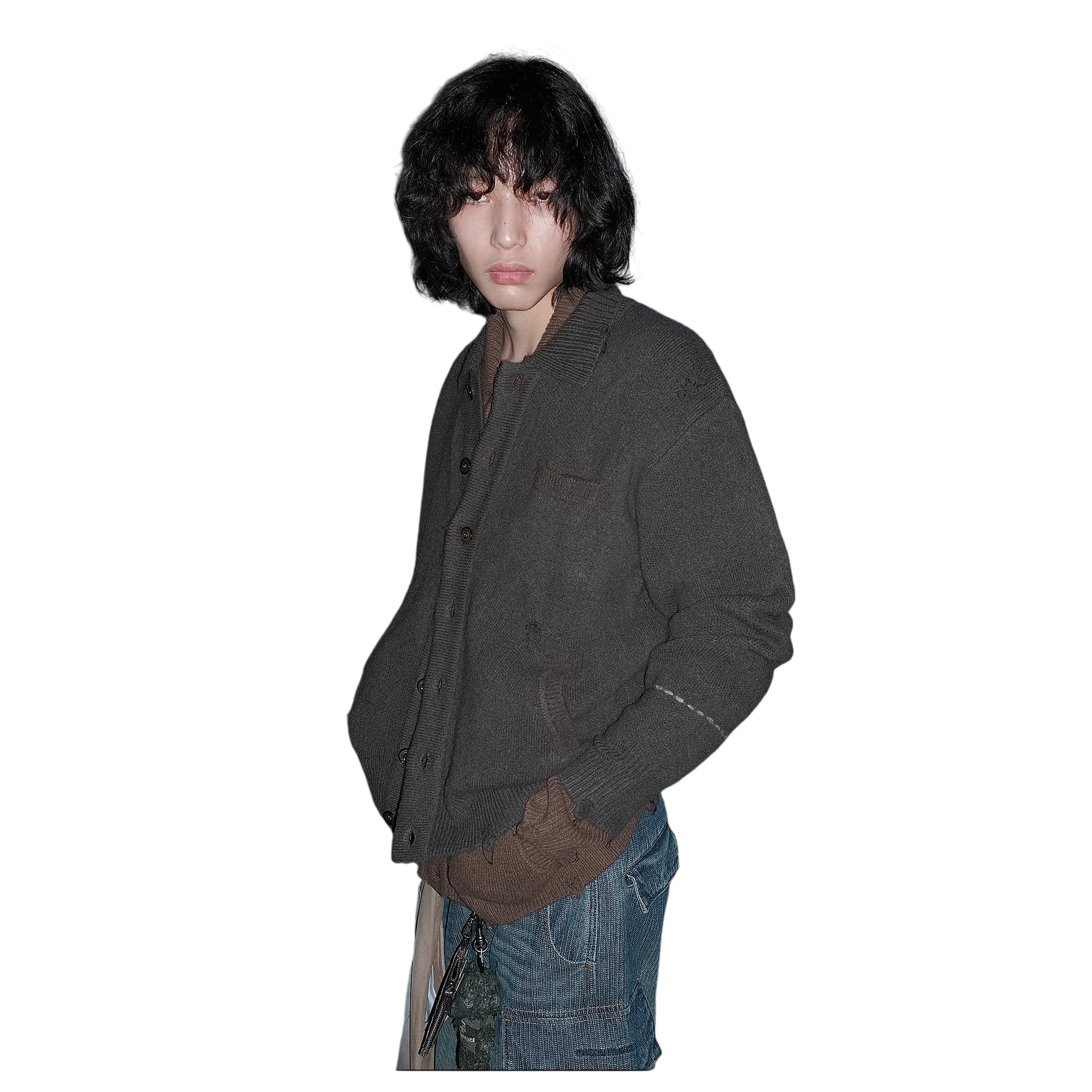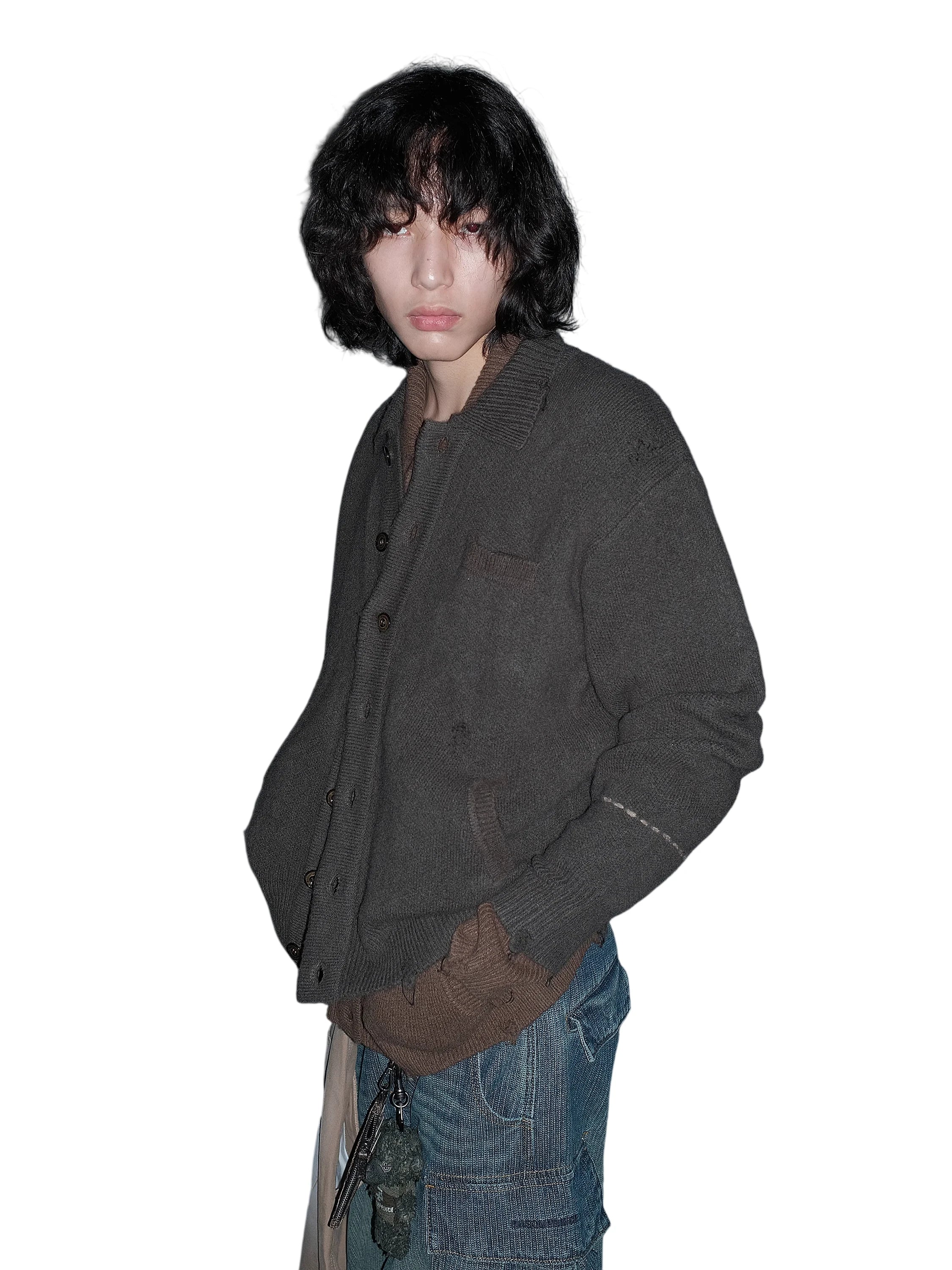This men's wool knit cardigan features a relaxed, oversized fit with a vintage-inspired design. Crafted with subtle distressing for added character, the dark gray cardigan includes a small chest pocket and two practical side pockets. Its button-up front and textured knit make it perfect for layering over casual outfits, while the visible sleeve cuffs and soft structure enhance its comfortable style. Ideal for those seeking a blend of rugged streetwear and timeless handmade appeal.