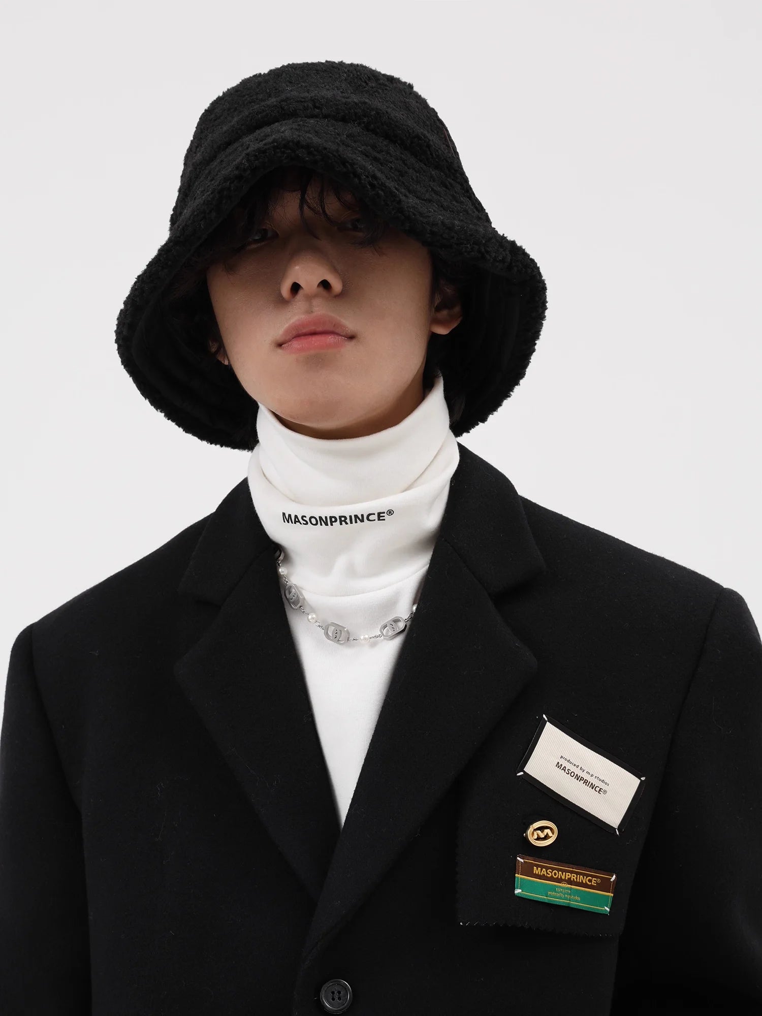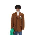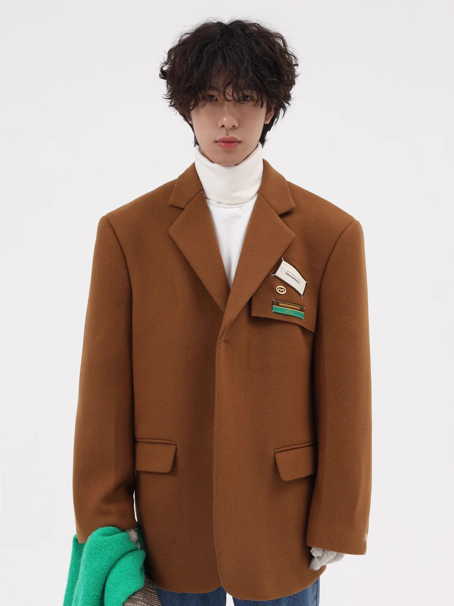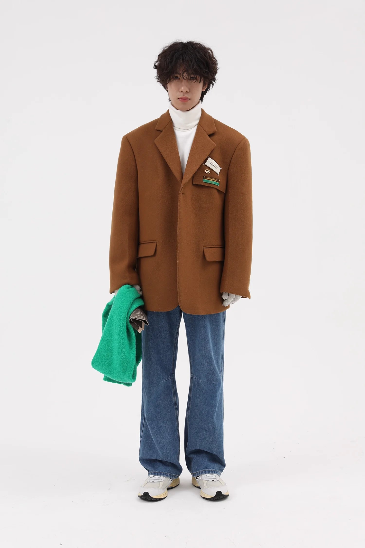 This men's retro-style blazer is designed with a structured, oversized fit ideal for spring and autumn seasons. Featuring a classic notched lapel collar and flap pockets on both sides, it combines timeless tailoring with modern flair. Decorative fabric swatches and label-style accents pinned on the chest add a creative twist, while the soft brown tone offers versatile styling options. Paired here with a white turtleneck and denim jeans, this jacket brings a magazine-inspired aesthetic to casual wardrobes.