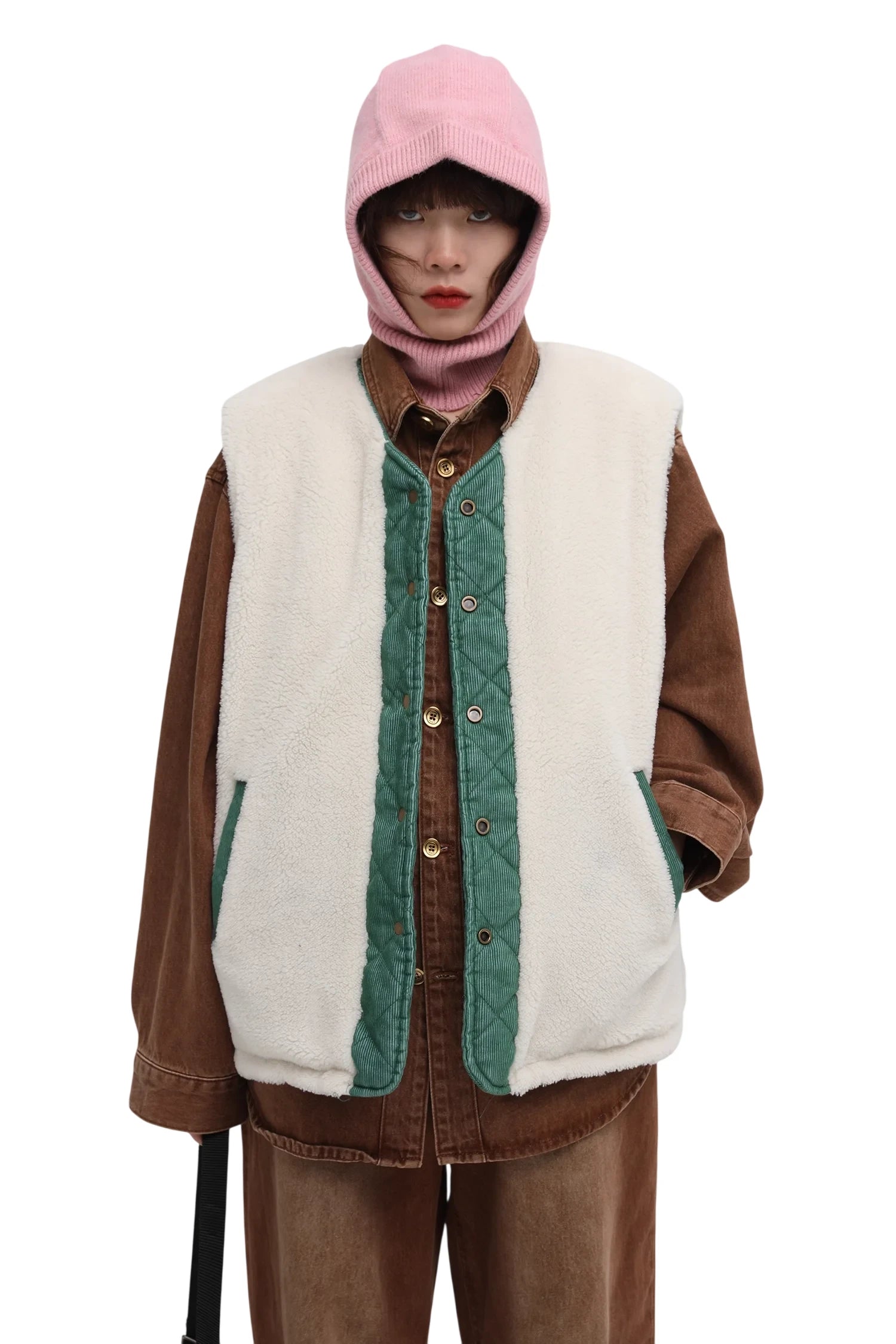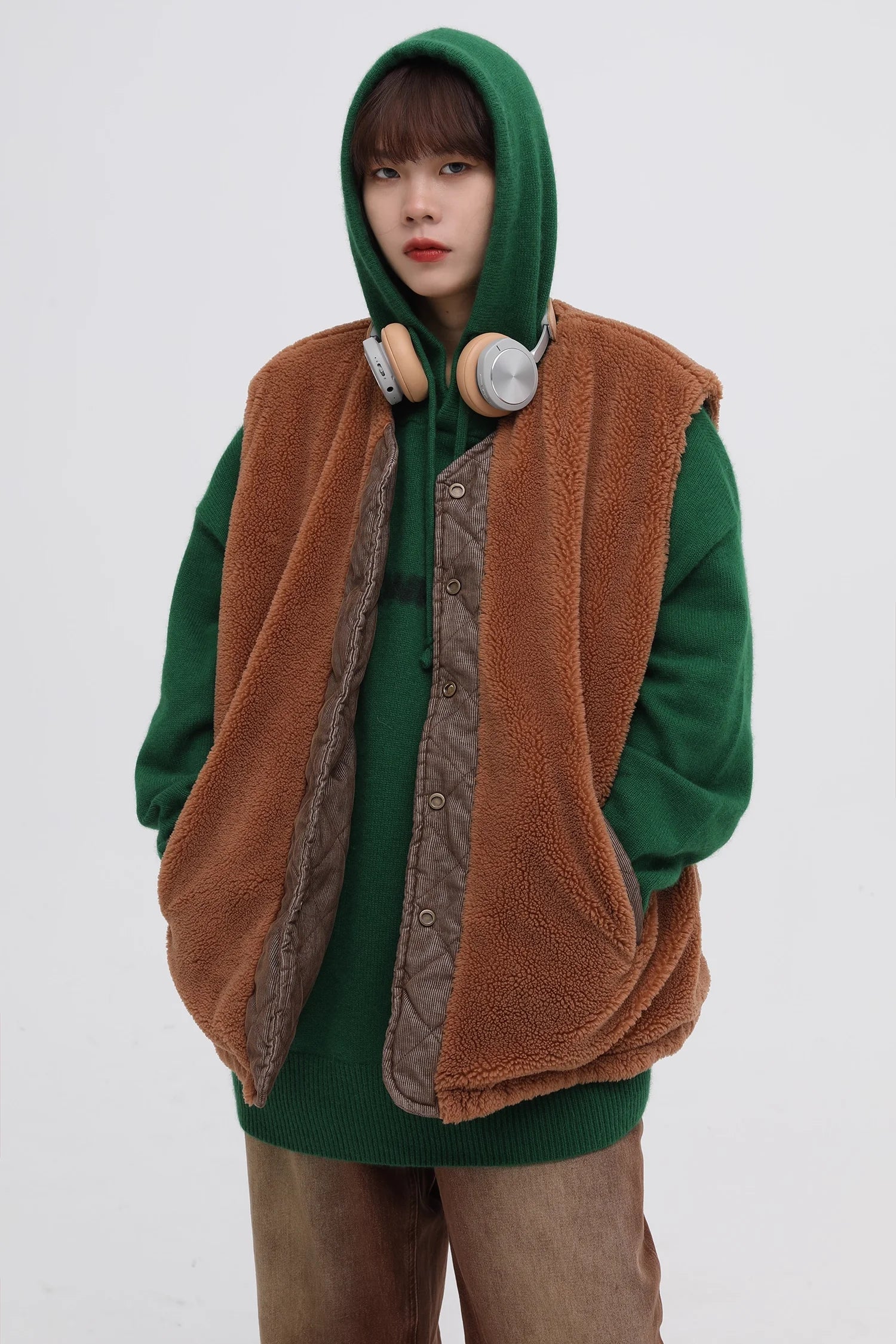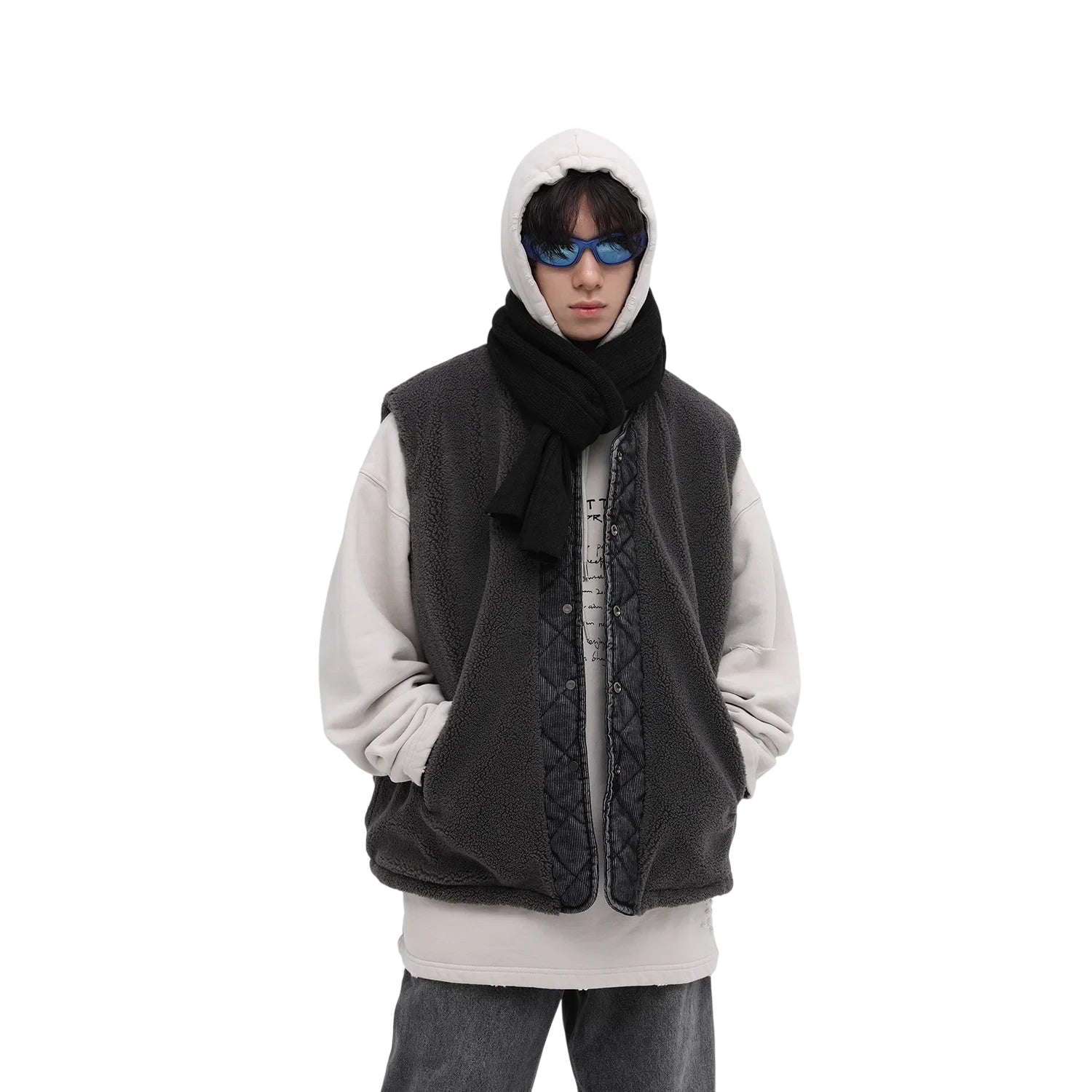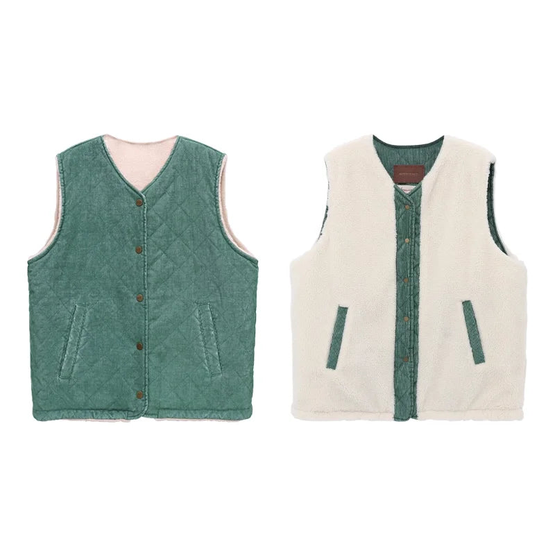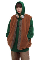 Stay warm and stylish with this men's reversible winter vest, featuring a thick lamb fleece exterior and soft corduroy detailing. Designed for versatility and comfort, this sleeveless outerwear piece adds modern edge to any cold-weather outfit. The roomy fit allows for easy layering over hoodies and sweatshirts, while the reversible design gives you two looks in one. Ideal for casual streetwear or rugged winter layering.