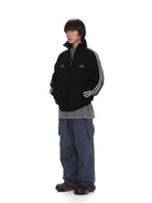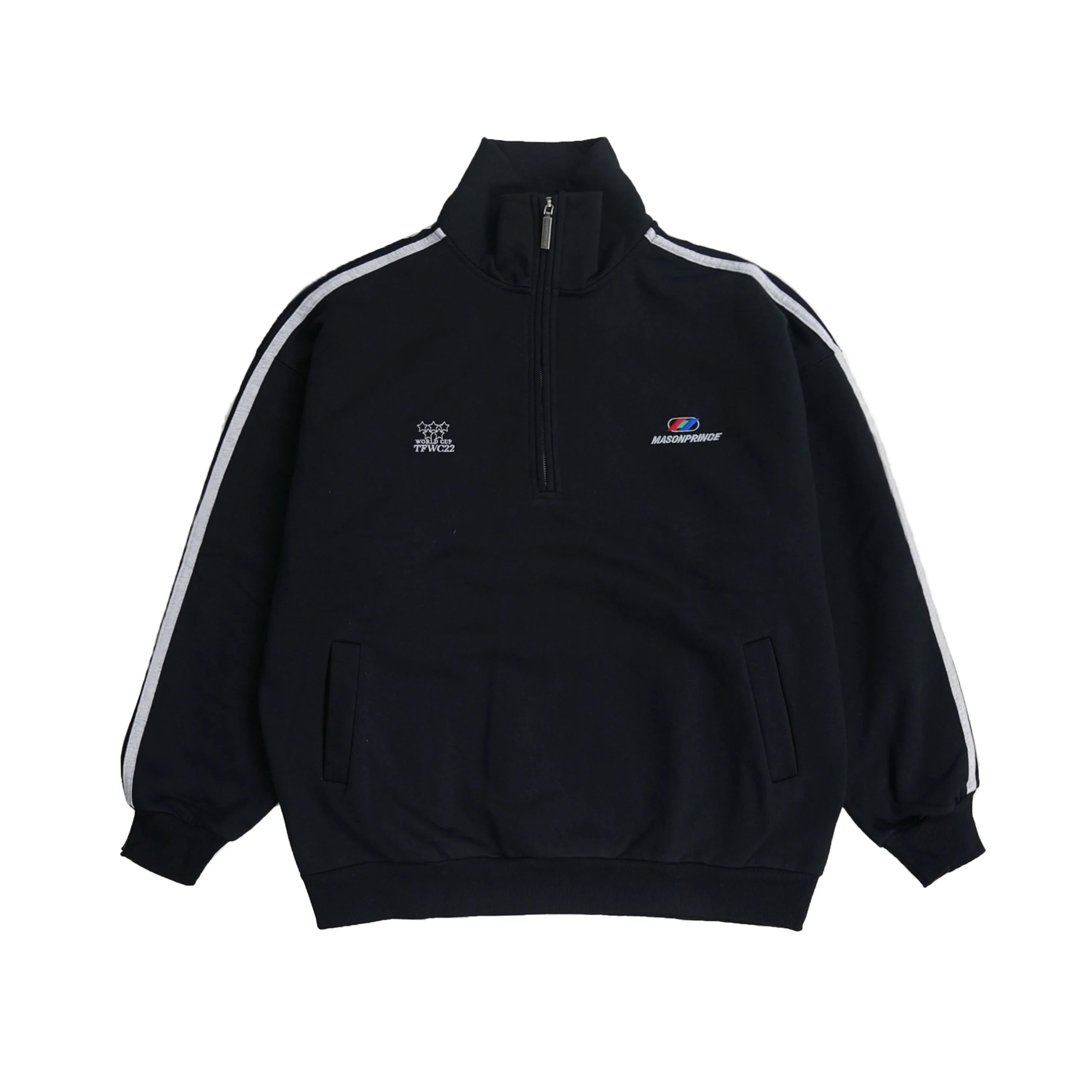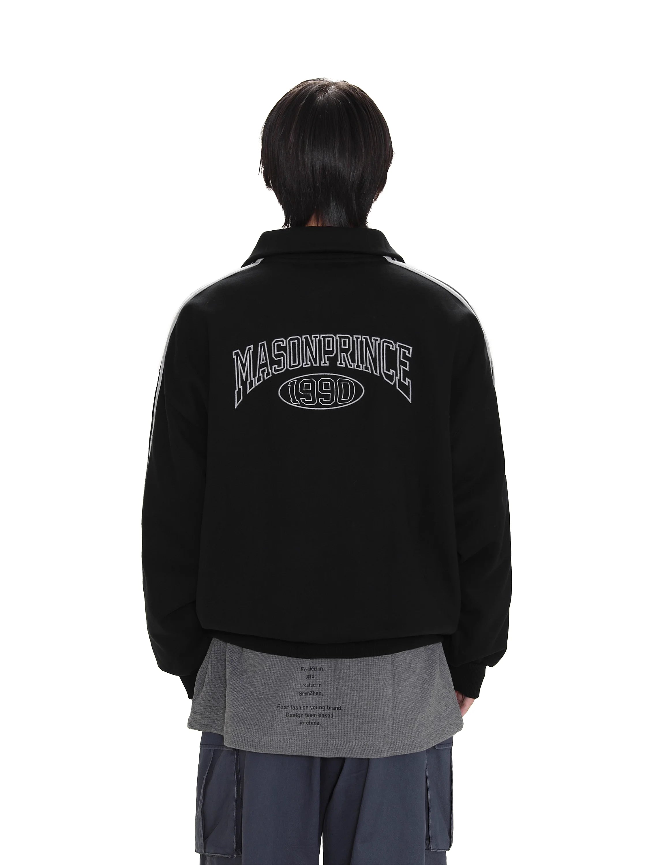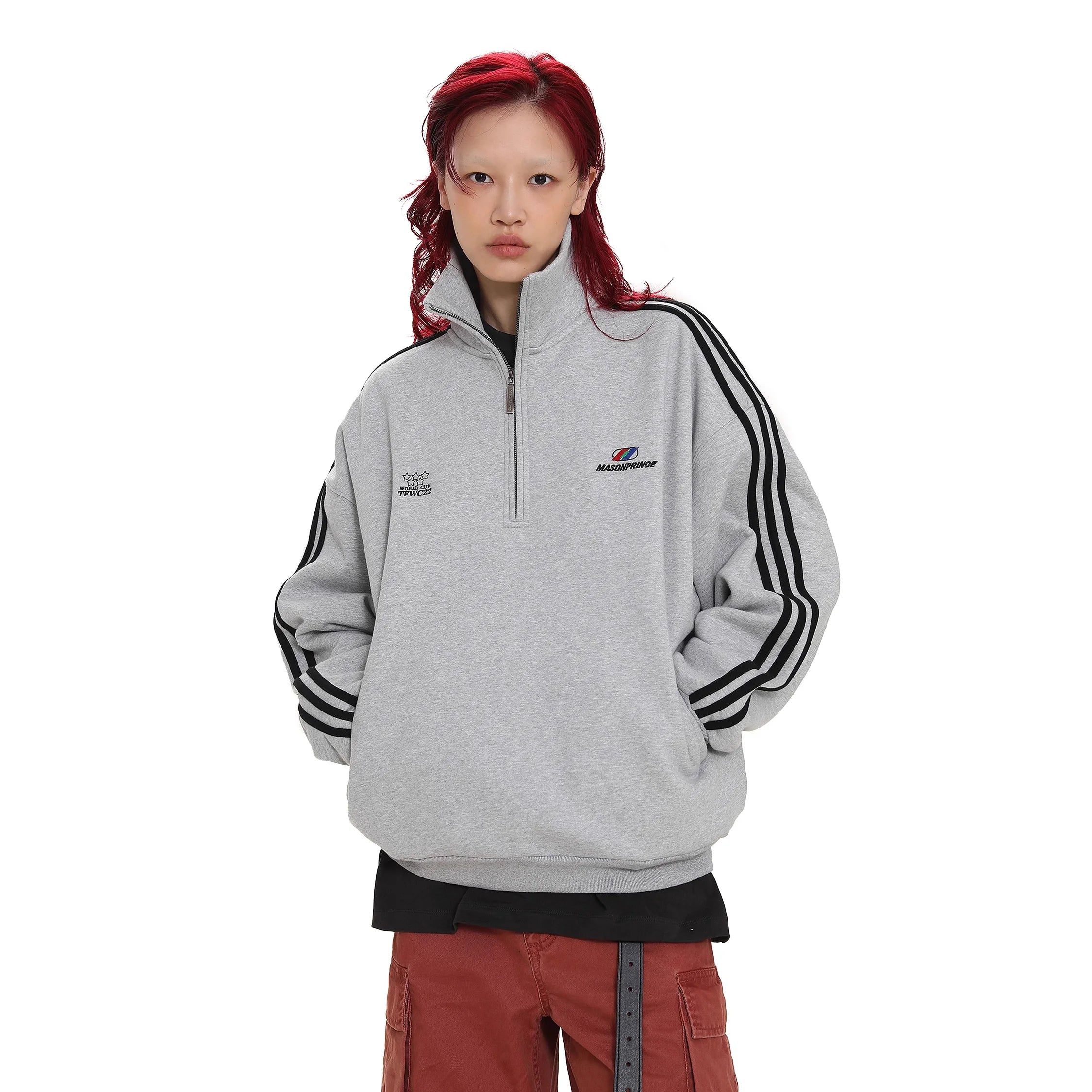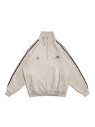 Stay effortlessly stylish in this men's casual pullover sweatshirt, designed with a modern stand collar and a functional half-zip front. Perfect for spring and autumn, this loose fit top features bold black stripes running down each sleeve and multiple embroidered graphic accents on the chest for a streetwear-inspired look. Pair it with your favorite trousers or cargo pants for an easygoing, comfortable outfit.