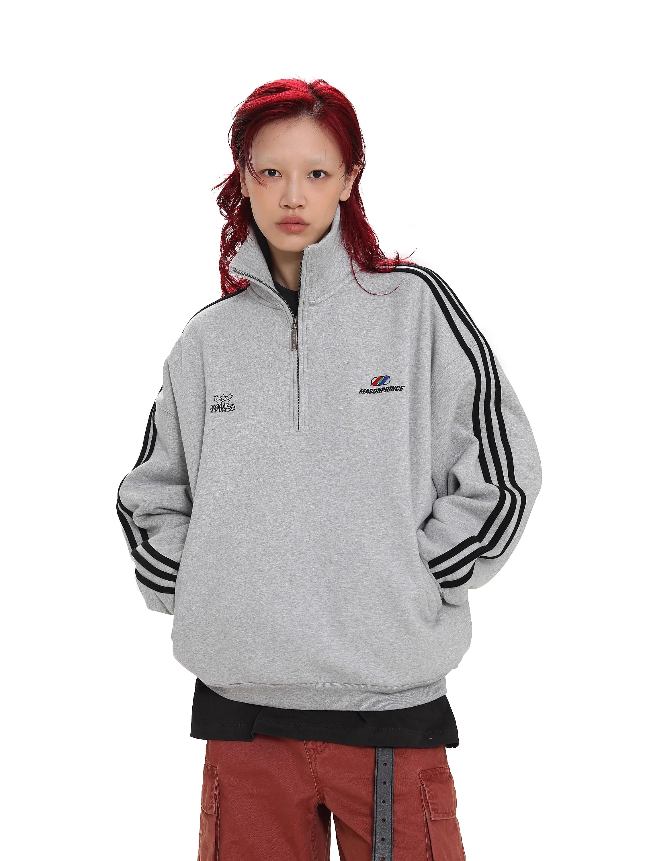MASONPRINCE Men's Stand Collar Pullover Sweatshirt with Stripe Sleeve Design