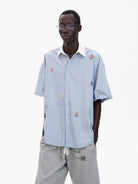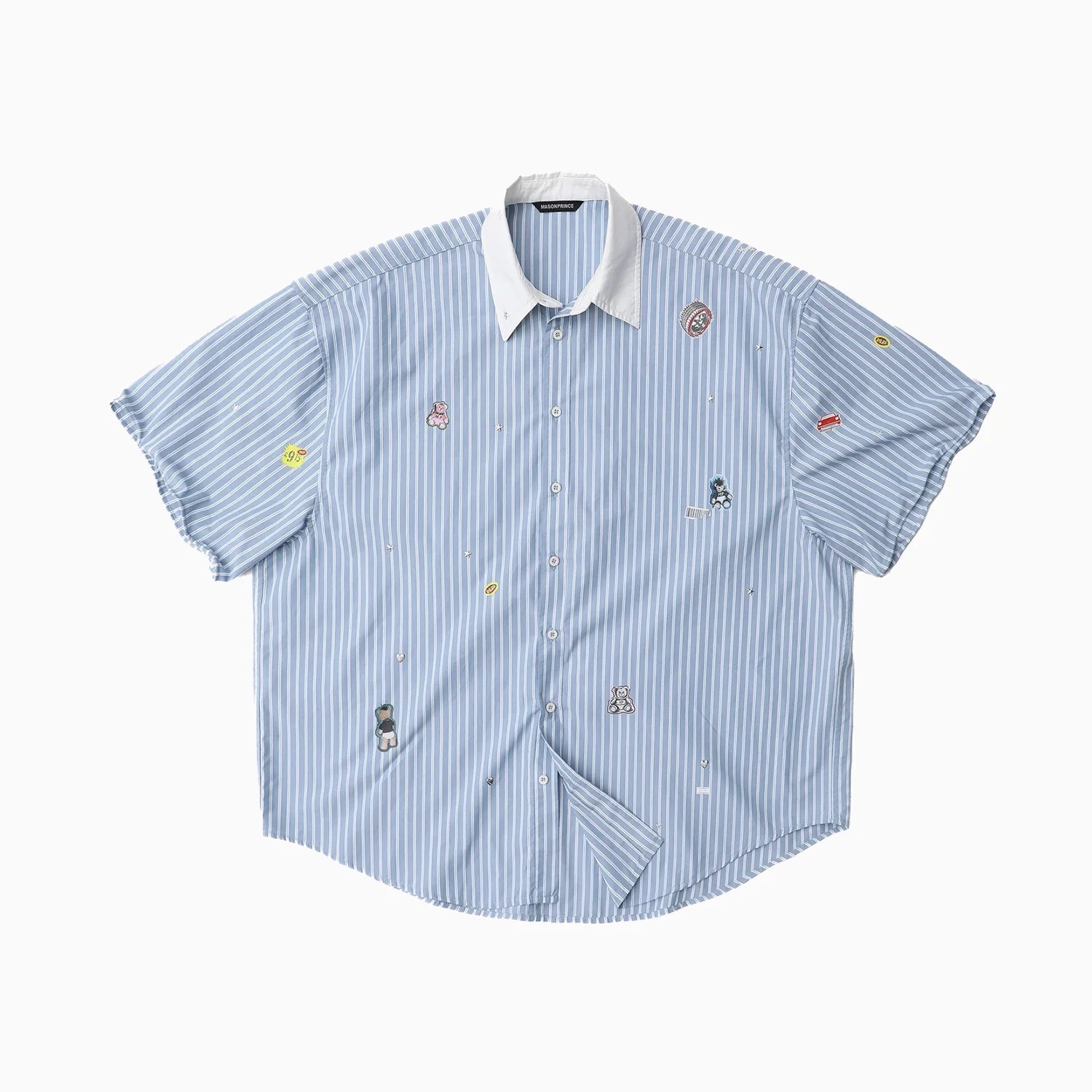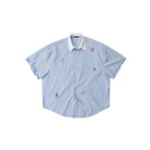 Add a touch of playfulness to your wardrobe with this men's short-sleeve shirt. Featuring light blue and white vertical pinstripes, this shirt brings a fresh and casual look complemented by a crisp white collar. Colorful, cartoon-style embroidered patches scattered across the front add a fun and quirky vibe. Made from lightweight cotton, it's perfect for relaxed, warm-weather outings.