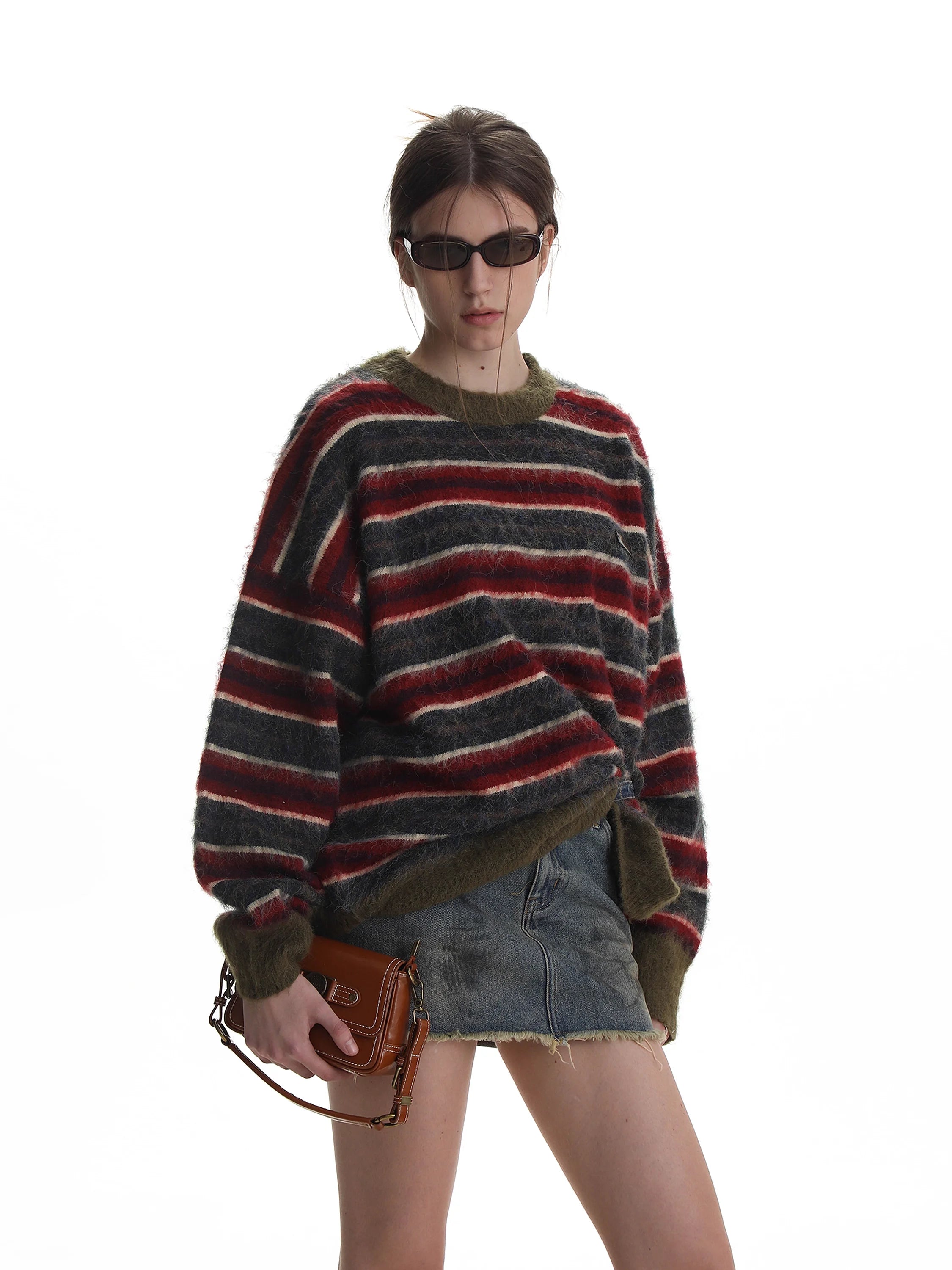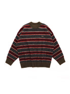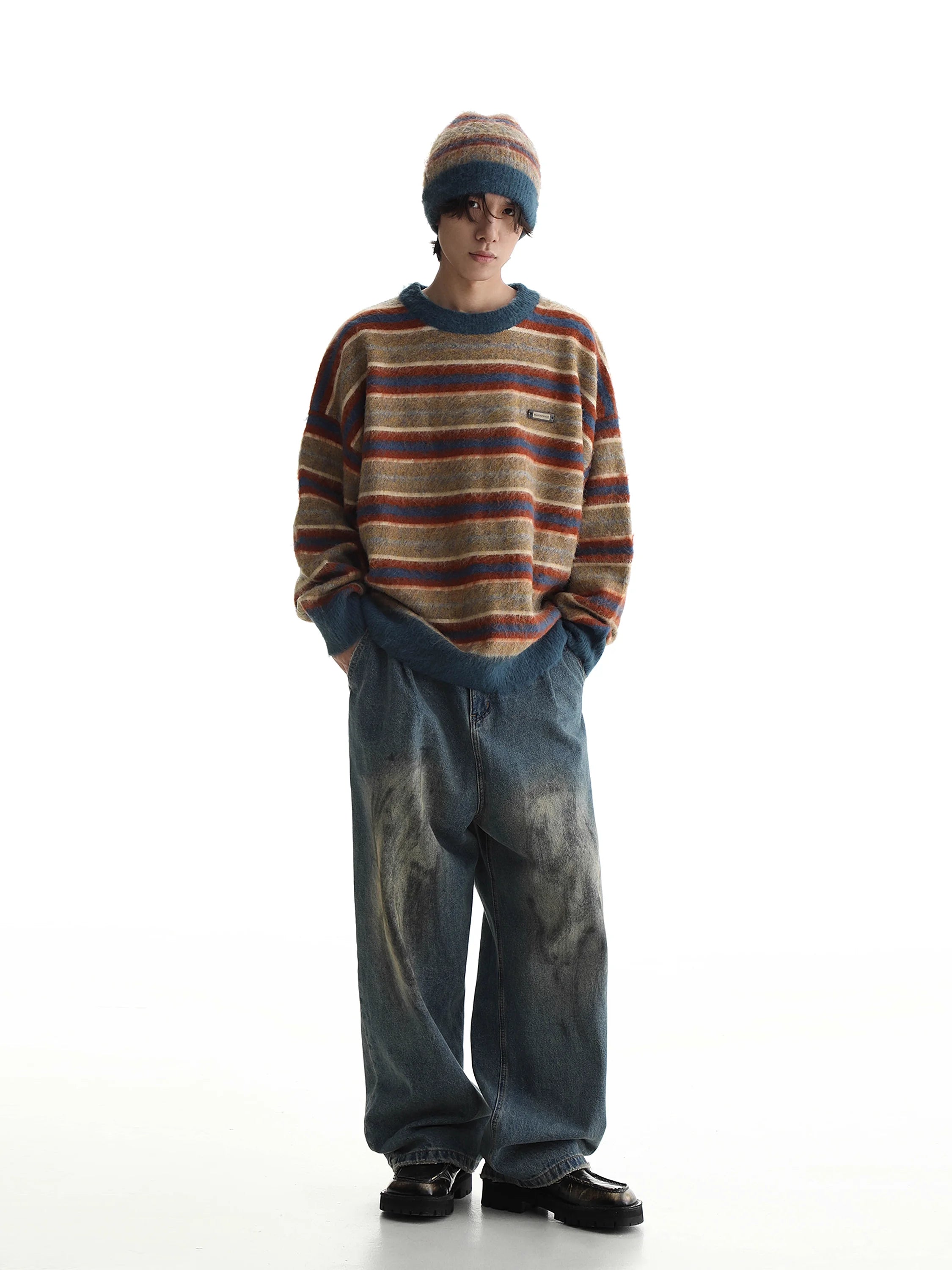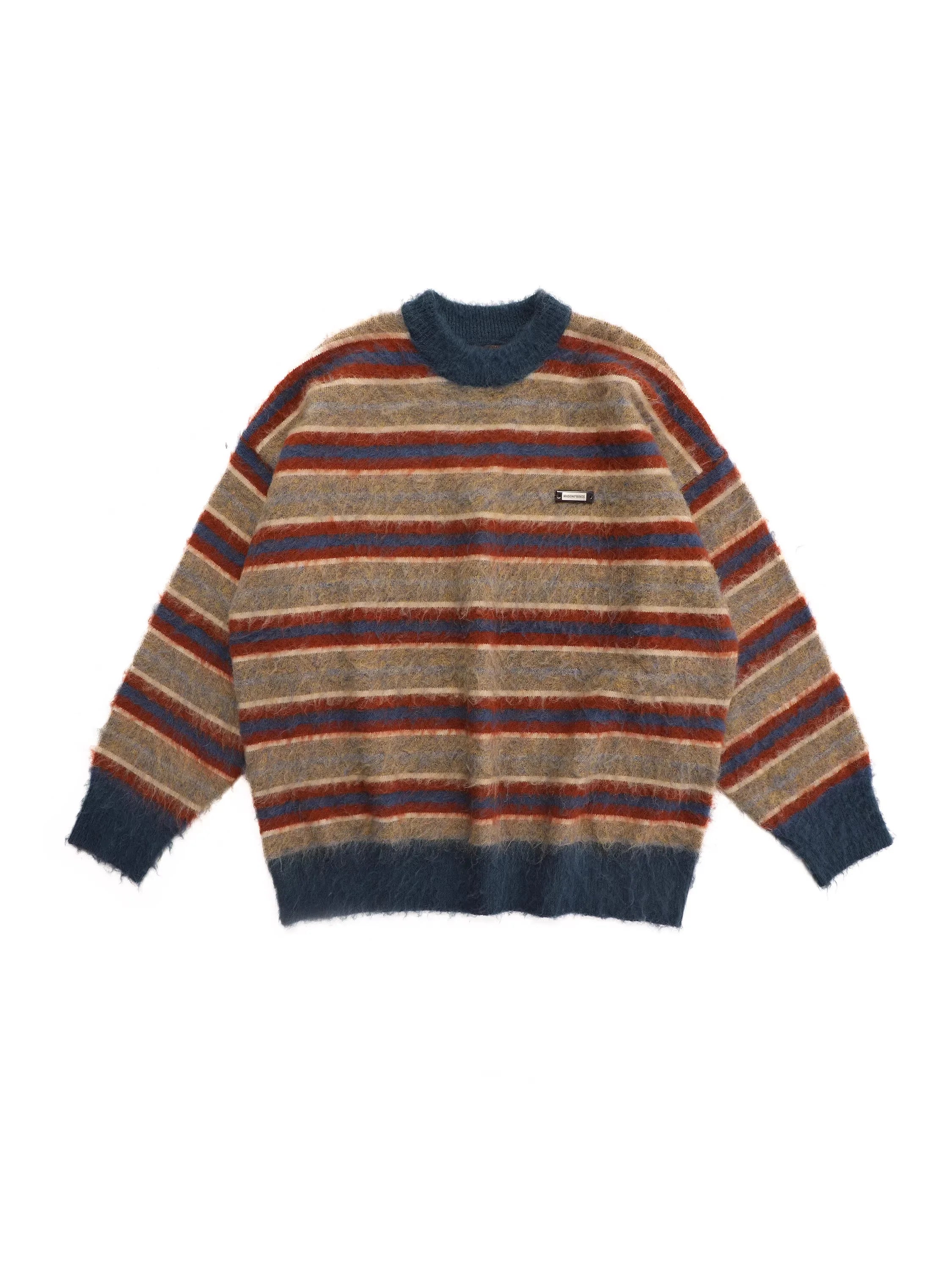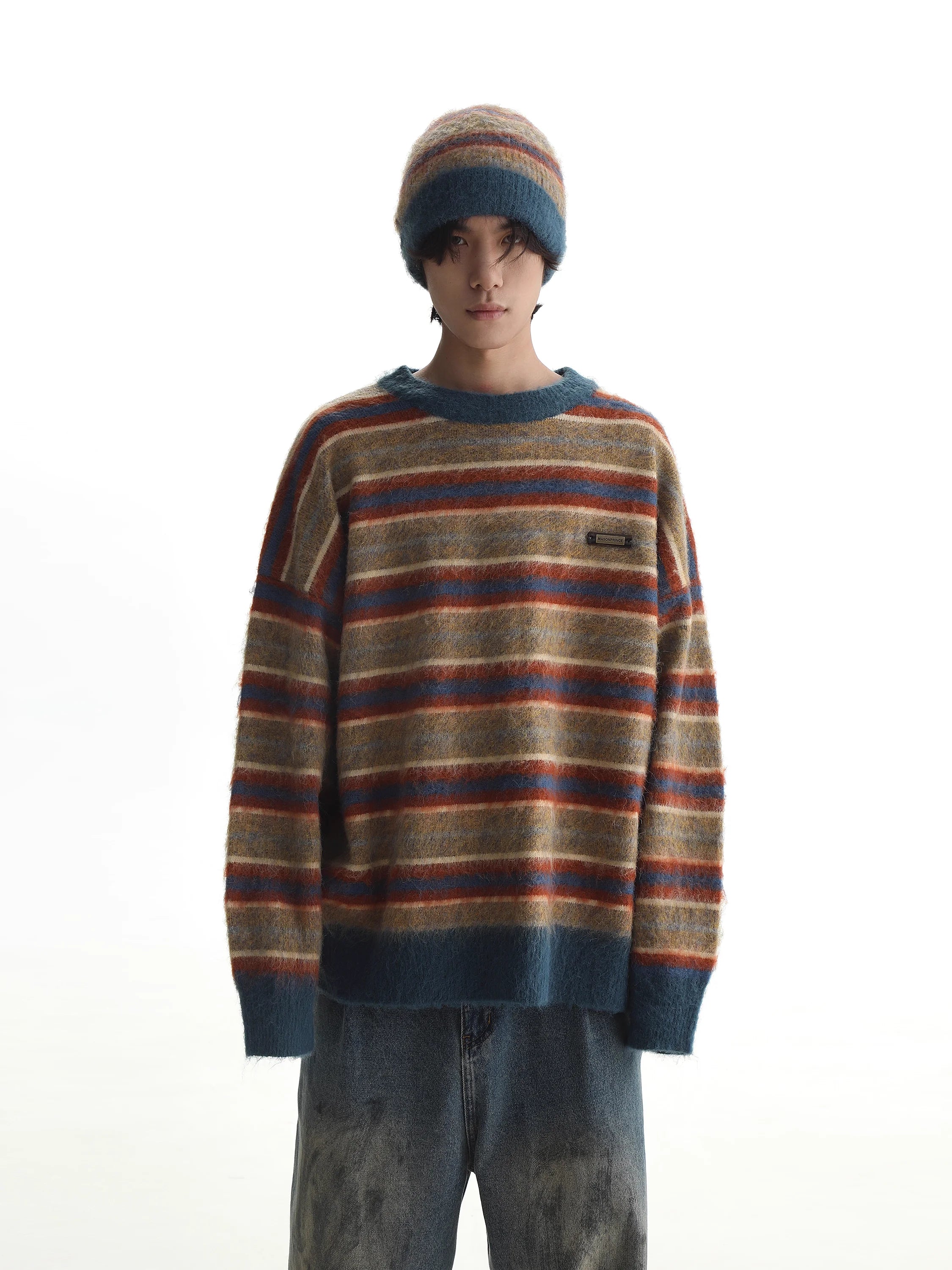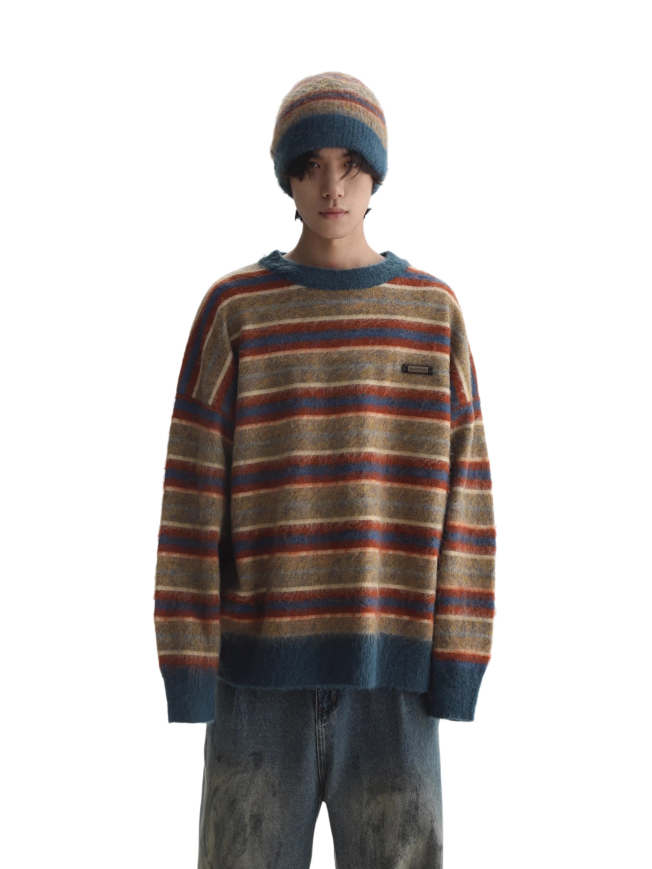 Stay warm and stylish in this relaxed-fit pullover sweater for men, featuring bold horizontal stripes in autumn-inspired shades of brown, orange, beige, and dark teal. Crafted from cozy knit fabric, this oversized sweater includes distressed frayed details at the neckline and cuffs for a vintage-inspired look. Solid dark teal trim at the hem and wrists adds contrast and structure. A small stitched logo patch on the chest adds subtle flair, making it ideal for casual, laid-back outfits.