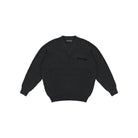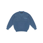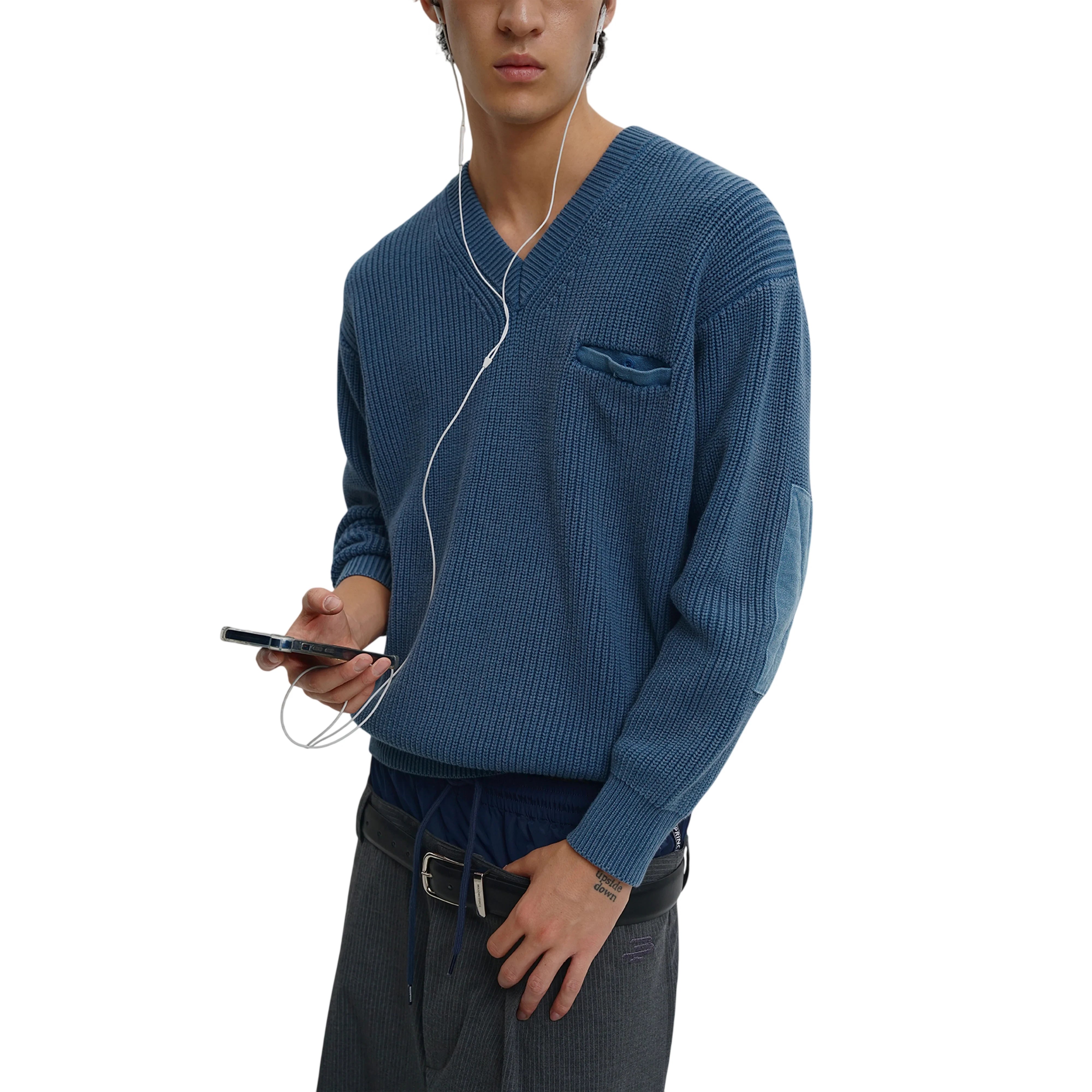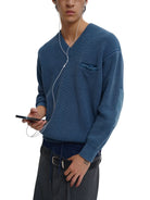 This men's V-neck sweater features a chunky ribbed knit texture in a muted blue shade, offering comfort and style for cooler seasons. Designed with a classic standard fit, it includes distinct fabric elbow patches in a complementary hue for added durability and visual appeal. A subtle chest pocket lined with satin-like fabric adds a refined touch. Ideal for casual layers, this textured knit is perfect for a polished autumn look.