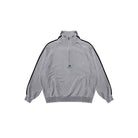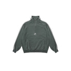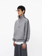 This men's vintage-style half-zip sweatshirt comes in a rich forest green tone, featuring a high collar with a silver zipper for classic sporty appeal. Designed with ribbed cuffs and hem for a snug and comfortable fit, it includes distinctive double white stripes along the sleeves and a printed chest logo for a touch of retro flair. Layered over a striped inner shirt, the sweatshirt offers a stylish and versatile look ideal for early autumn wear.