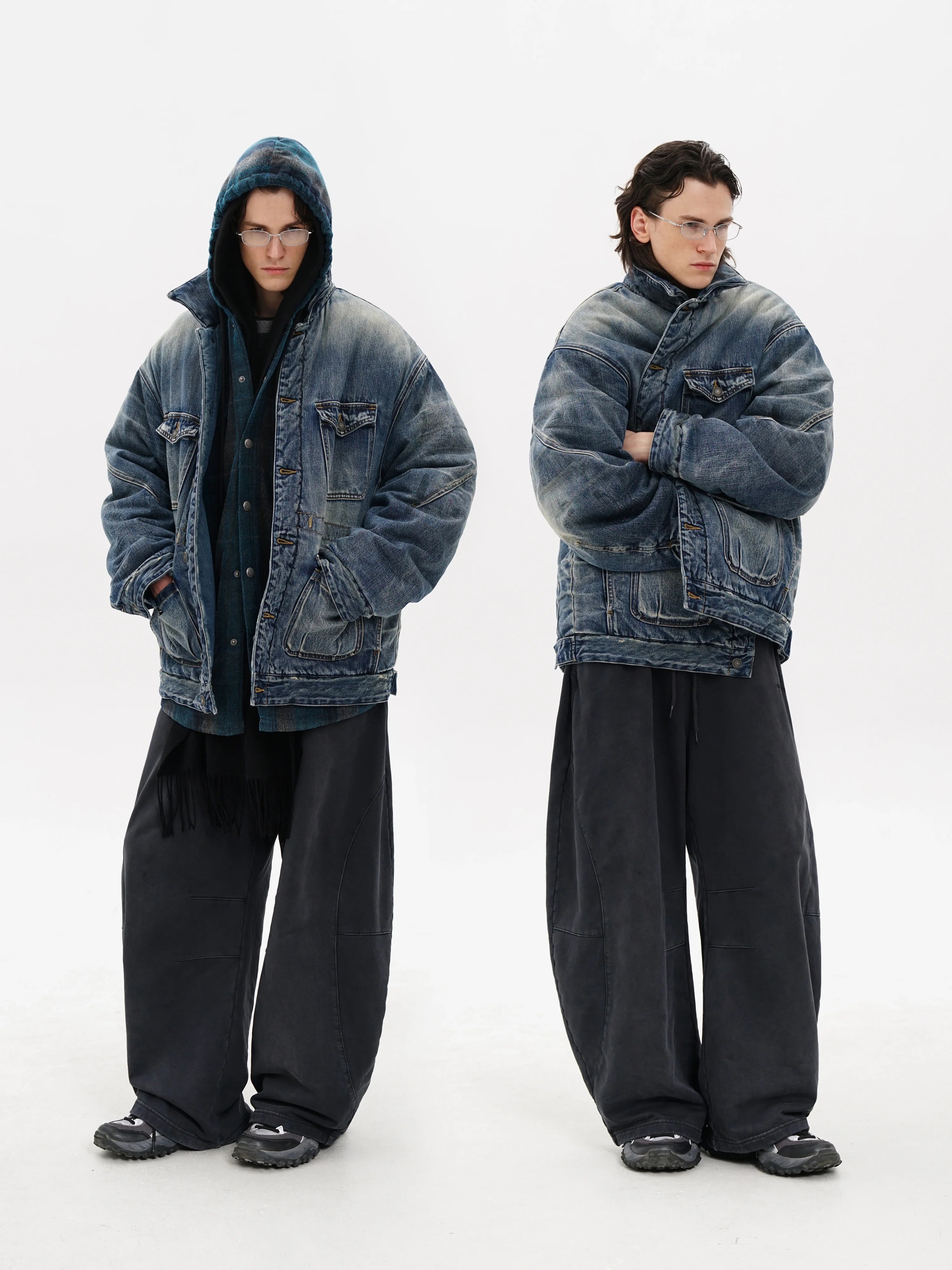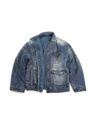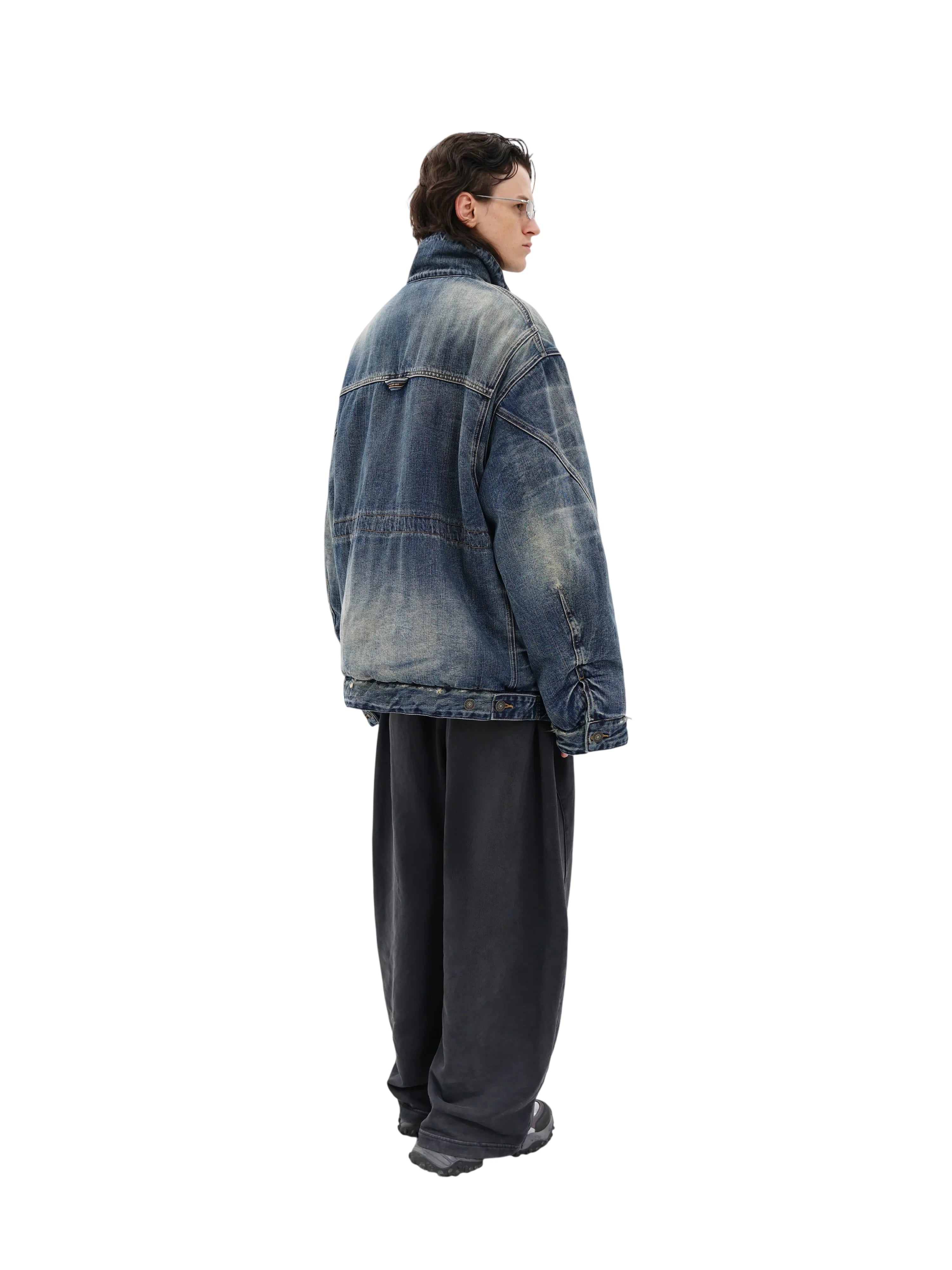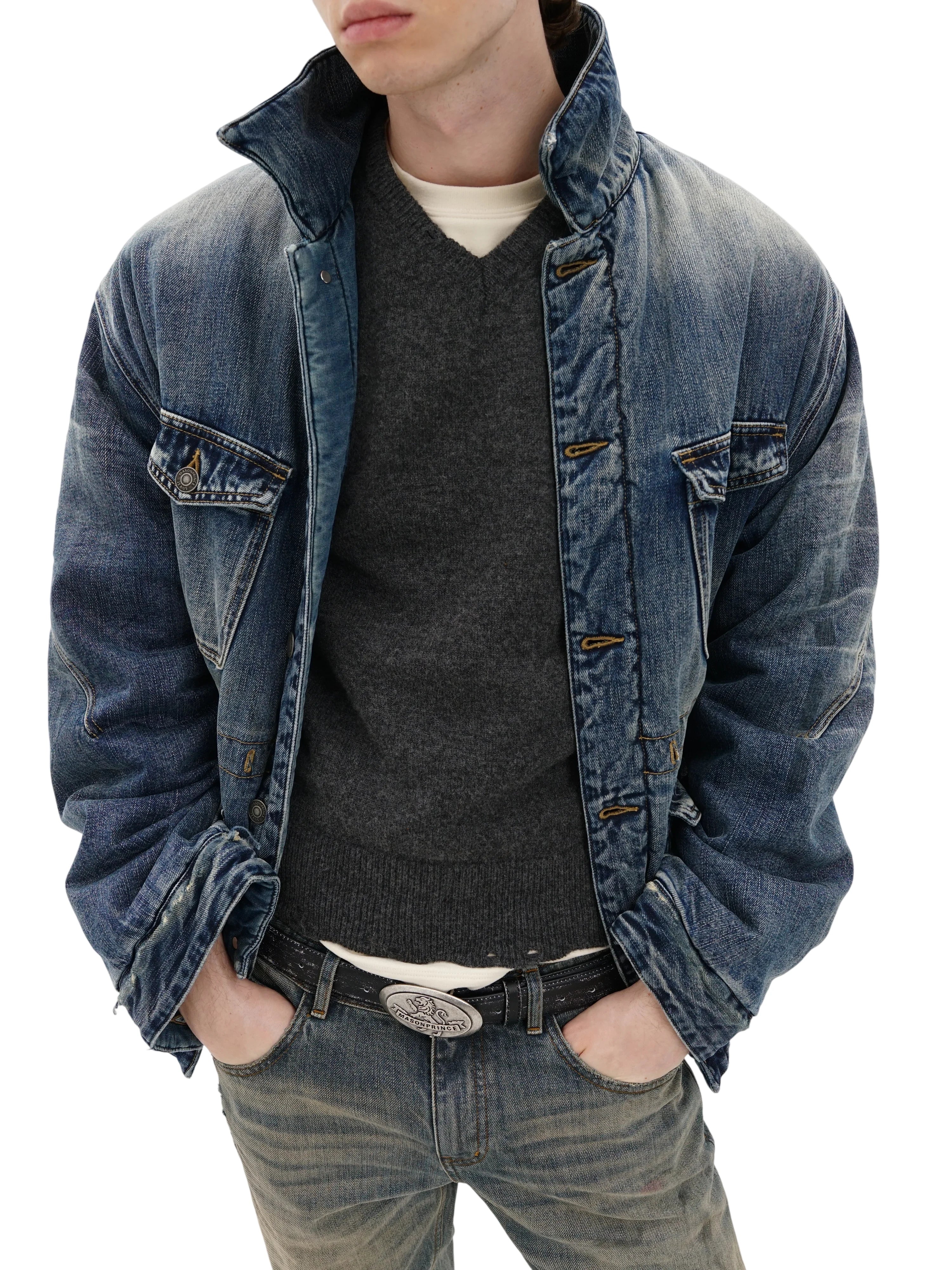 This men's mid-length denim jacket features a 70s-inspired vintage design with a heavy washed and faded blue finish. The rugged construction includes multiple front patch pockets with flap closures and visible stitch detailing. Slight distressing on the sleeves and pocket edges adds to its authentic, worn-in look. Complete with full-length sleeves, front button closures, and a soft inner lining, this padded jacket is ideal for casual or streetwear outfits.