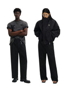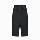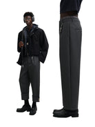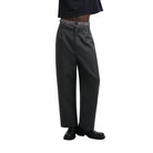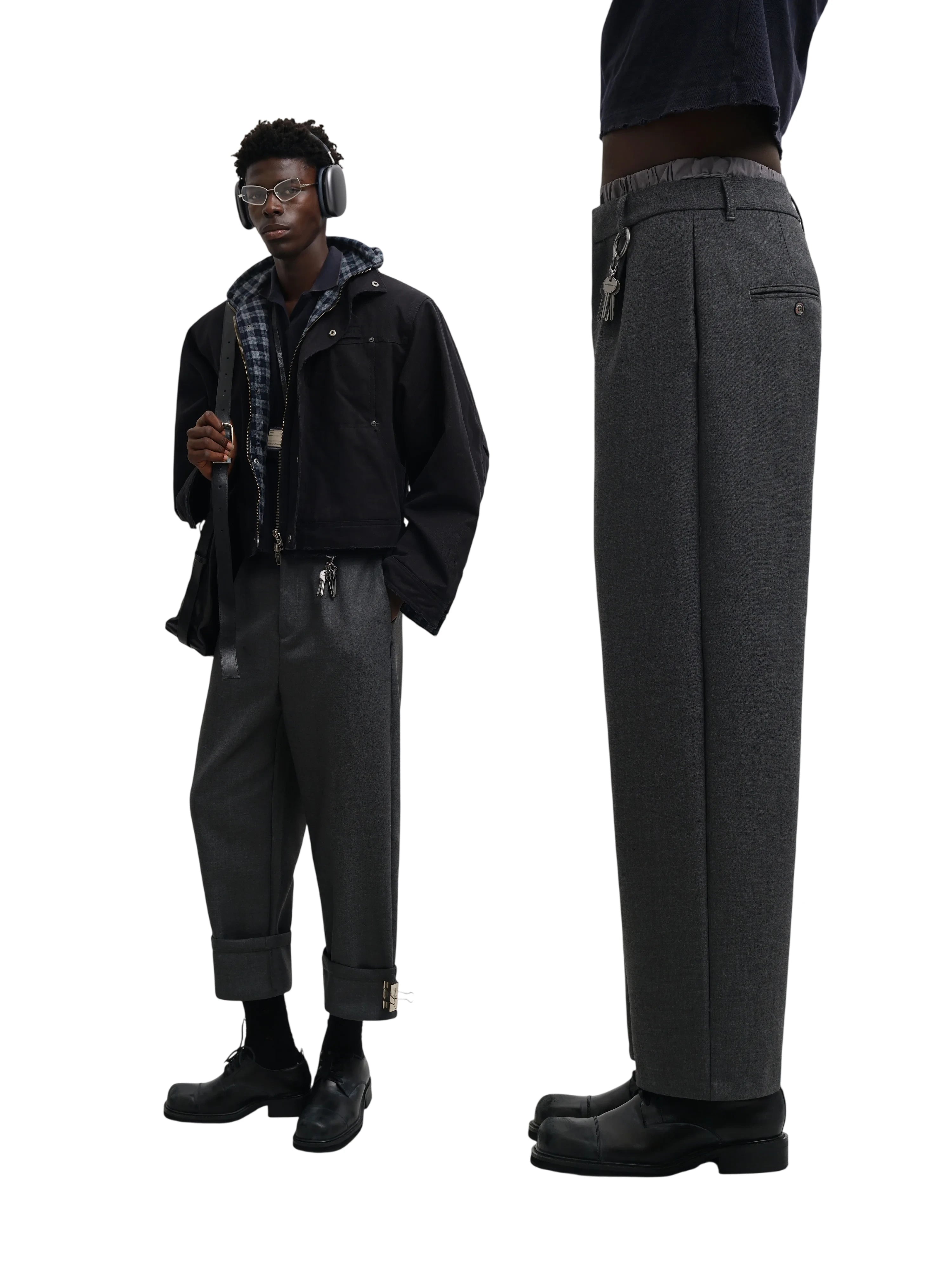 Upgrade your formalwear with these men's wide-leg dress pants, tailored from high-quality double-faced wool for a structured yet comfortable fit. Featuring clean front pleats and a relaxed silhouette, these charcoal grey trousers combine classic appeal with a modern edge. A distinctive keychain accessory adds a subtle streetwear-inspired flair, making these pants ideal for both professional and elevated casual looks.