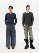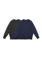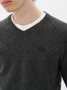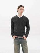 This men's V-neck sweater combines timeless style with a contemporary edge. Crafted from warm wool, it features a relaxed fit and a subtly distressed hemline for a worn-in look. Ribbed cuffs and hem provide structure and comfort, while the deep charcoal gray and navy blue color options offer versatile styling for casual or semi-formal occasions.