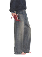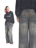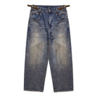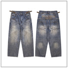 Embrace retro-inspired style with these men's Y2K distressed baggy jeans, designed with a casual millennial edge. Featuring a classic five-pocket construction, these jeans have a wide-leg cut and a slightly faded blue wash for a vintage look. Adjustable side buckle straps at the waistband ensure a customizable fit, while bold back embroidery adds standout streetwear appeal. Perfect for everyday wear or making a stylish statement.
