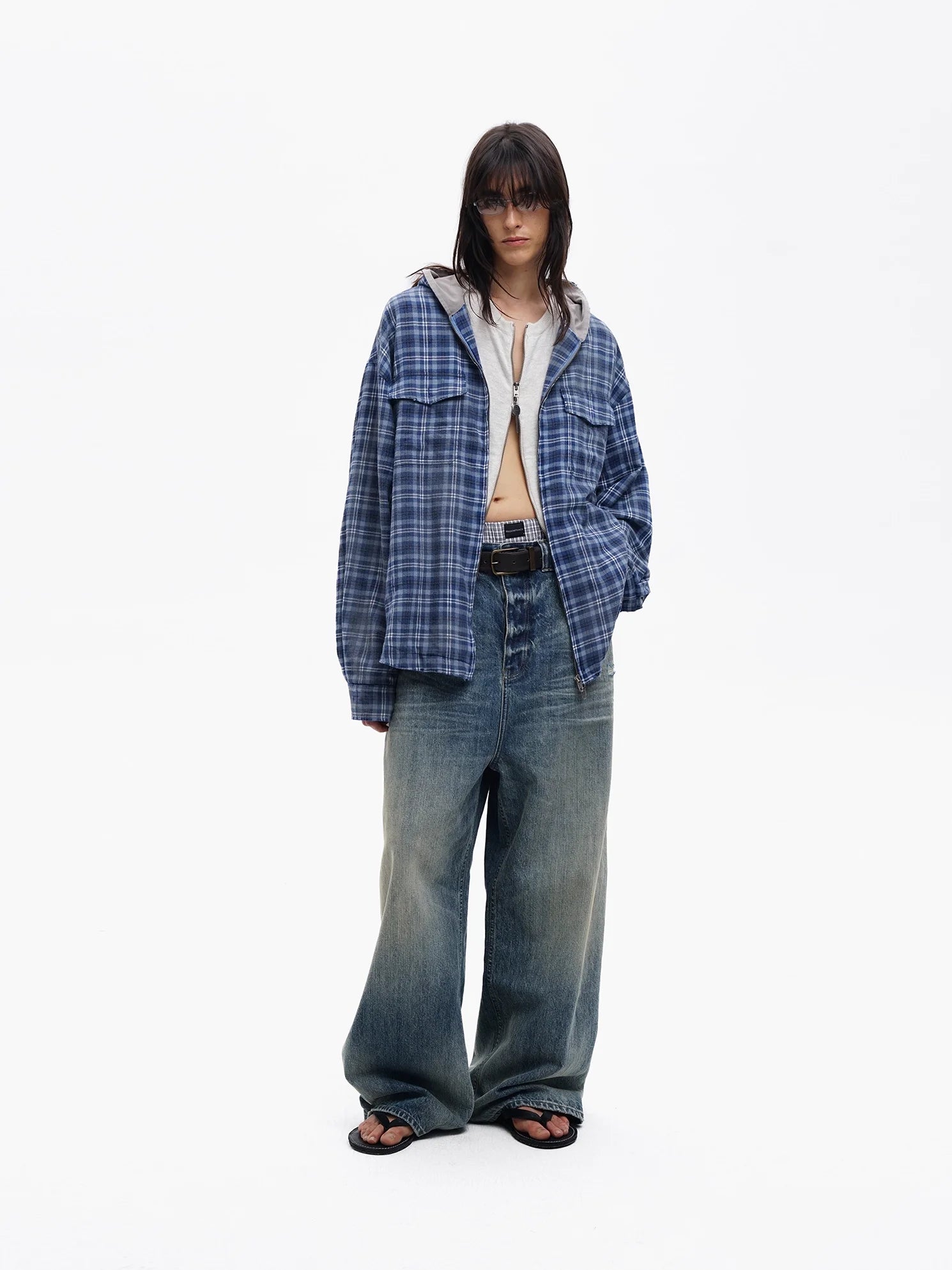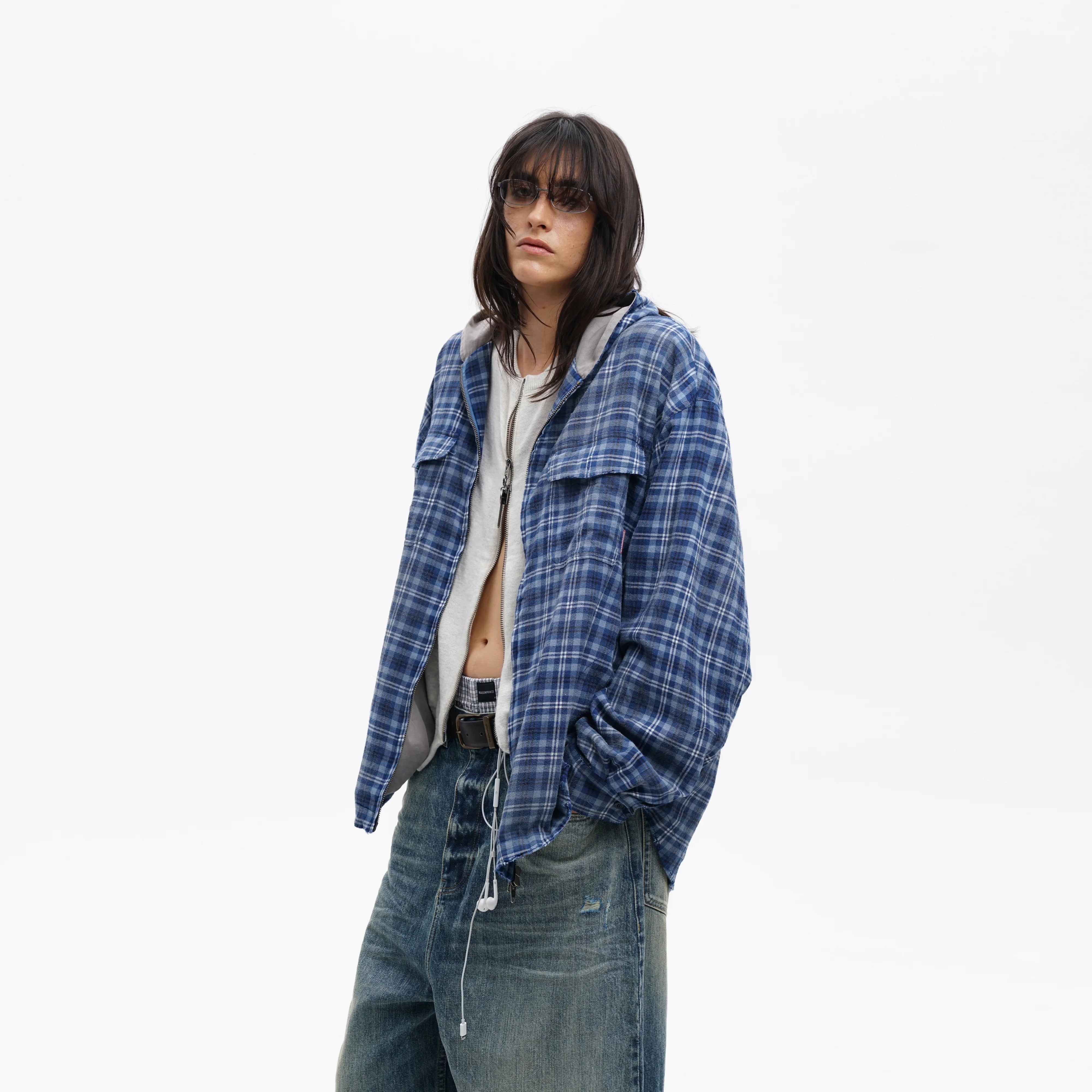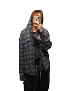 Elevate your streetwear with this men's navy plaid shirt jacket, featuring a faded washed cotton finish for a worn-in feel. Designed with a modern grunge edge, it includes a zip-up front with additional button closure, dual flap chest pockets, and an attached hood layered over a light gray hoodie style. Perfect for a laid-back yet stylish look, this shirt jacket pairs seamlessly with distressed denim and casual basics.