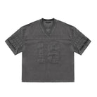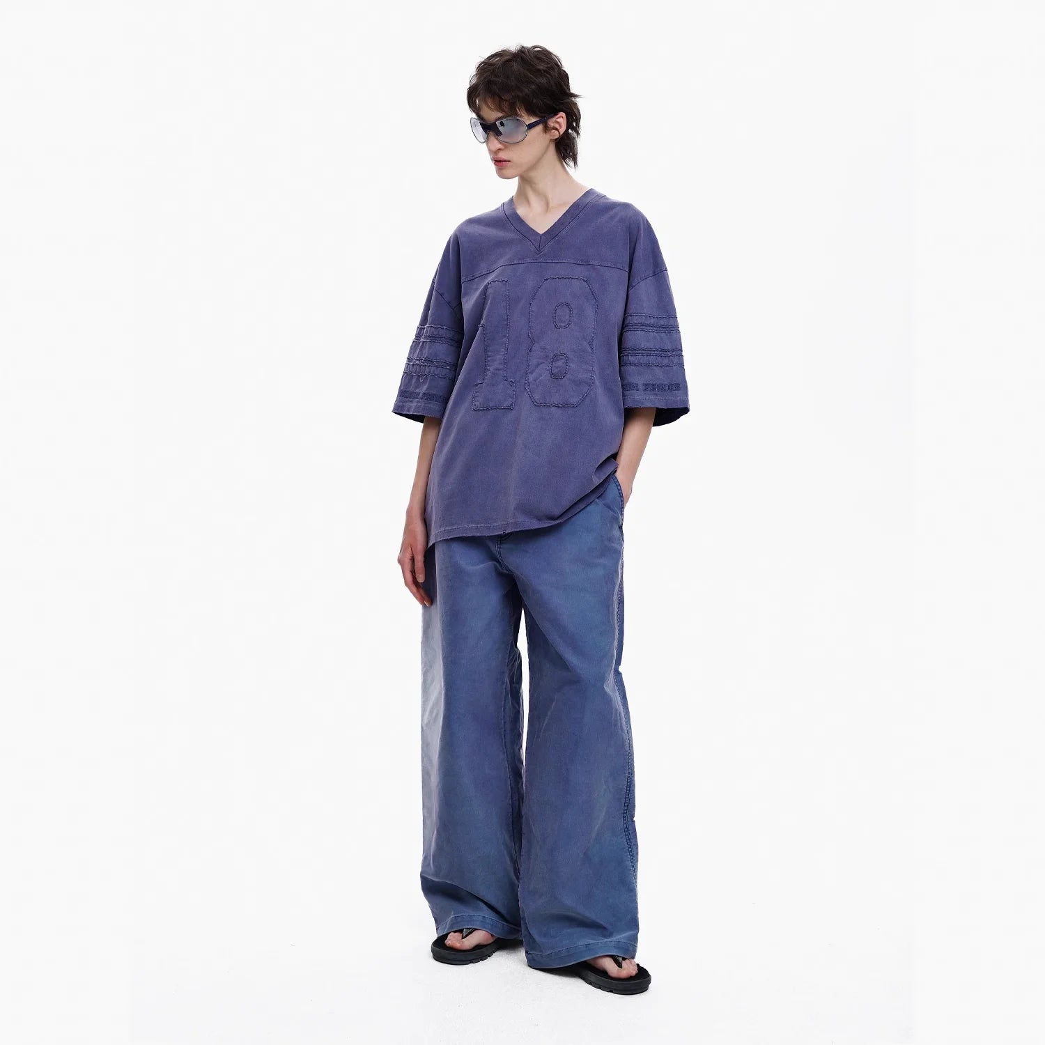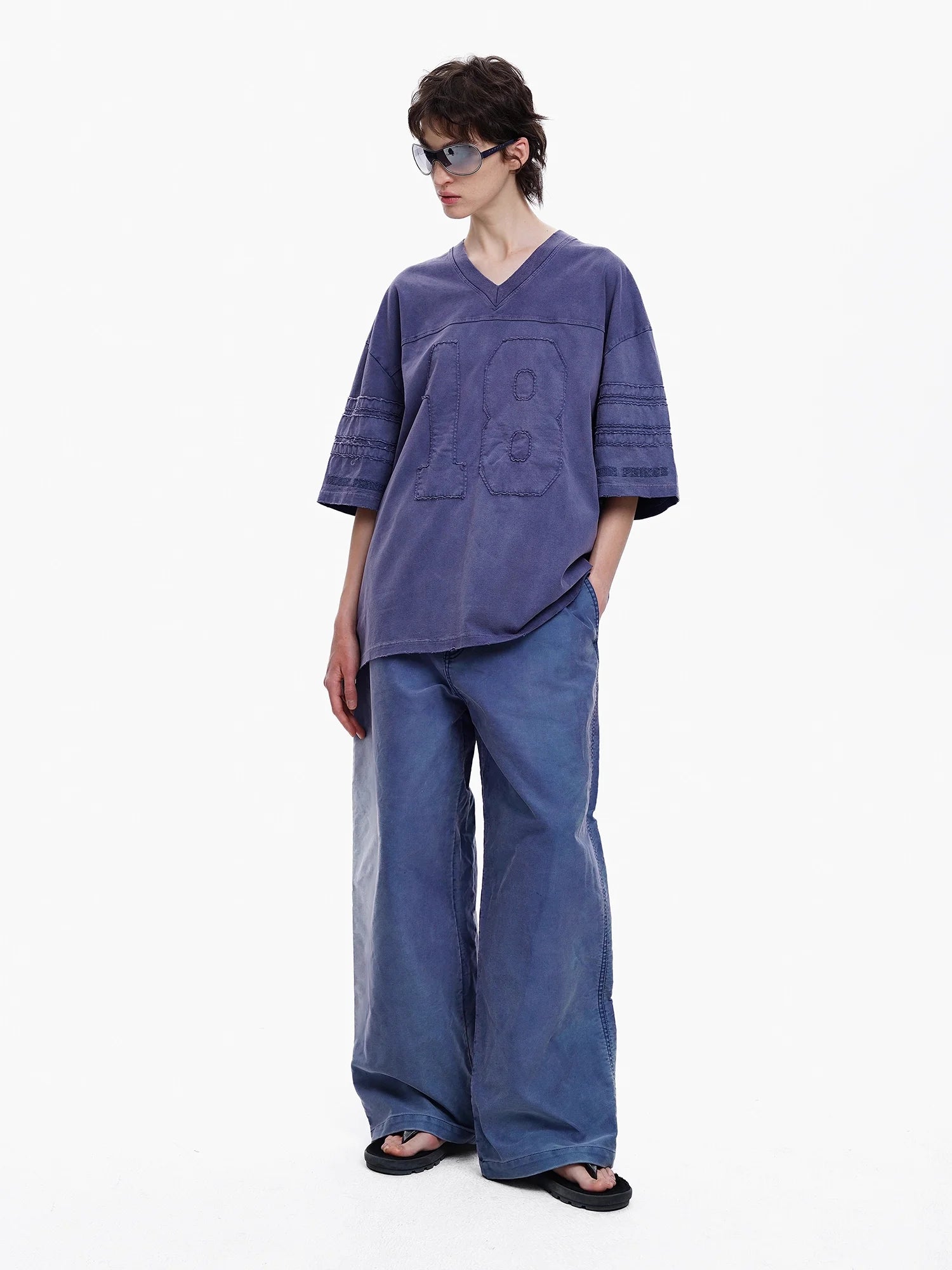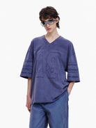 This men’s vintage-style V-neck jersey features an oversized fit and a bold textured “18” front graphic. The purple jersey includes striped sleeve details that enhance its retro aesthetic, making it a standout piece for casual or streetwear outfits. Designed for comfort and style, it's paired perfectly with wide-leg pants or relaxed bottoms.