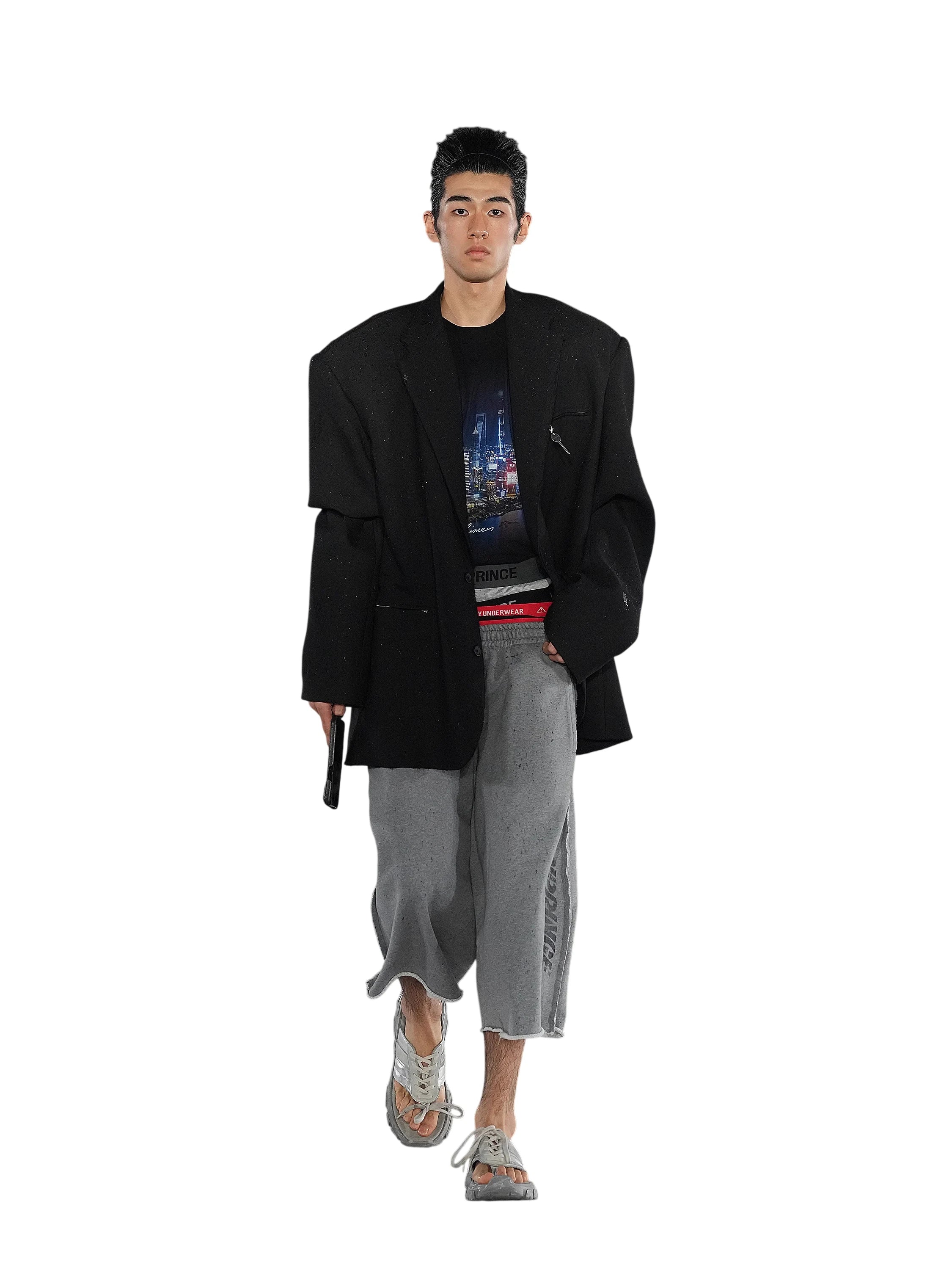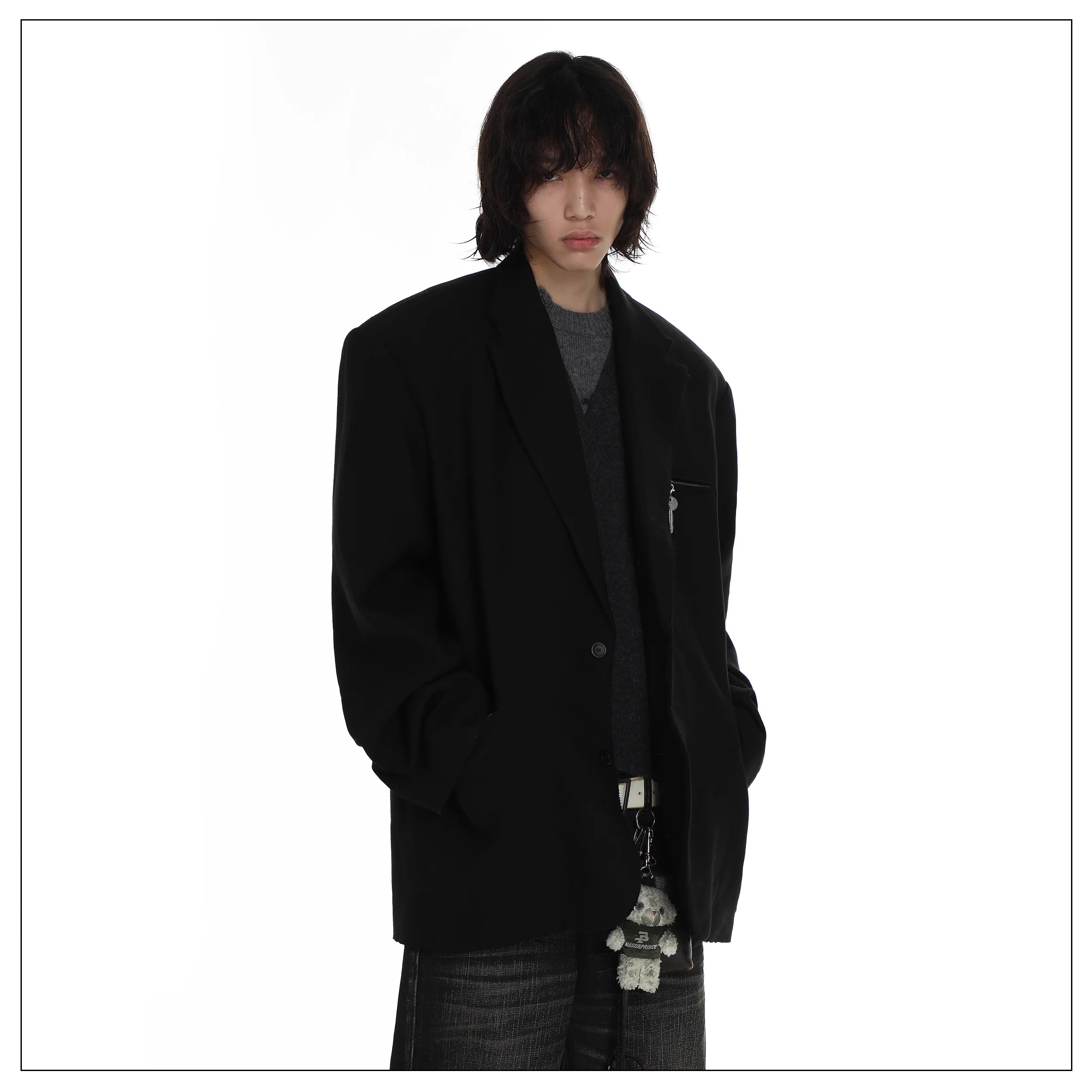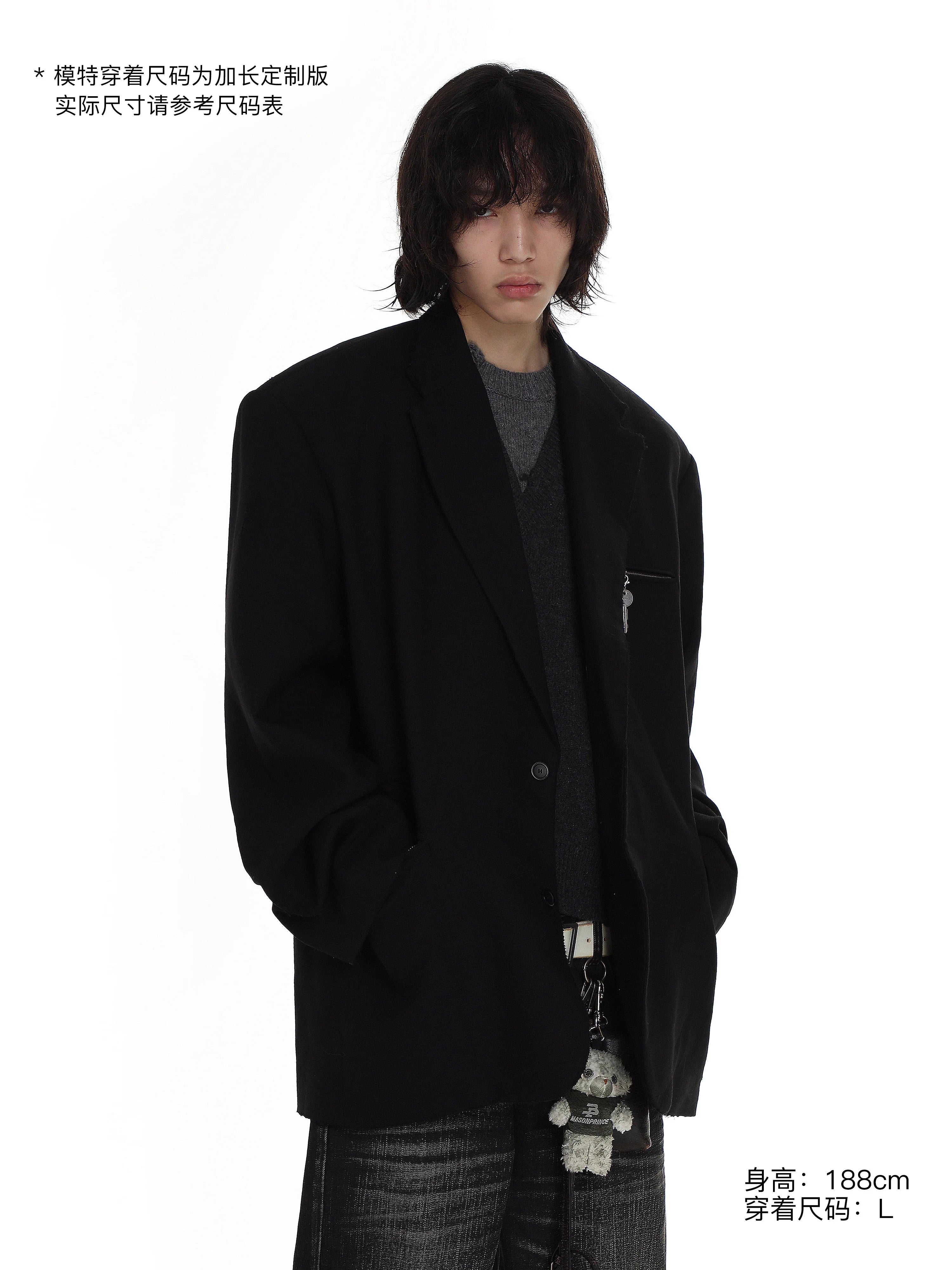This men's oversized suit jacket is crafted from premium merino wool, offering a relaxed and structured silhouette with broad shoulders. Featuring a classic notched lapel and a single-breasted button front, it delivers a modern twist on traditional tailoring. Styled here with layered monochrome pieces and distressed jeans, it suits fashion-forward, streetwear-inspired looks.