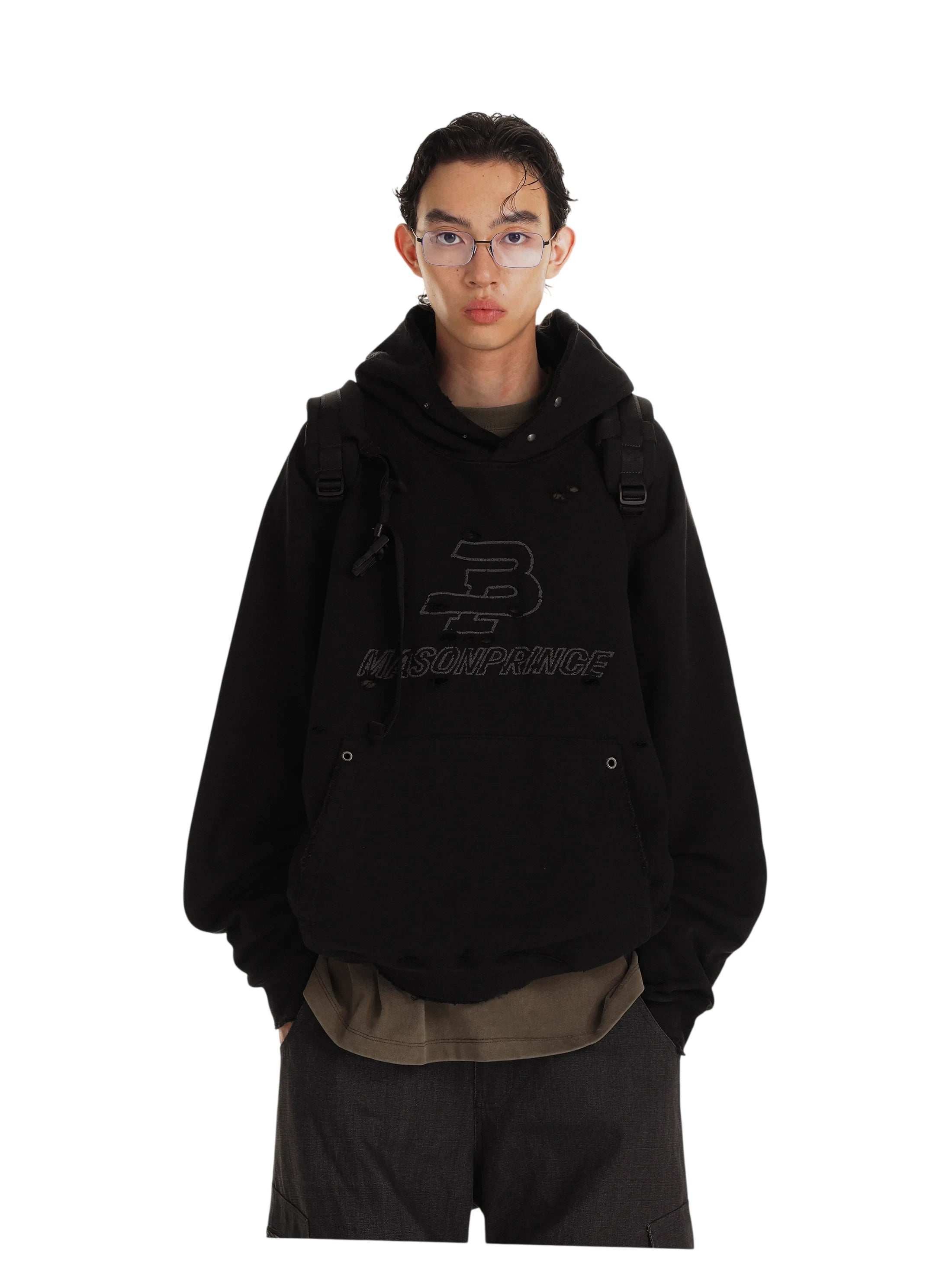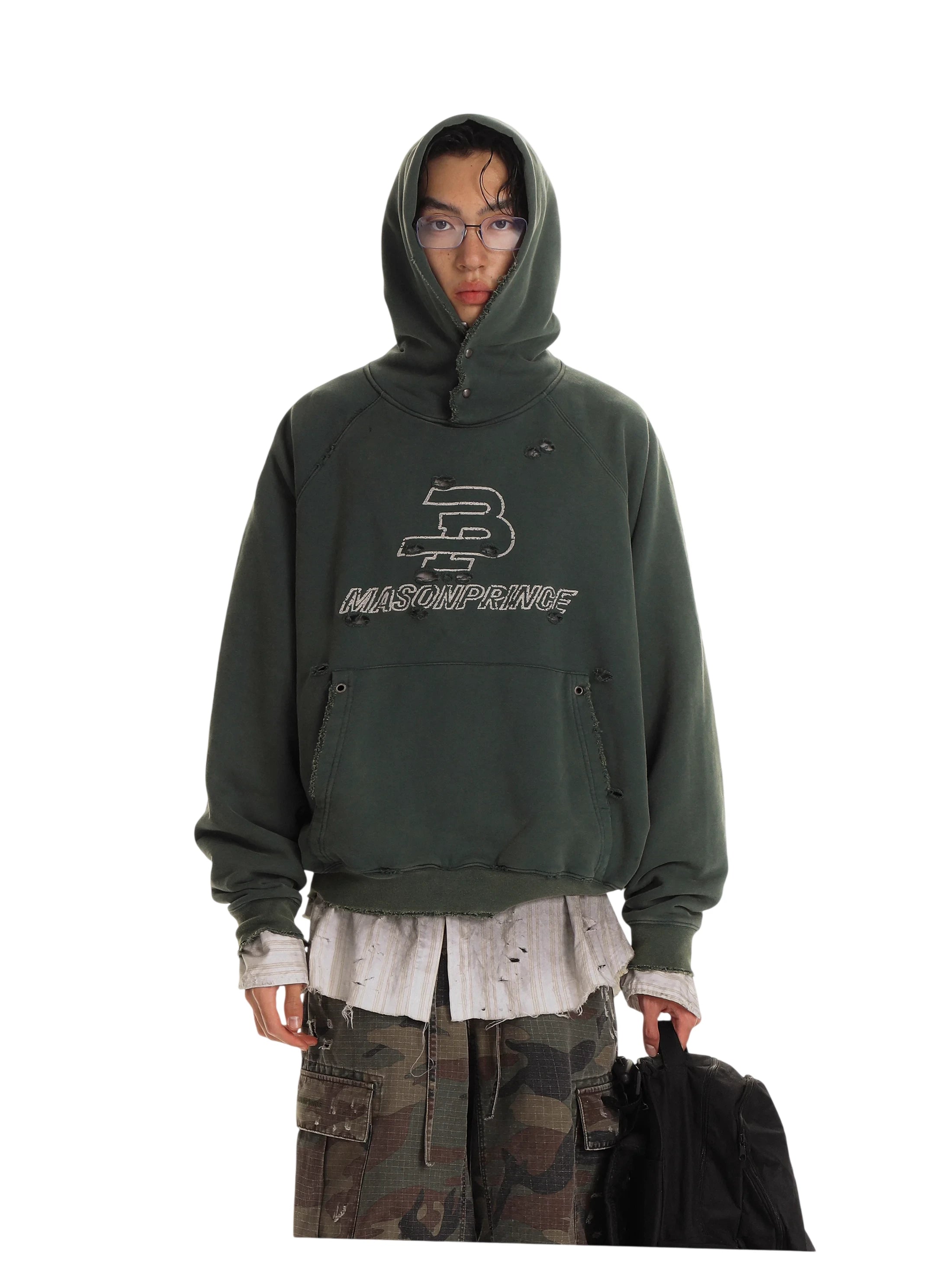 MASONPRINCE Retro Embroidered Distressed Hooded Sweatshirt