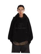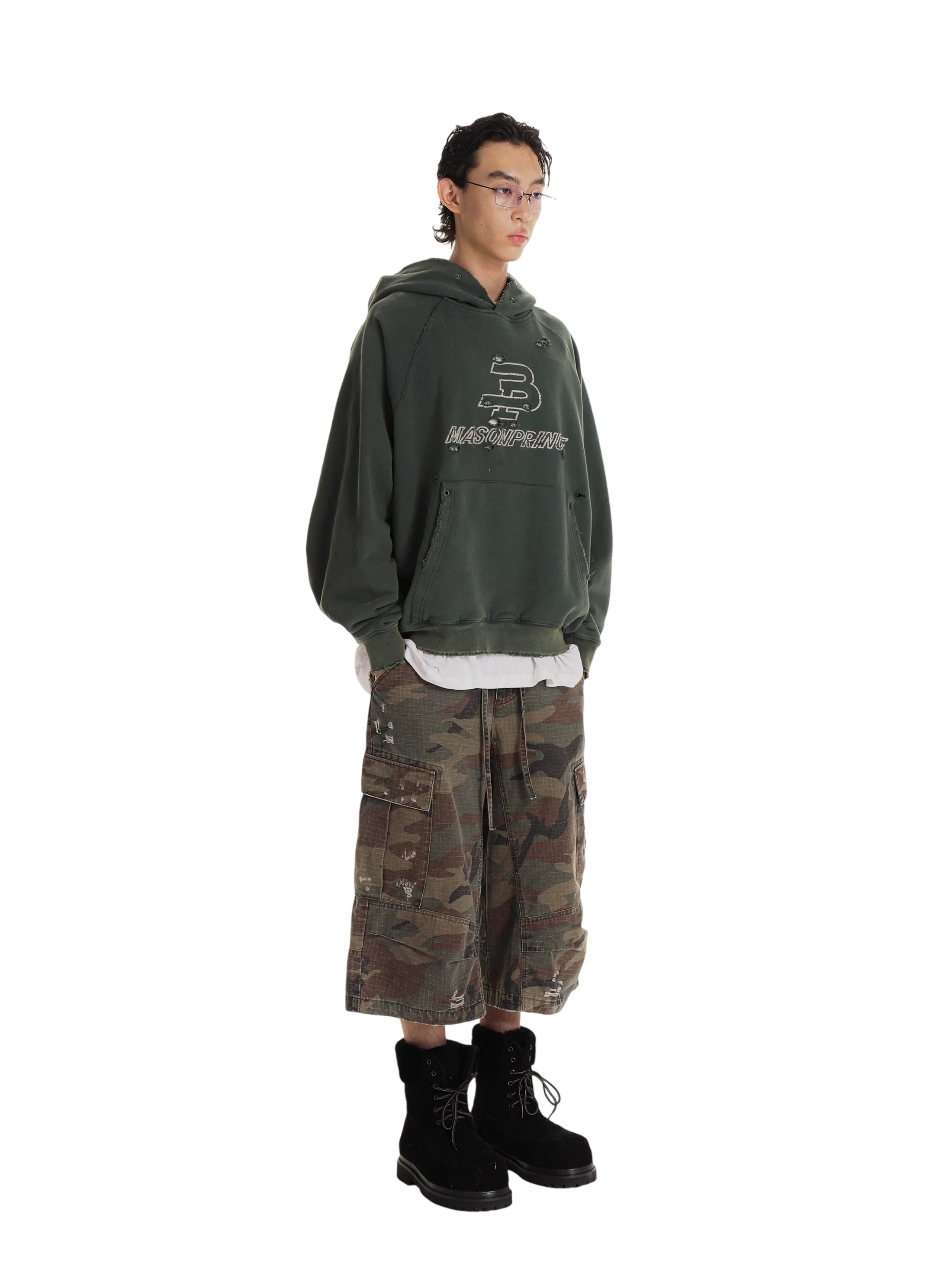 This men's premium hooded sweatshirt showcases a vintage-inspired, street-style aesthetic with bold embroidery and distressed detailing. Featuring an oversized fit in dark green, it includes frayed edges and rugged elements that deliver a worn-in, grunge look. The layered white and gray underpiece adds texture, while the embroidery on the chest enhances its retro appeal. Perfect for a casual, urban wardrobe.