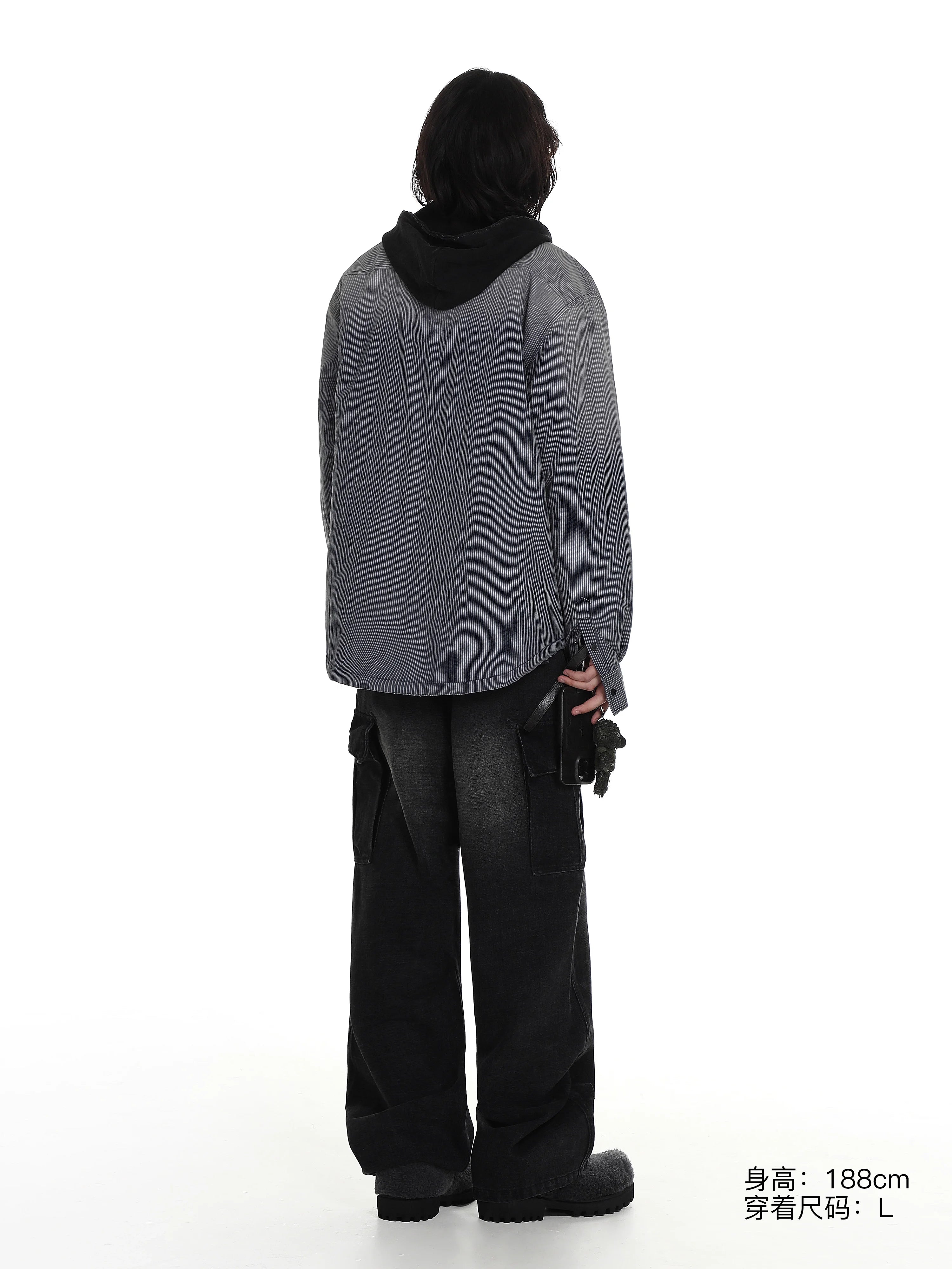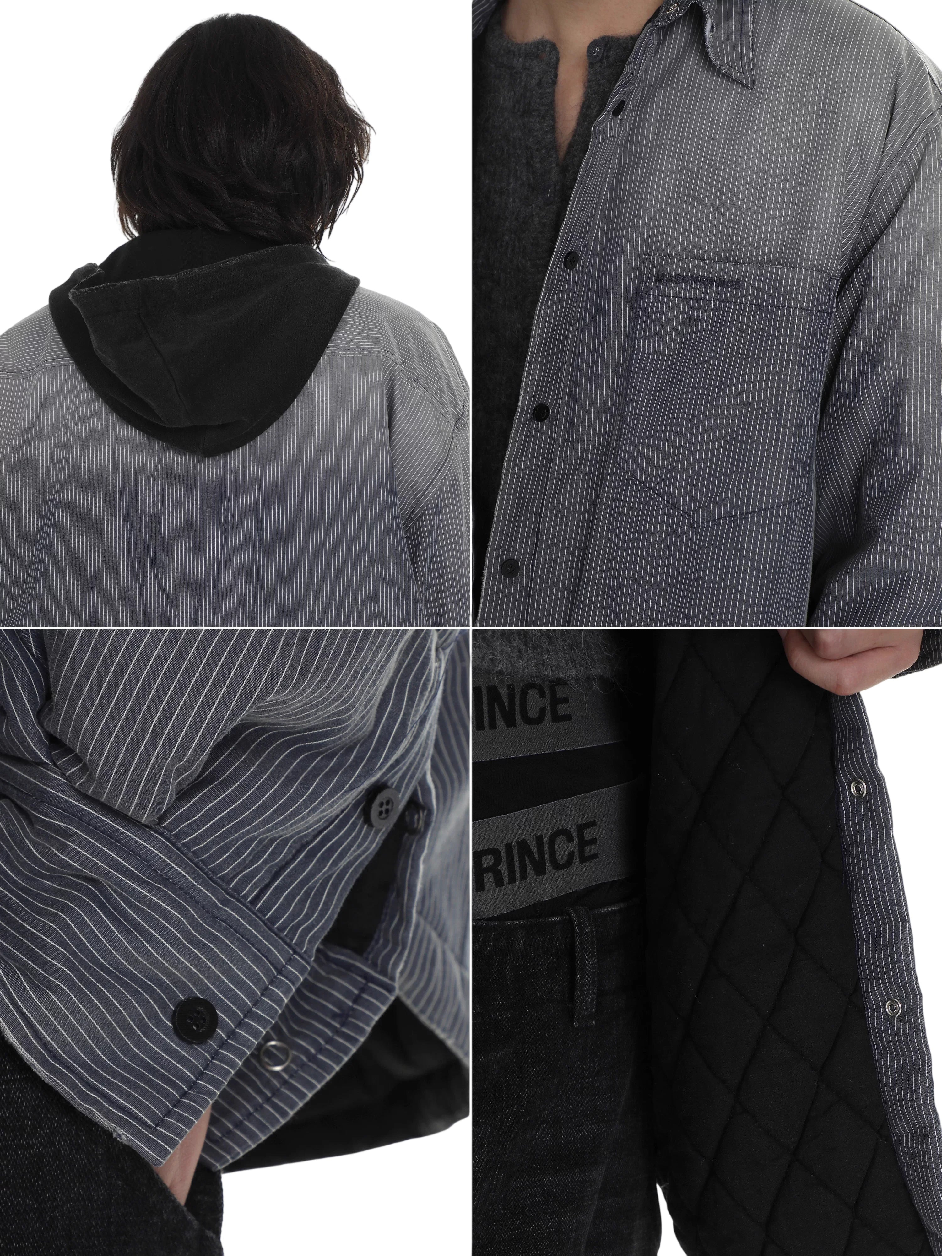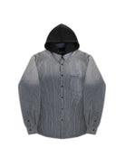 This men's hooded cotton jacket blends casual streetwear style with everyday comfort. Featuring thin stripes and a standard collar, it is designed in a lightweight, washed fabric for a relaxed and lived-in look. The open front style makes it perfect for layering over hoodies or t-shirts, ideal for laid-back outfits.
