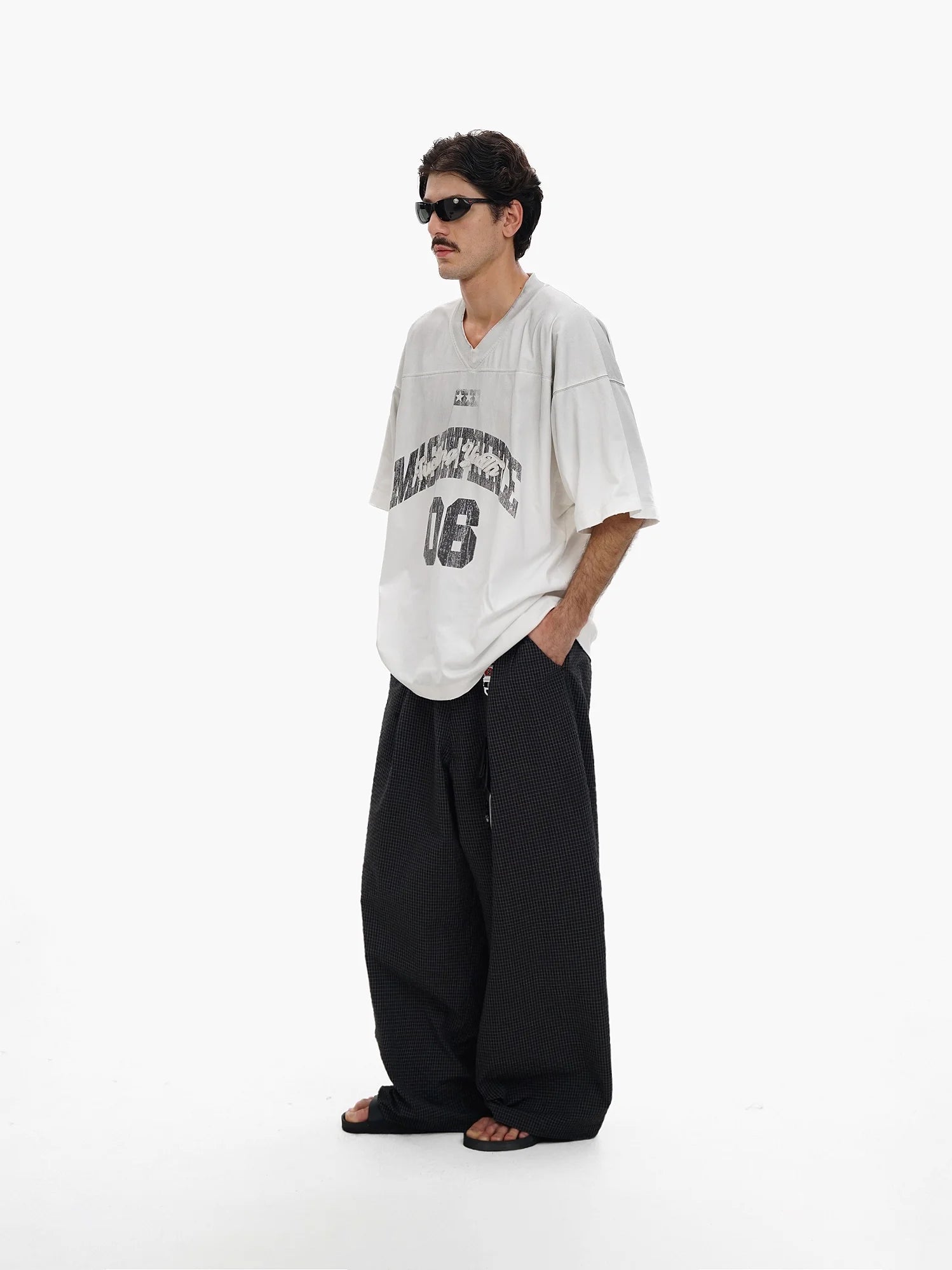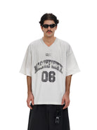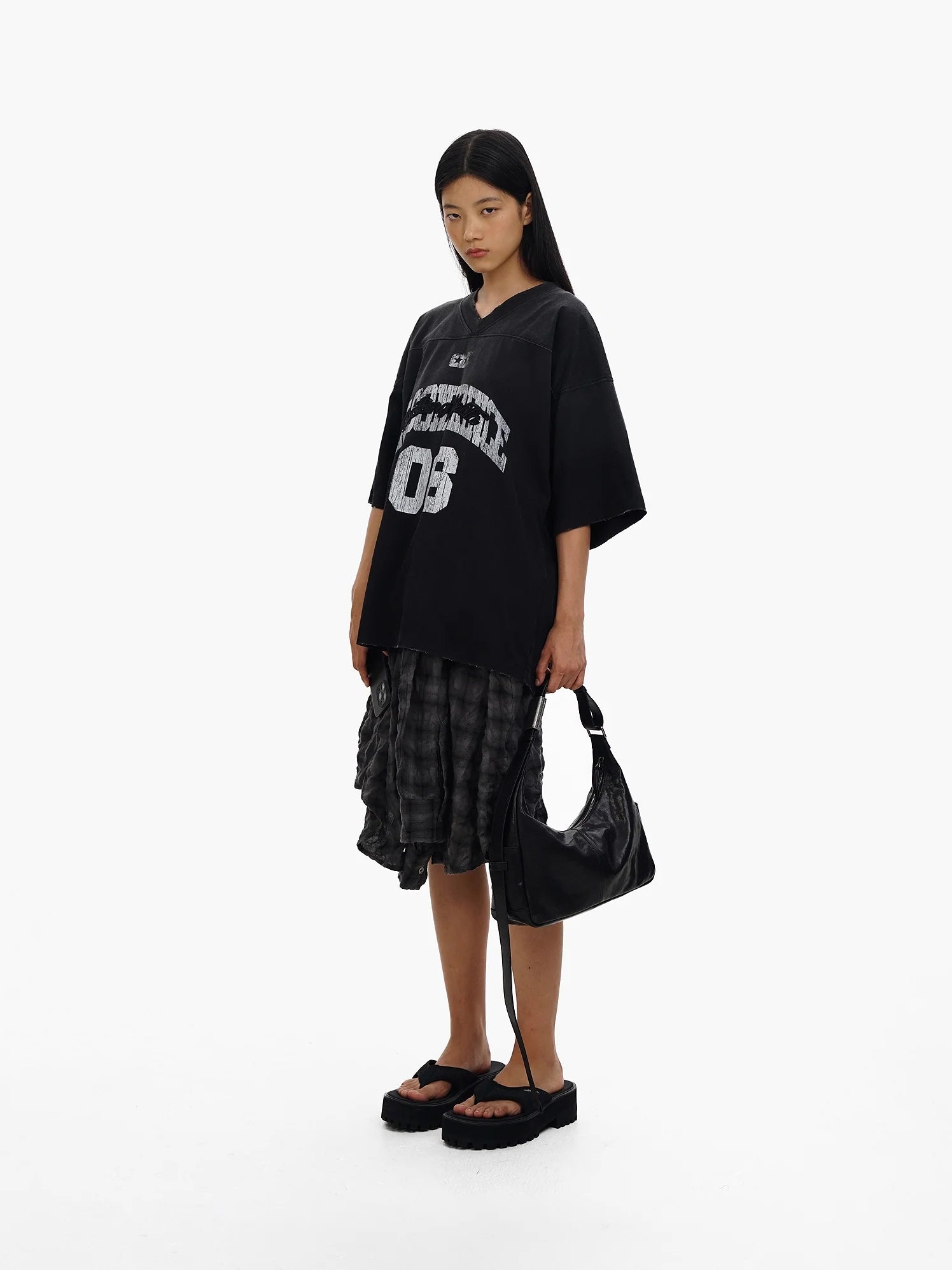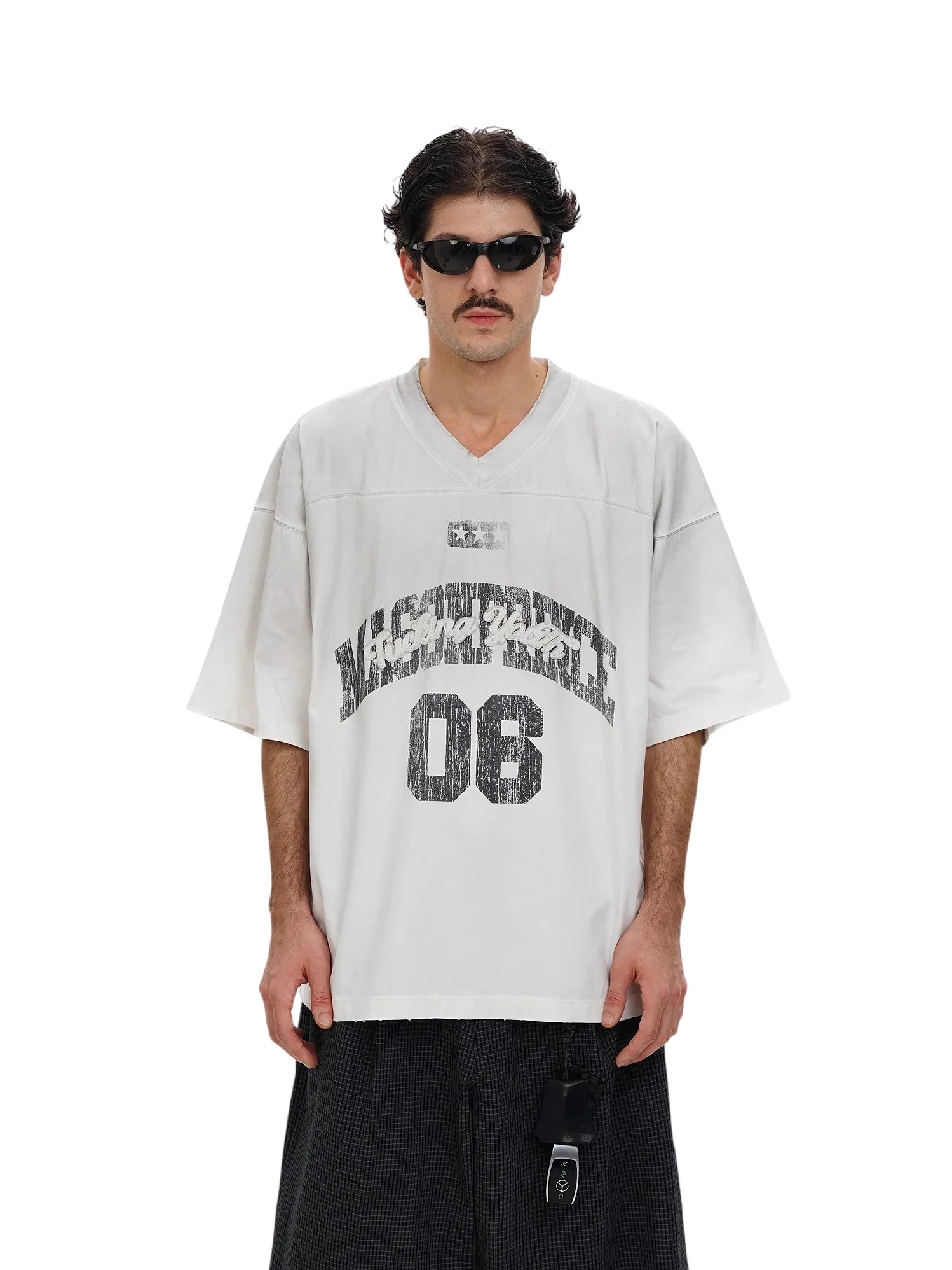 Elevate your streetwear lineup with this vintage-inspired V-neck jersey tee for men. Crafted in a classic black hue, the oversized silhouette features a boxy fit and wide, loose sleeves for a relaxed retro look. Distressed white lettering and the number graphic on the front evoke a worn-in collegiate aesthetic, perfect for adding a touch of nostalgic charm to everyday ensembles.
