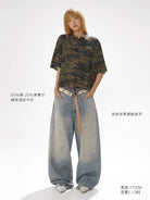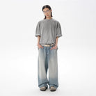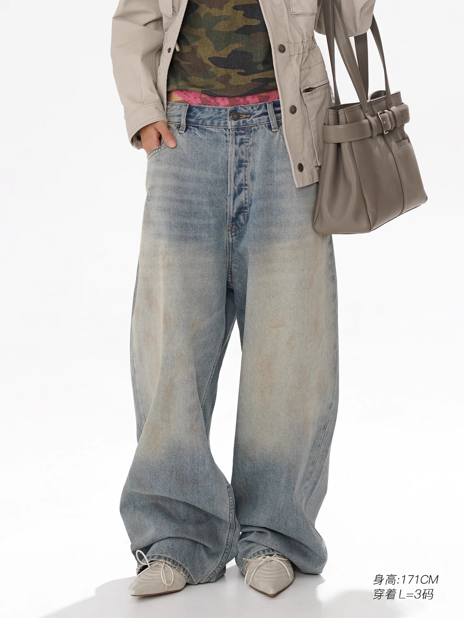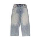 Elevate your streetwear wardrobe with these wide-leg distressed denim jeans. Designed with a relaxed fit, they feature a light-washed finish that gradually fades into a darker shade at the hem, giving them a unique, lived-in look. The multi-process distressing adds character, while the exaggerated silhouette makes a bold fashion statement.