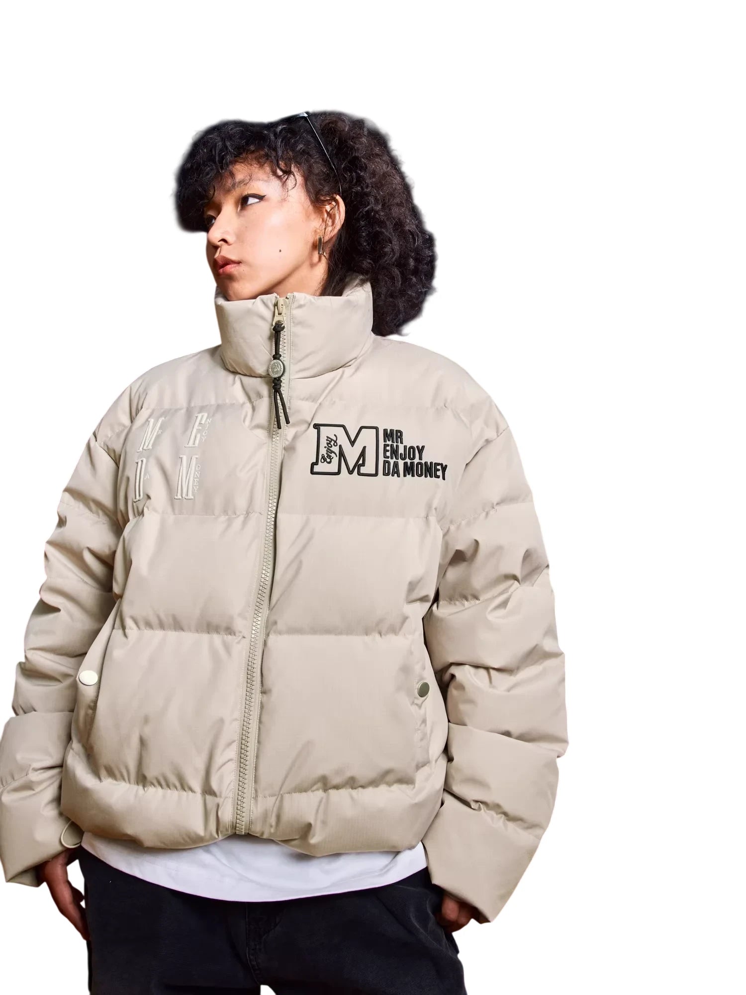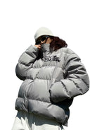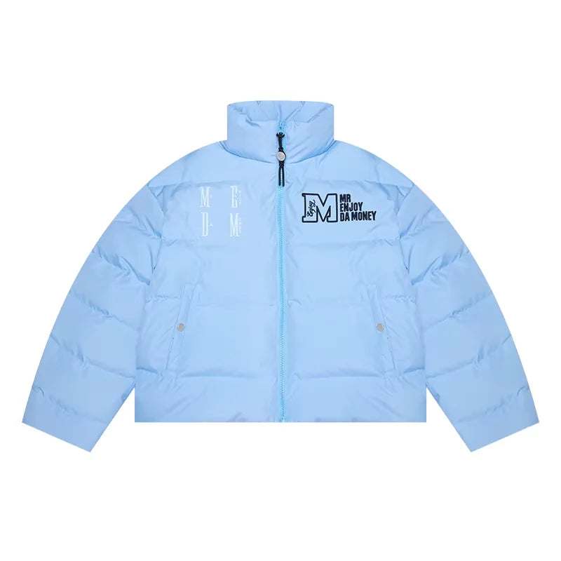Stay warm and stylish with this short winter puffer jacket designed for men. Featuring 90% duck down filling, it provides superior insulation while remaining lightweight. The jacket includes a large embroidered "M" logo on the chest, adding a bold and fashionable touch. Available in multiple colors such as brown, white, green, grey, and black, it offers versatile styling options for casual winter outings. The windproof design ensures extra protection against cold weather, making it a practical yet trendy choice.