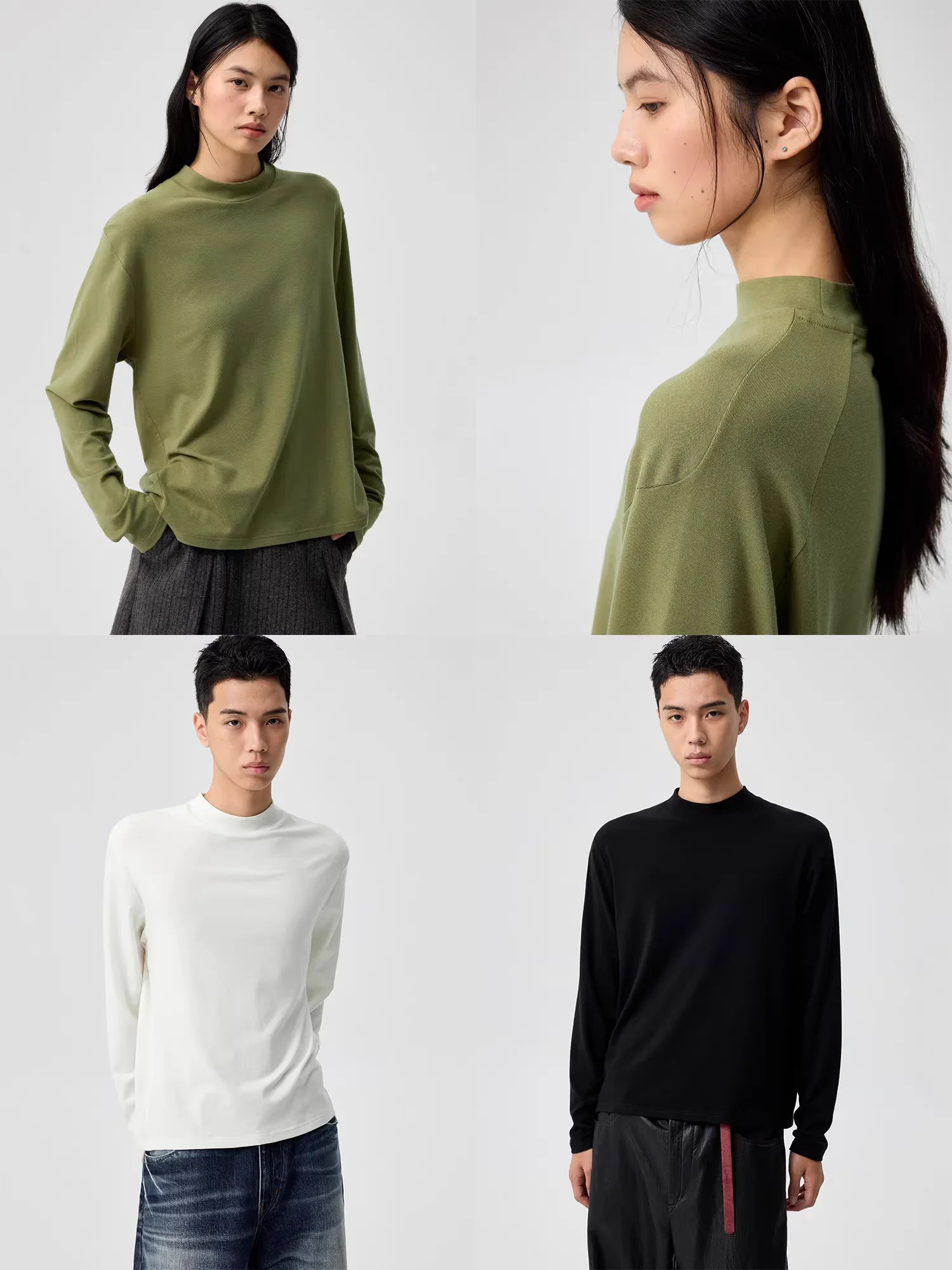 Elevate your everyday essentials with this unisex long sleeve T-shirt crafted from soft, lightweight merino wool. Featuring a modern slim fit and a sophisticated mock neck collar, this shirt is designed for comfort and style in any setting. Available in olive green, white, and black, its minimal silhouette offers versatile layering options for a polished casual look.