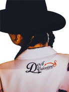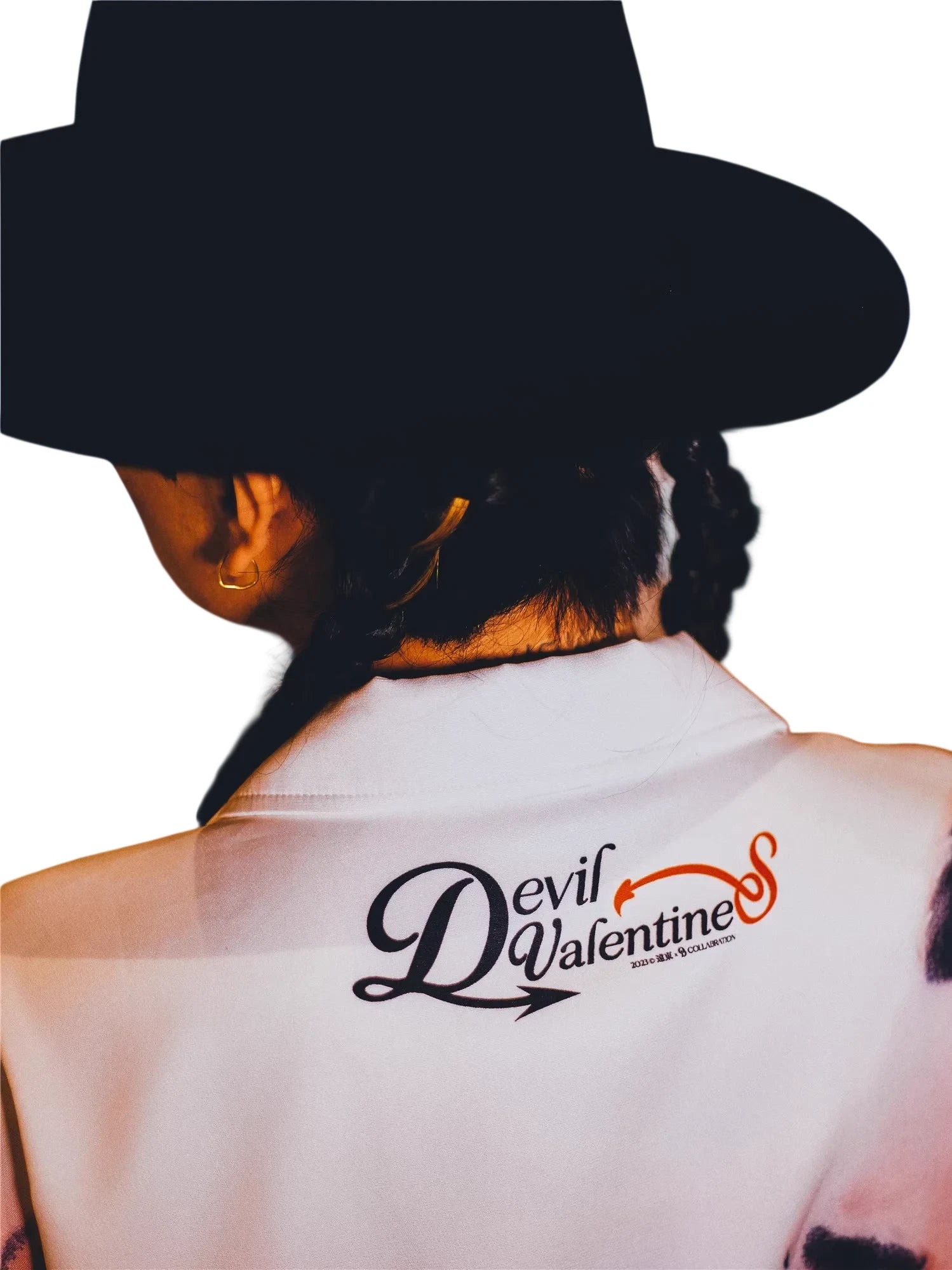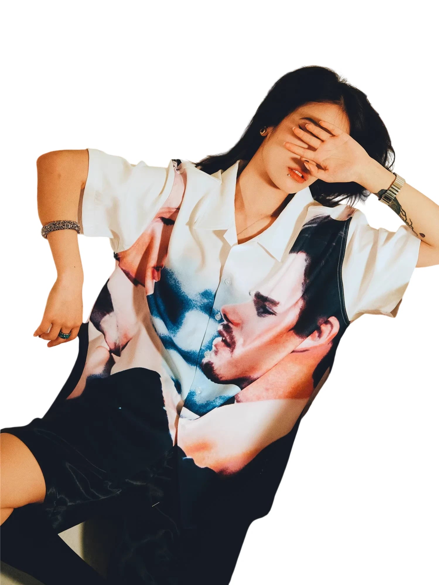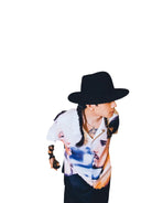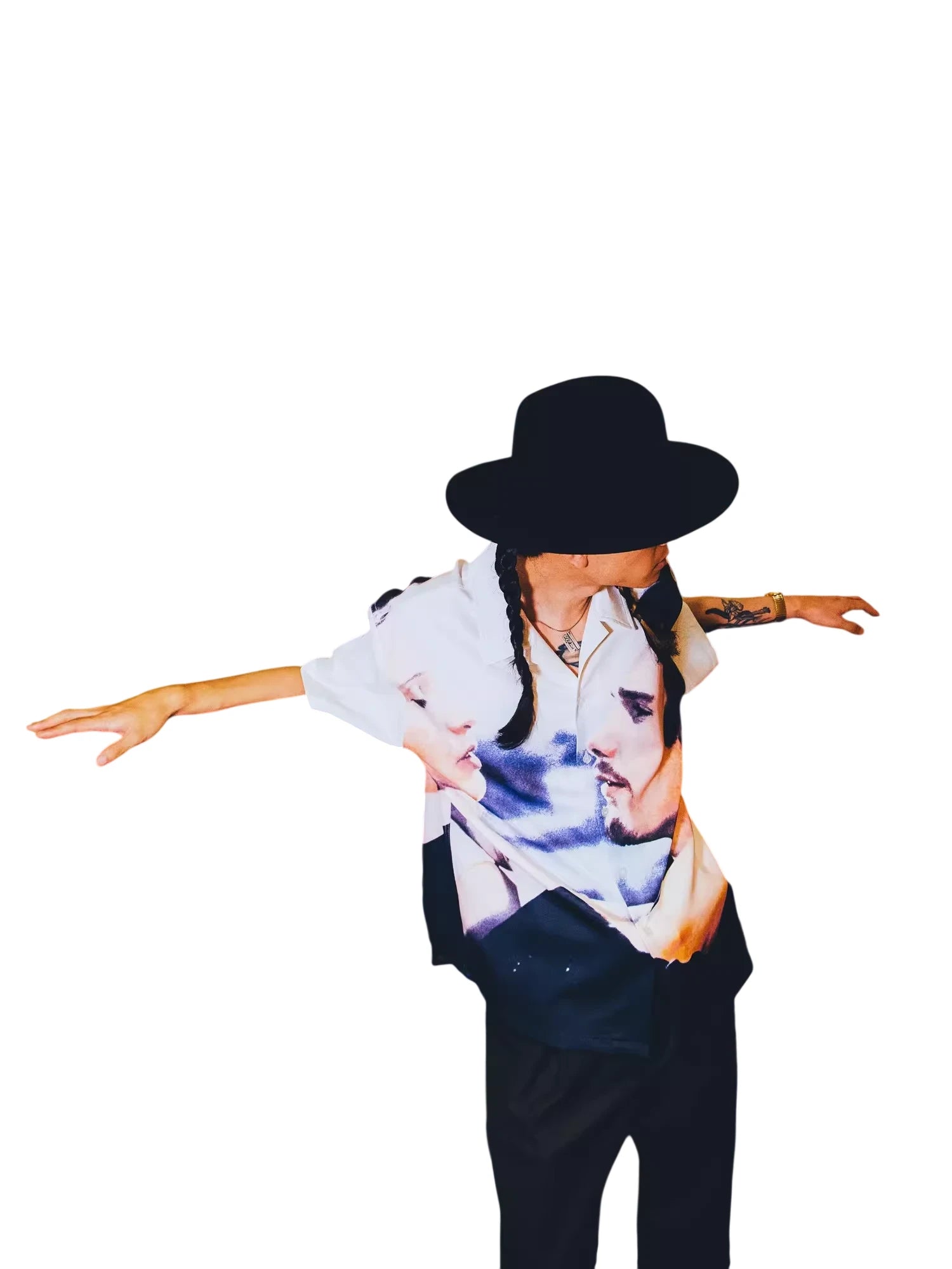 Styled here with wide-leg dark trousers and a dramatic black wide-brim hat, the look is completed with long braids and visible arm tattoos, adding a modern, edgy twist. Crafted for confident, expressive wearers, this shirt is perfect for upscale settings or high-fashion moments. Gender-neutral in design, this versatile piece suits a variety of personal styles.