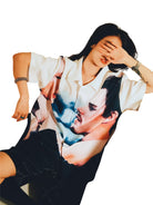 Make a daring style statement with this short-sleeve button-up shirt from the Evil Valentine's Day series, featuring a striking romantic portrait print of two faces in an intimate embrace. Designed with a soft gradient of flesh tones and artistic shadows, this piece blends bold expression with high fashion aesthetics.