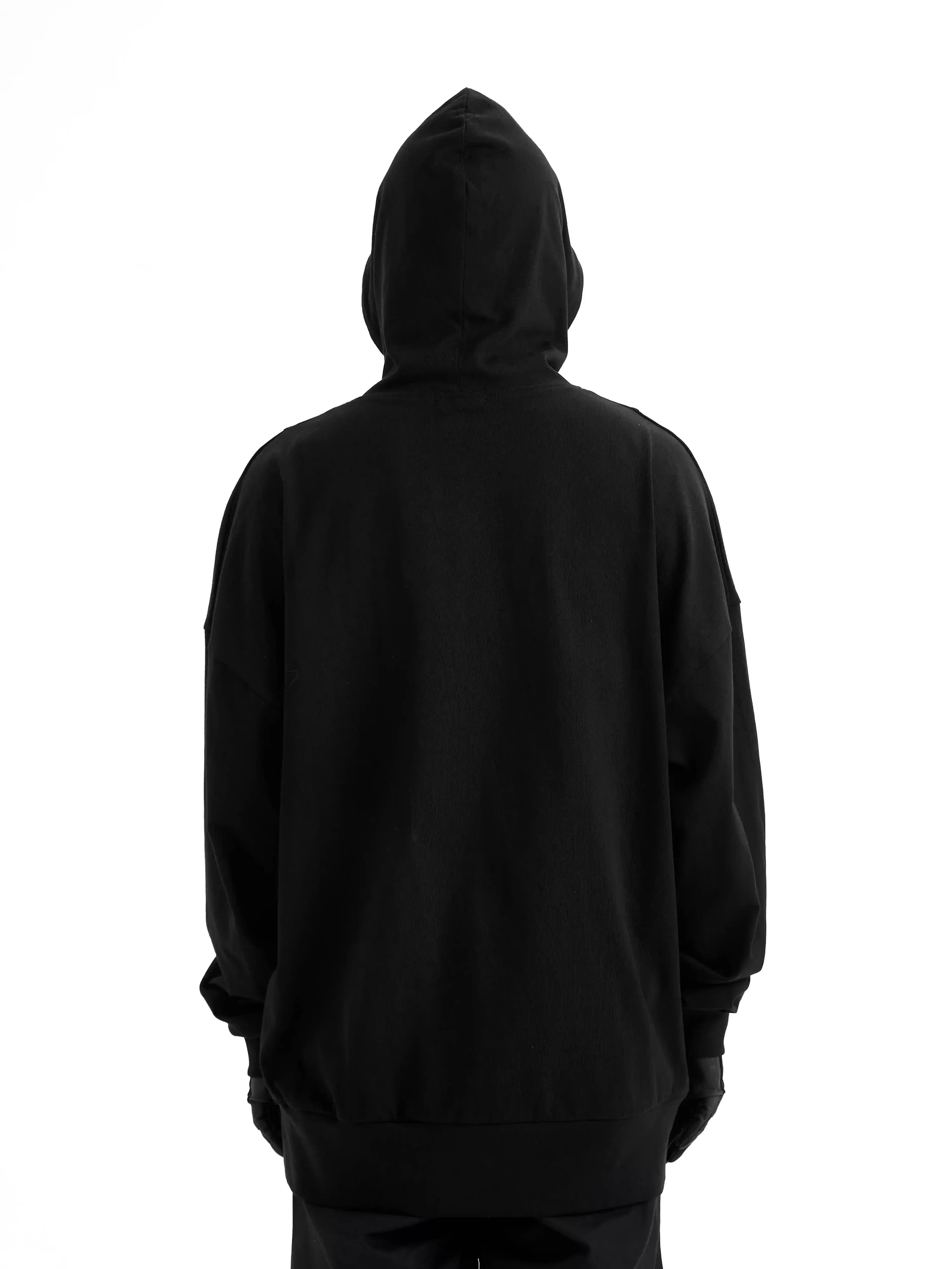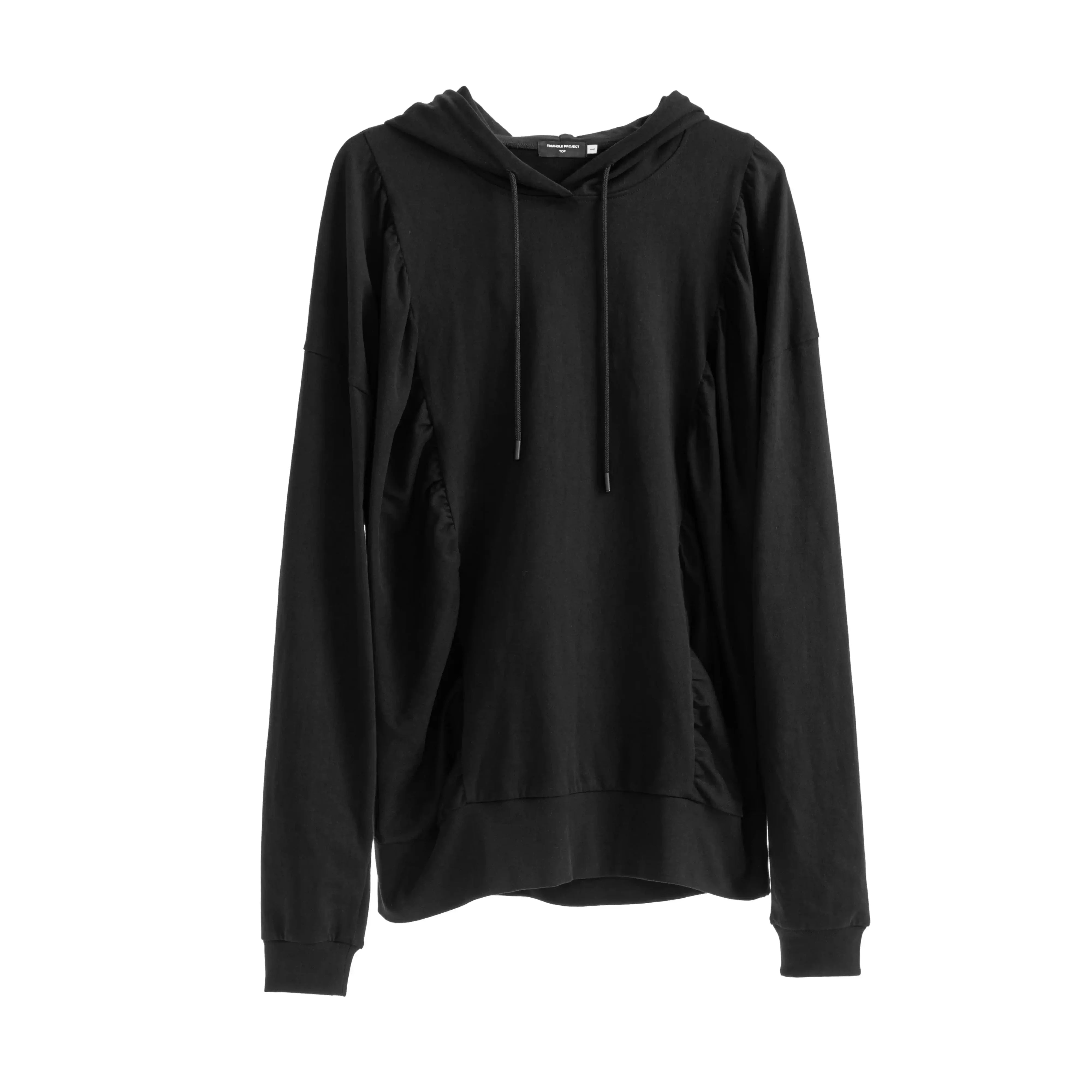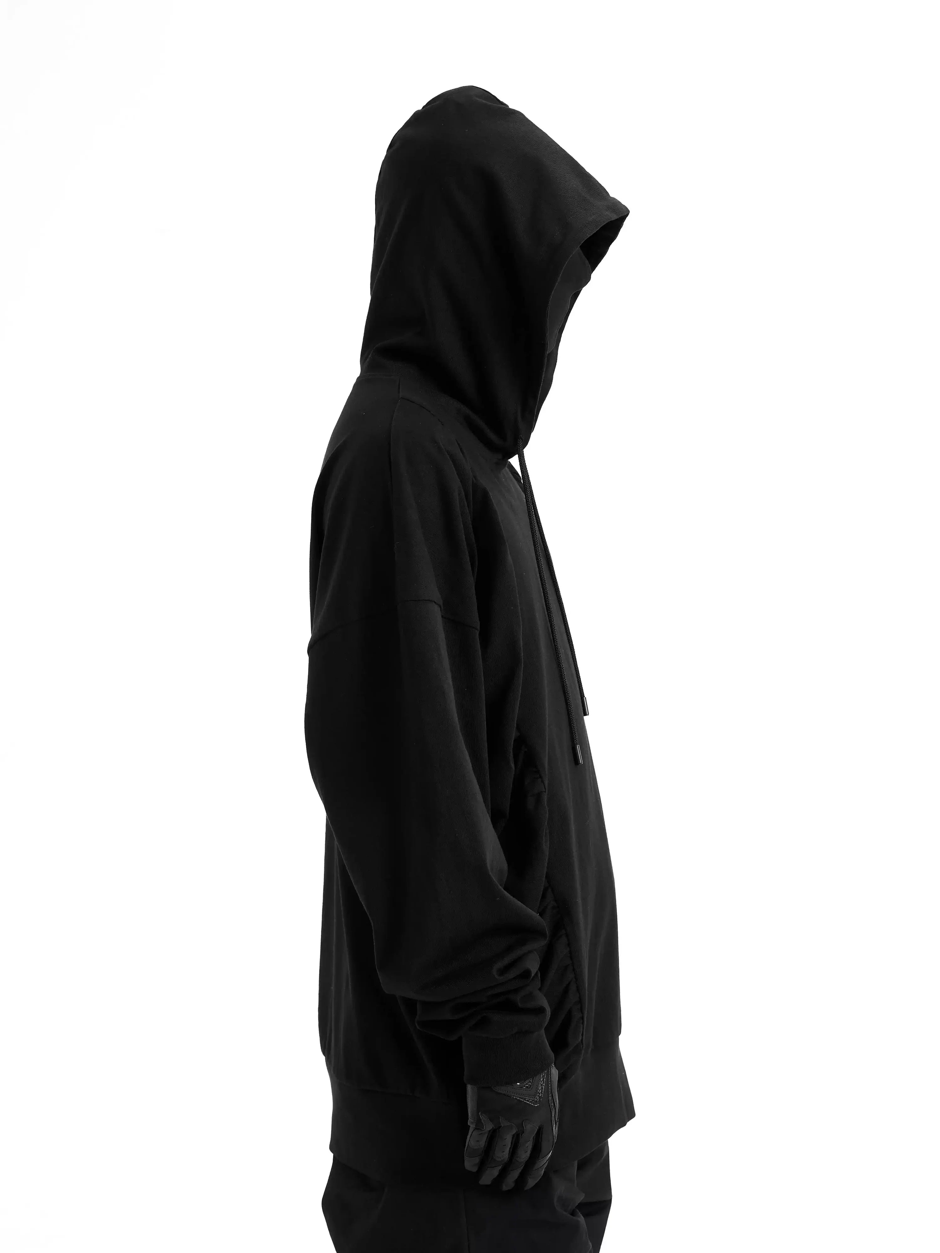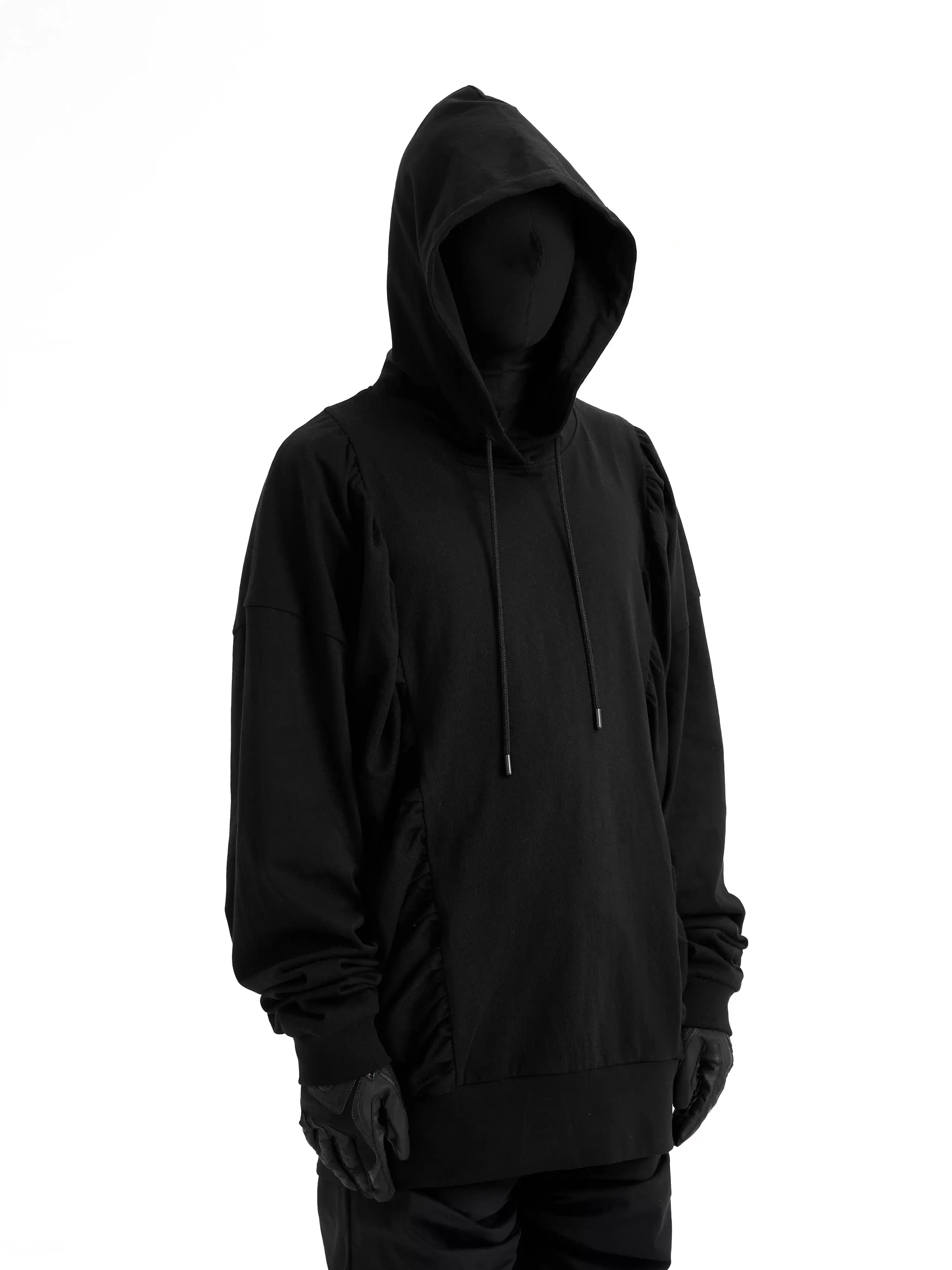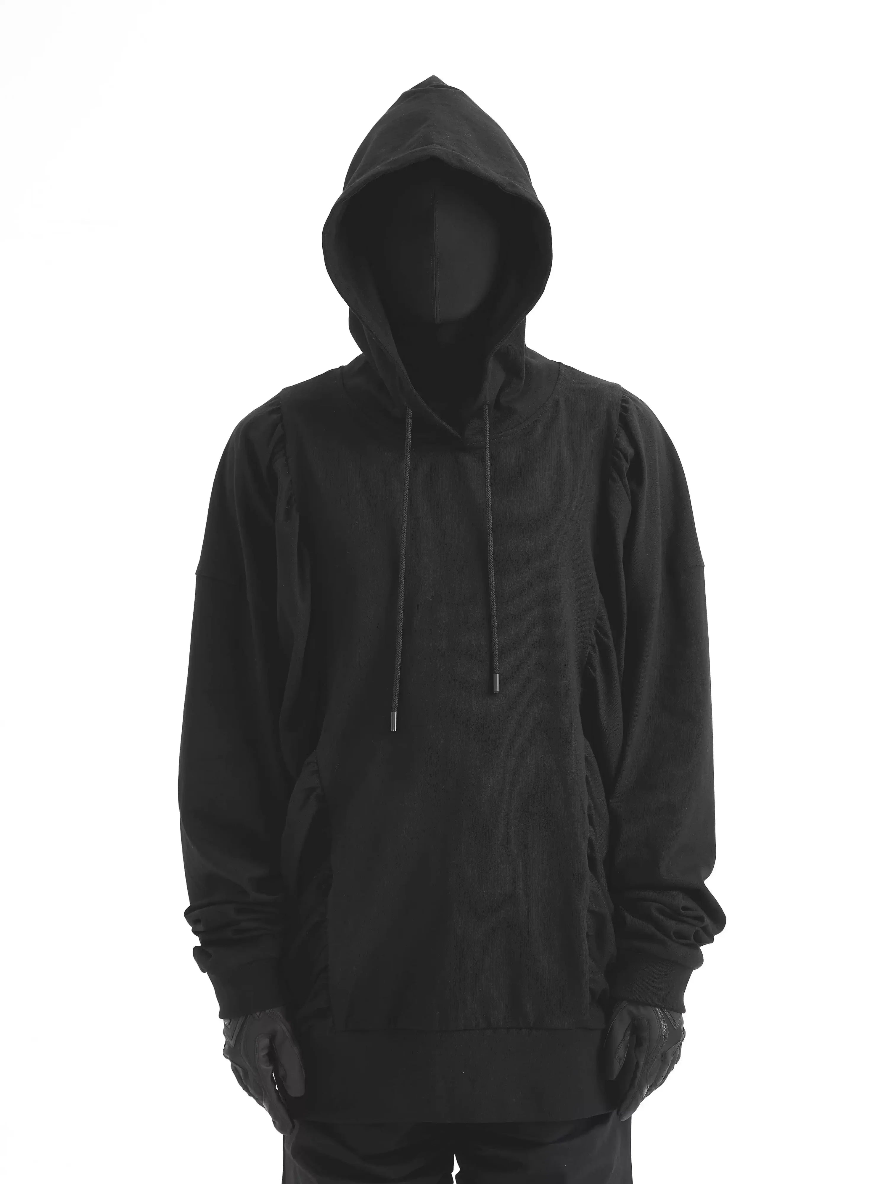 Elevate your casual wear with this unisex pleated patchwork hoodie, designed for comfort and contemporary style. Featuring a relaxed, loose fit and distinctive gathered detailing along the sides, this black hooded sweatshirt offers a structured yet minimalist silhouette.