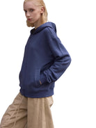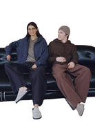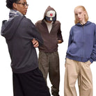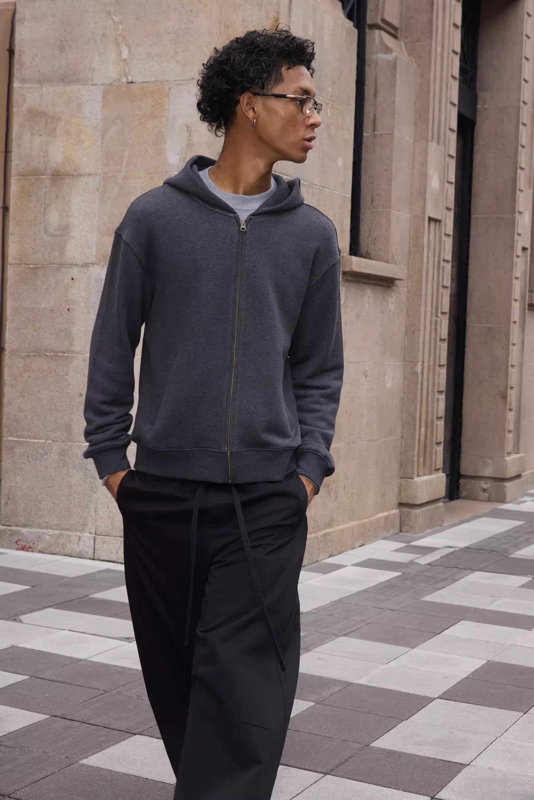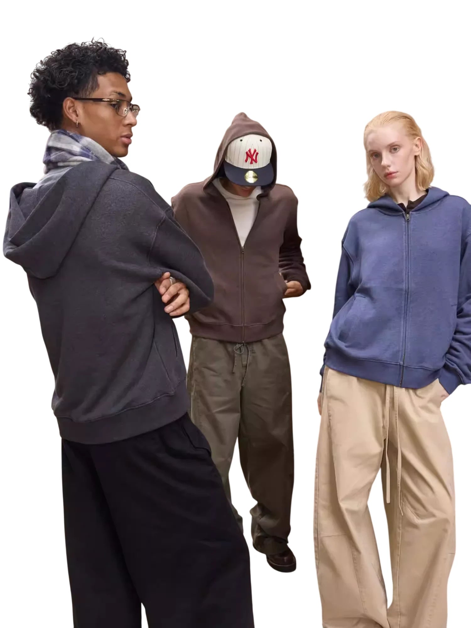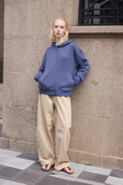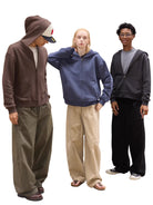 Available in a variety of solid colors, this hoodie is modeled in a range of looks: a charcoal version paired with wide-leg black pants and a checkered scarf, a brown version with army green drawstring pants, and a blue version worn by a female model with beige wide-leg trousers. Ideal for everyday wear with a fashionable street-style edge.