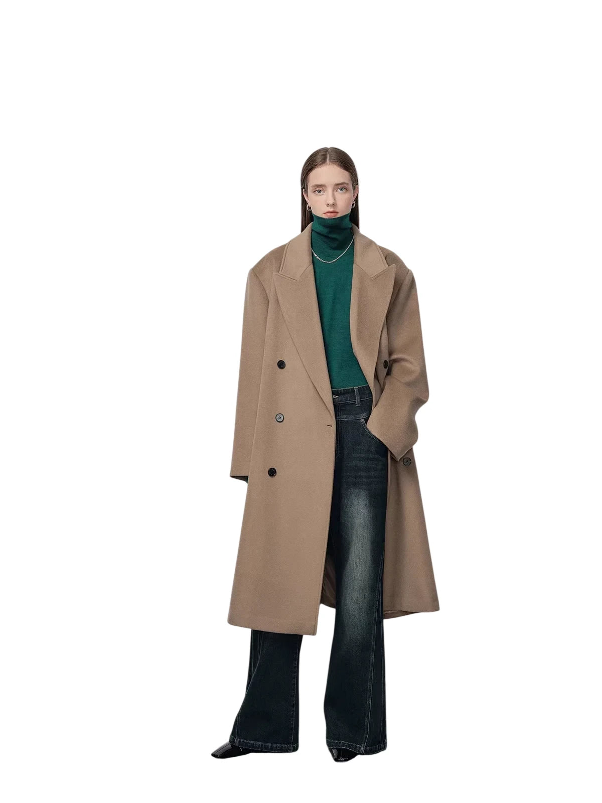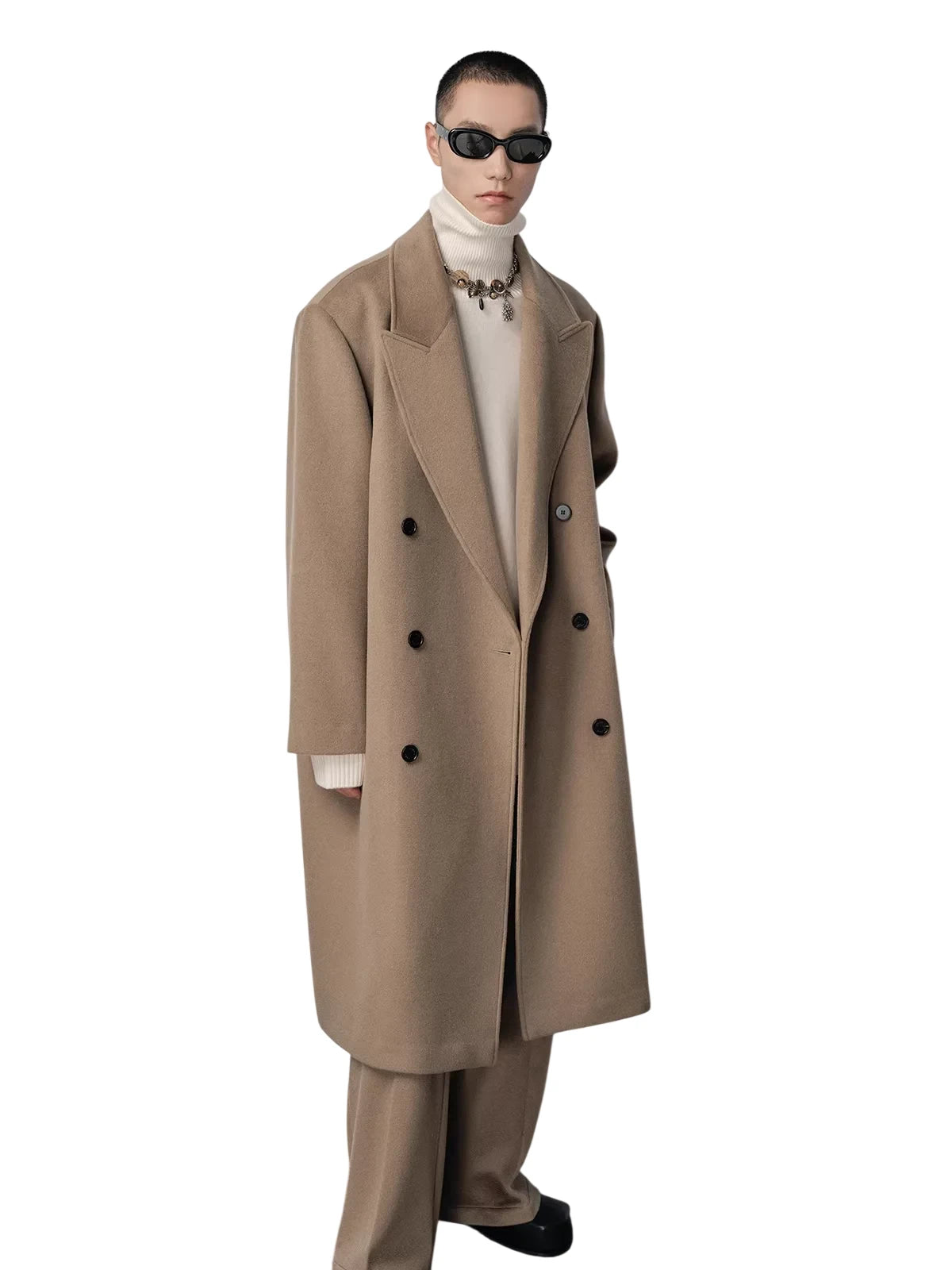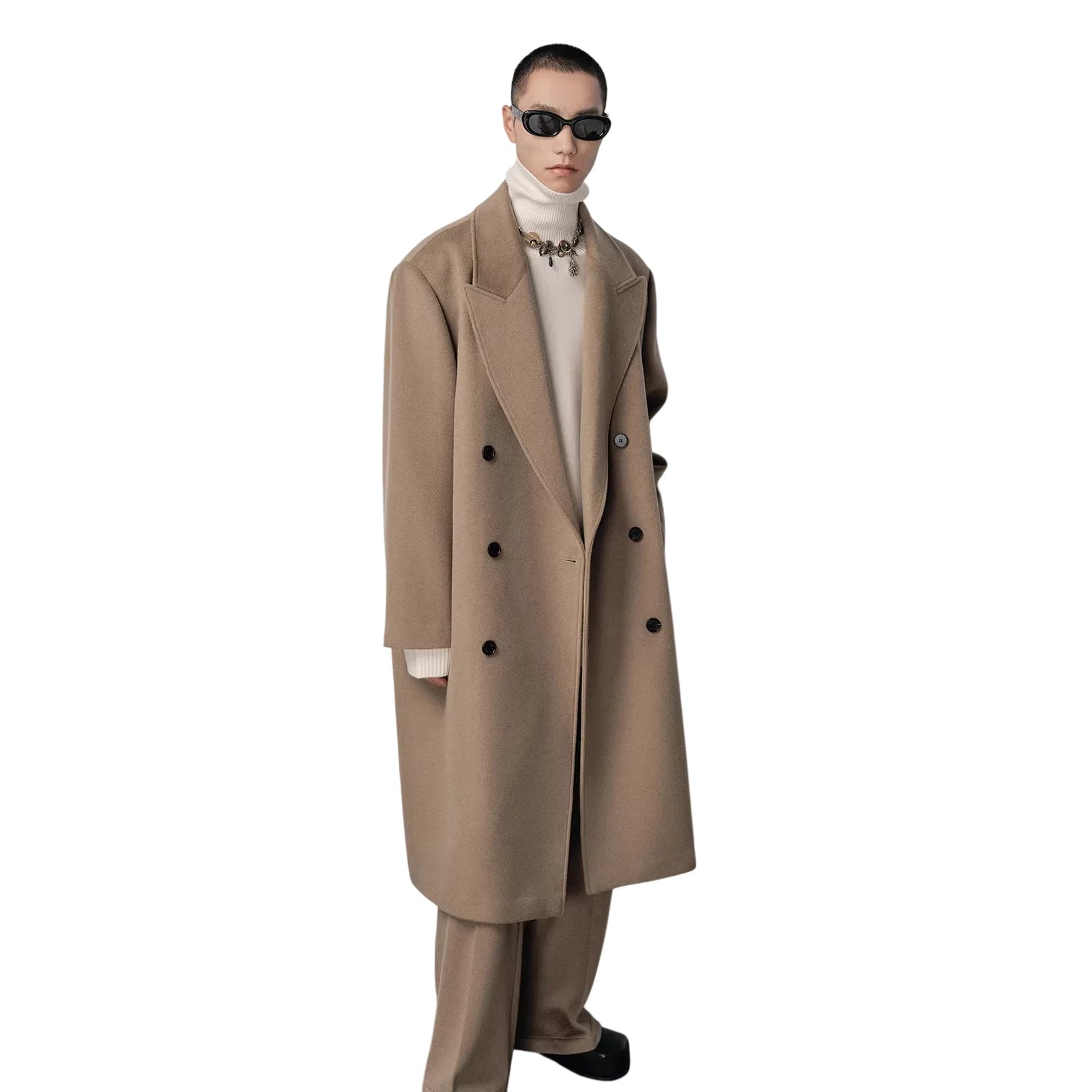 This men's oversized double-breasted coat features broad shoulders, a peak lapel design, and a classic herringbone wool fabric. Lightly padded for added structure, it extends below the knee for a commanding presence. The camel hue offers timeless appeal, while the black buttons add subtle contrast. Ideal for high-fashion looks, it pairs effortlessly with tailored trousers and knitwear for a refined ensemble.