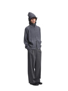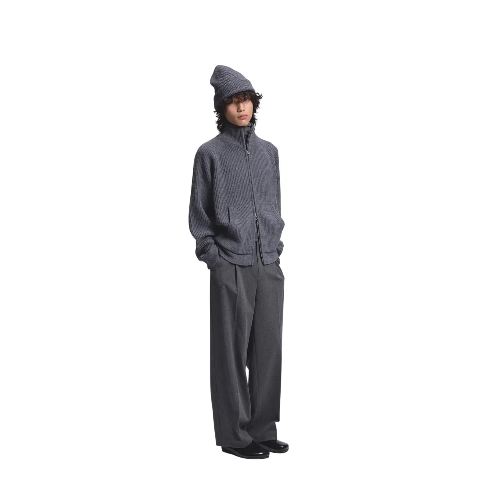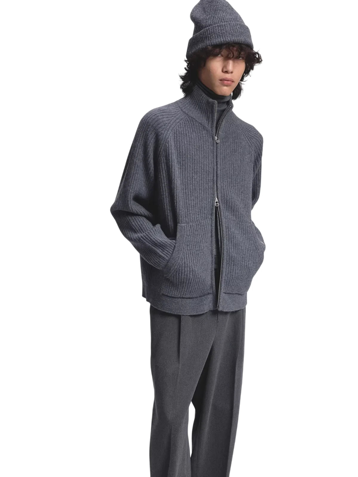 This men's cardigan is crafted from 80s extra fine merino wool, featuring a ribbed texture that adds subtle dimension to its refined silhouette. Designed with raglan sleeves for ease of movement and a turtleneck collar for added warmth, it also includes a practical front zip closure and side pockets. The soft drape and tonal styling make it a versatile layering piece for cooler seasons.