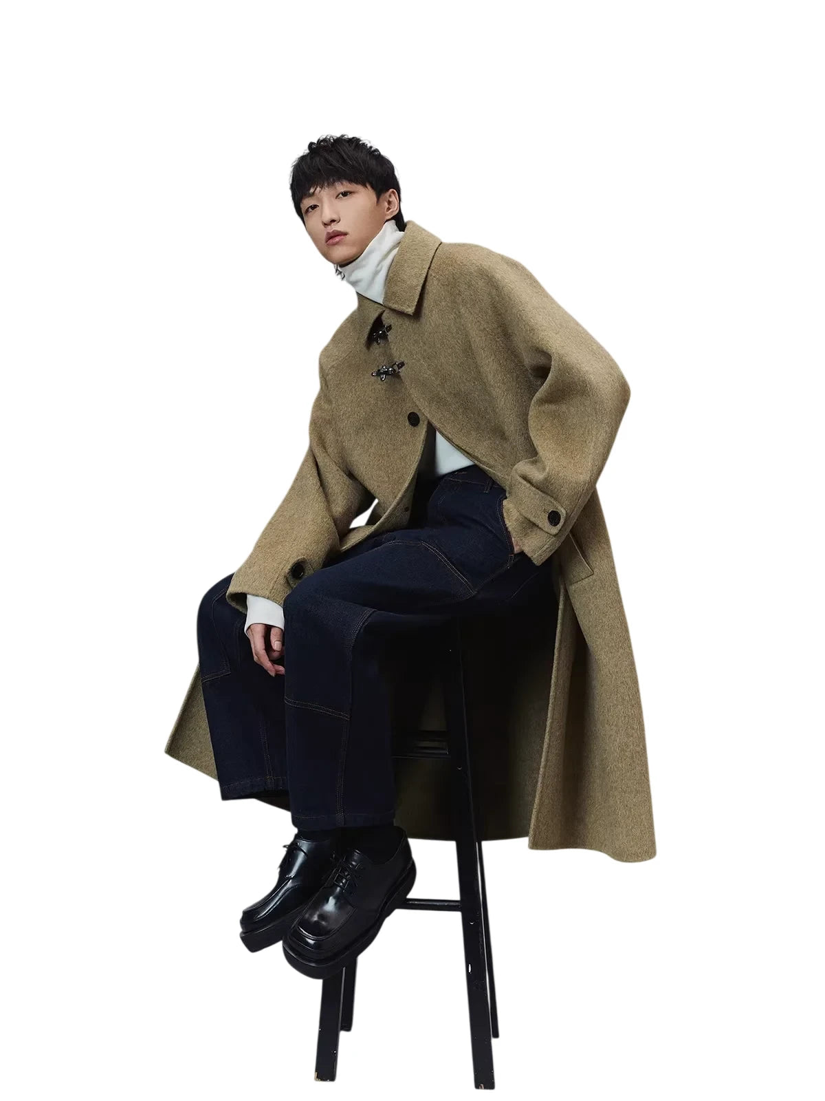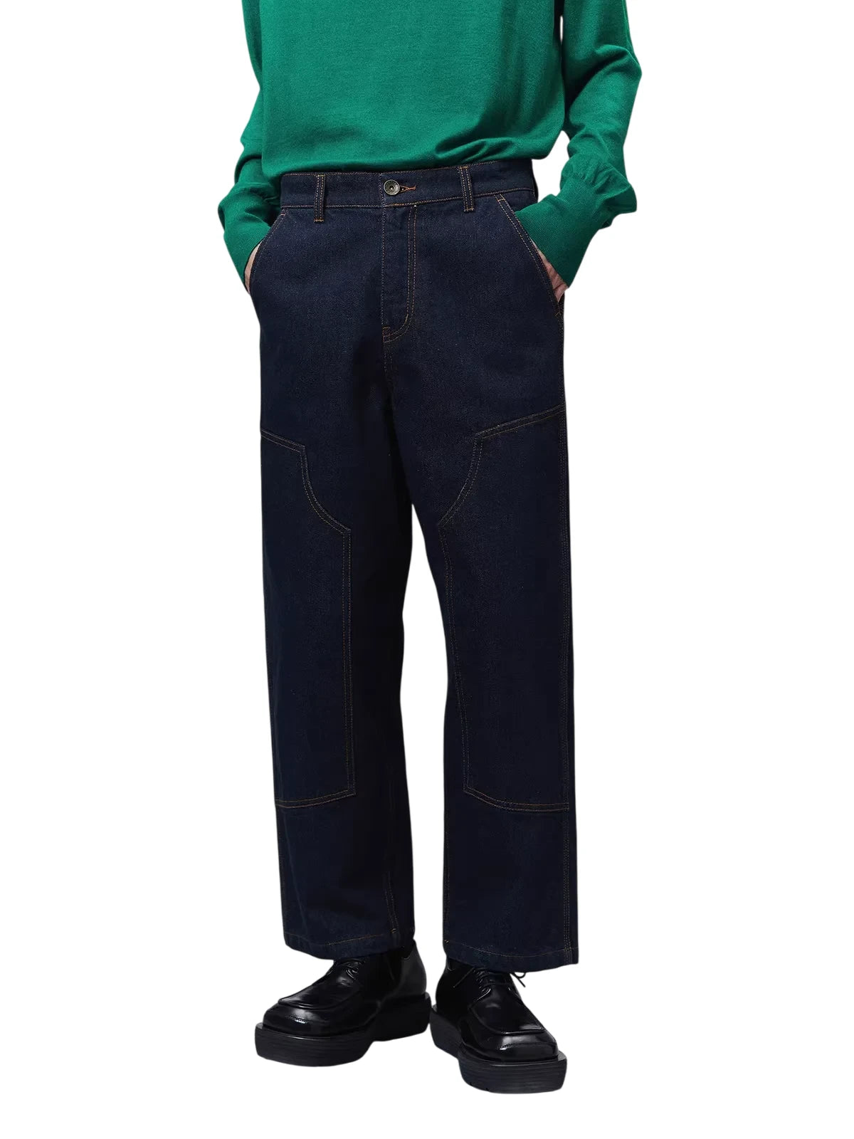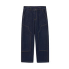 Designed with a utilitarian edge, these men's cropped carpenter denim pants feature a relaxed straight-leg fit and distinctive patch-style front pockets. Made from a durable dark indigo denim with contrast brown stitching, they offer both function and style. Additional features include multiple pockets for storage, a light fleece lining for added comfort, and a secure zipper fly with button closure.