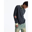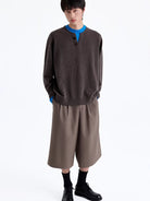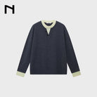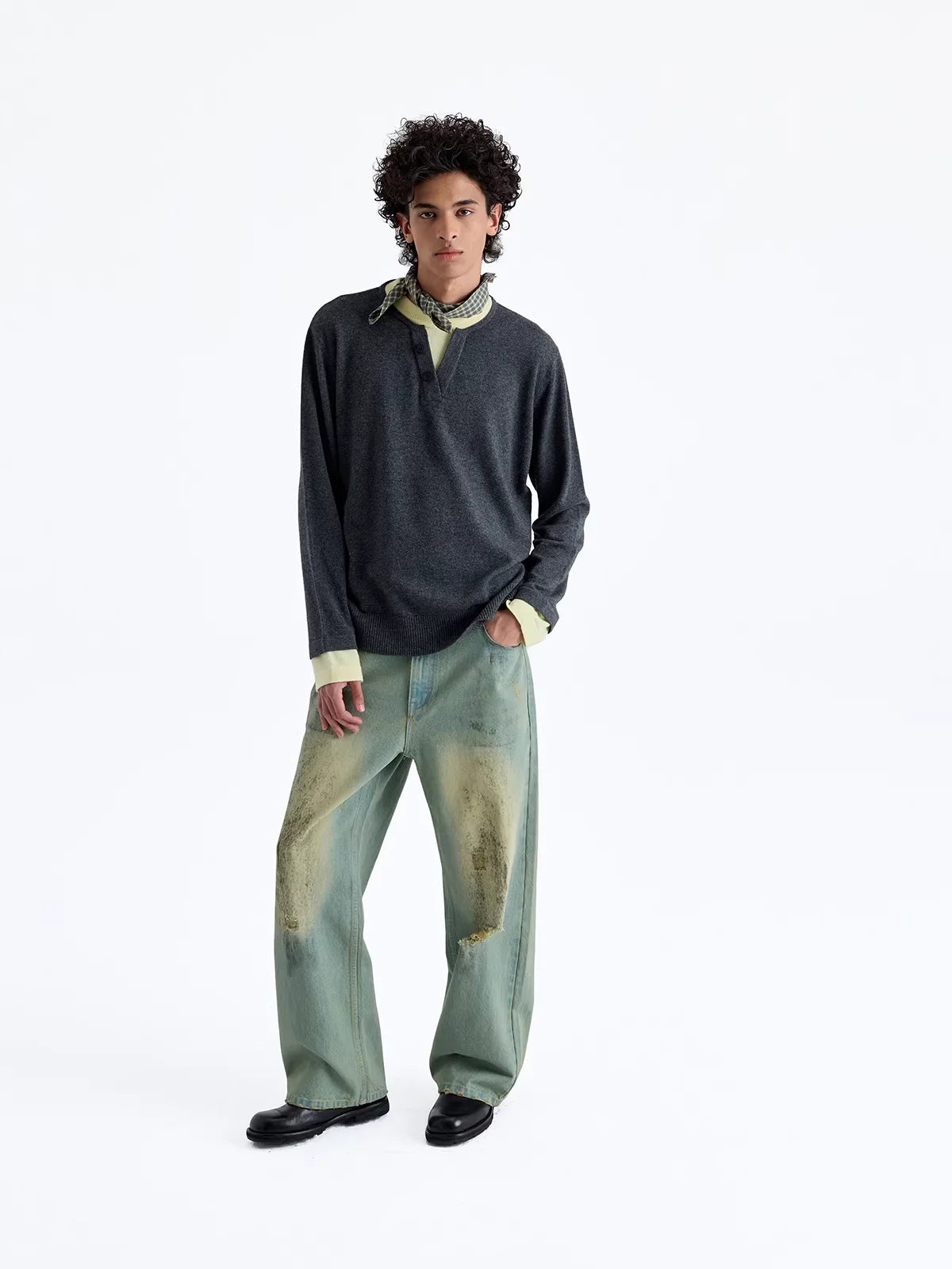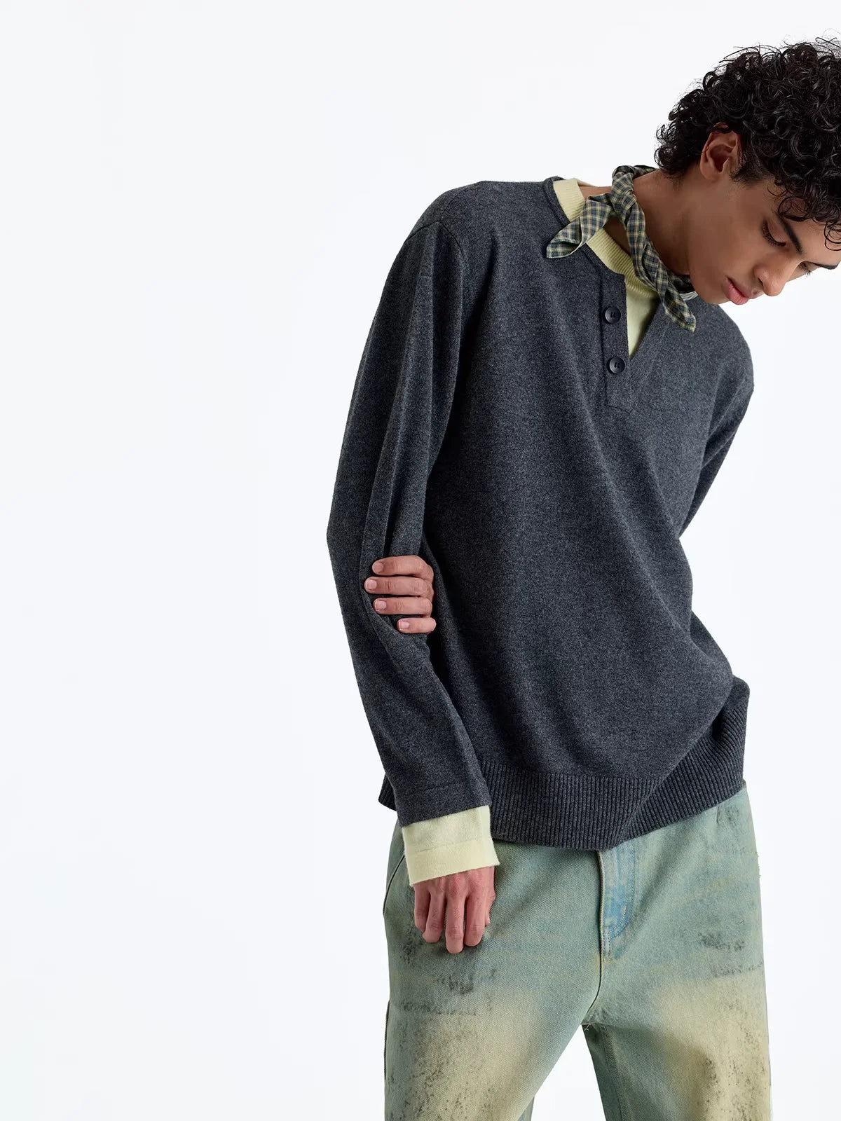 This men's knit sweater combines luxurious comfort with sophisticated style, crafted from a premium wool and cashmere blend. Featuring a distinctive layered double collar with a contrast color design, it delivers a unique twist on the classic henley. The long sleeves and ribbed hems offer cozy wearability, while the layered look is enhanced by a yellow shirt cuff and green plaid scarf for added visual interest. Perfect for a polished yet relaxed outfit.