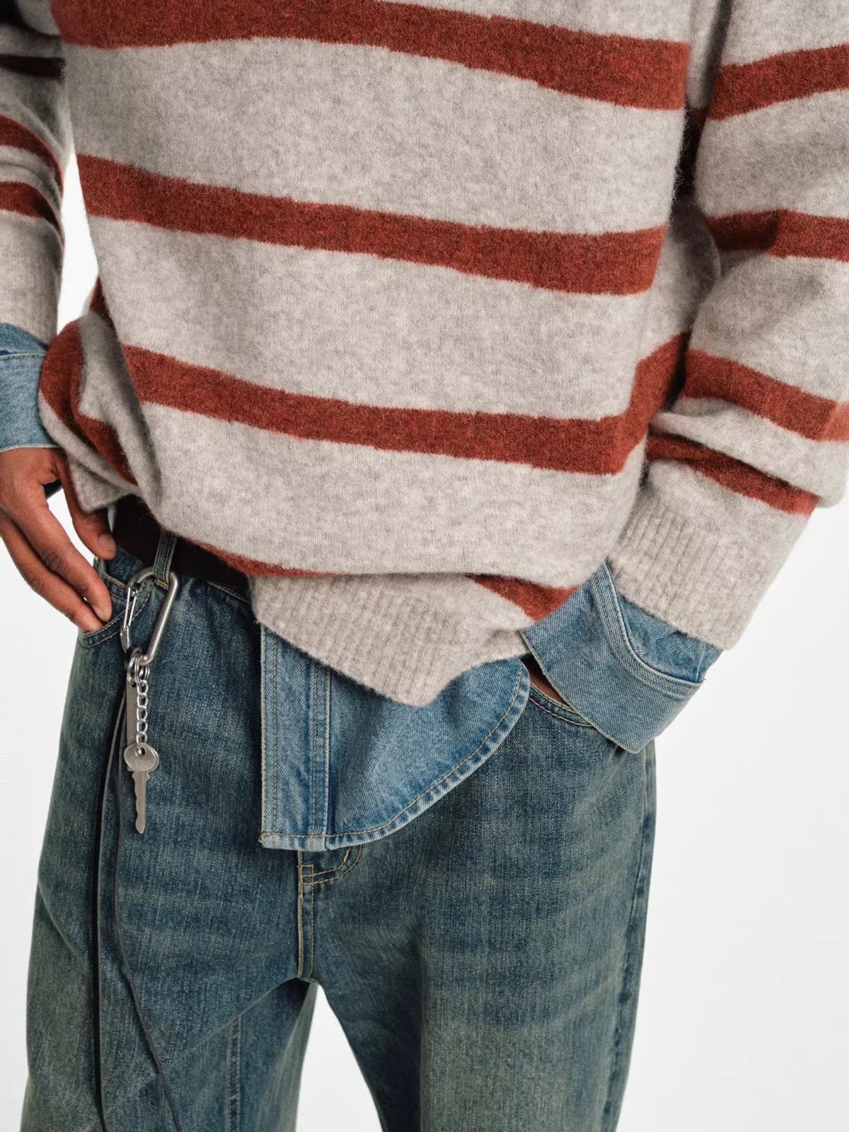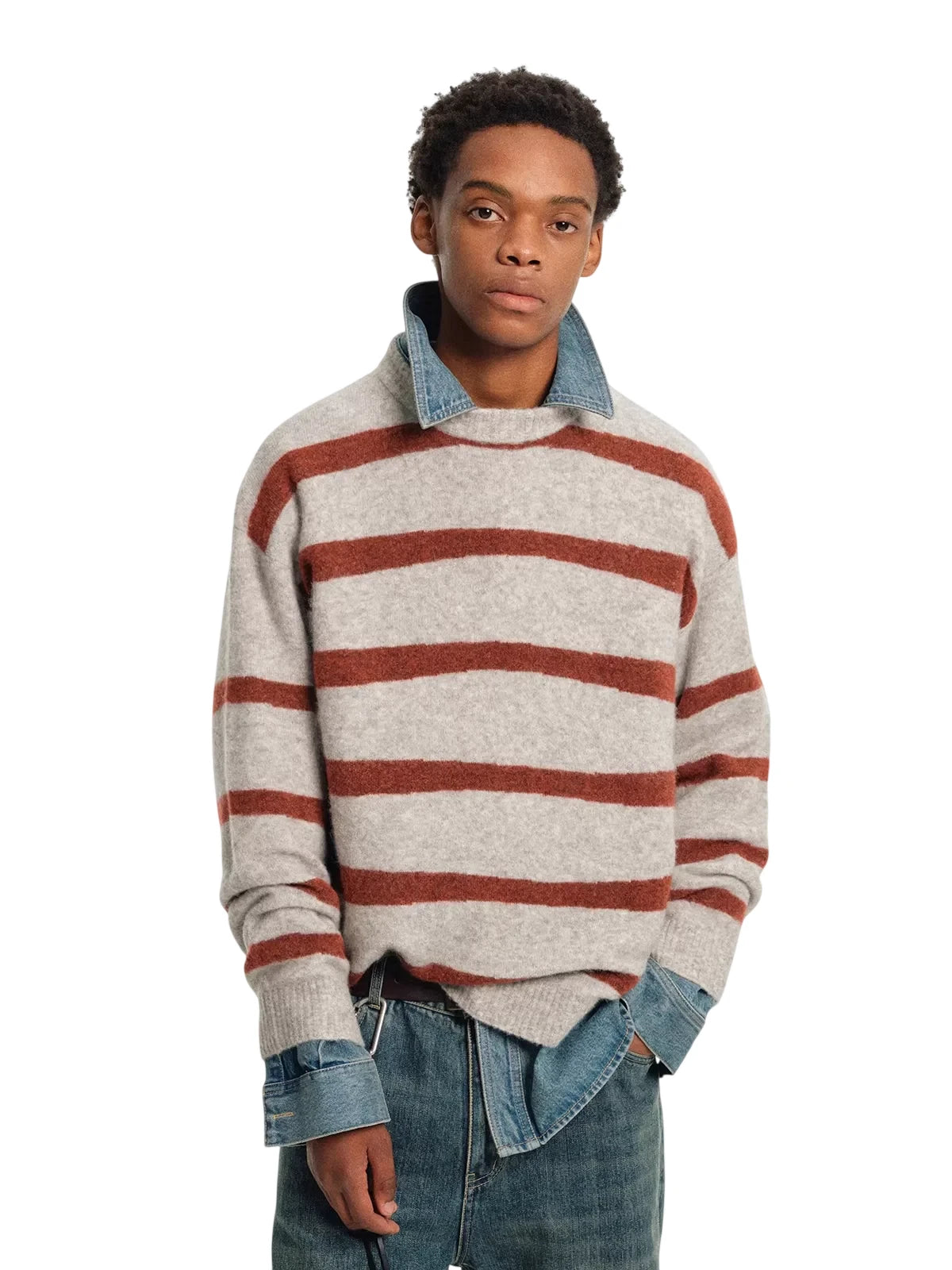 This men's crewneck sweater features a soft alpaca wool blend construction with a bold intarsia-knit design. The relaxed fit showcases horizontal rust-red and light grey colorblock stripes for a modern, artistic edge. Extended cuffs and a classic neckline lend casual sophistication, while the versatile hue pairs effortlessly with layered looks. Ideal for cool-weather styling with denim or trousers.
