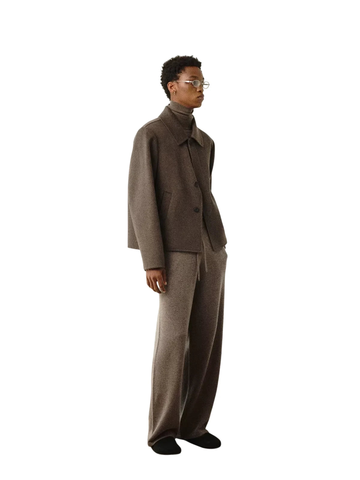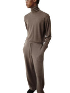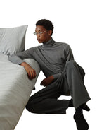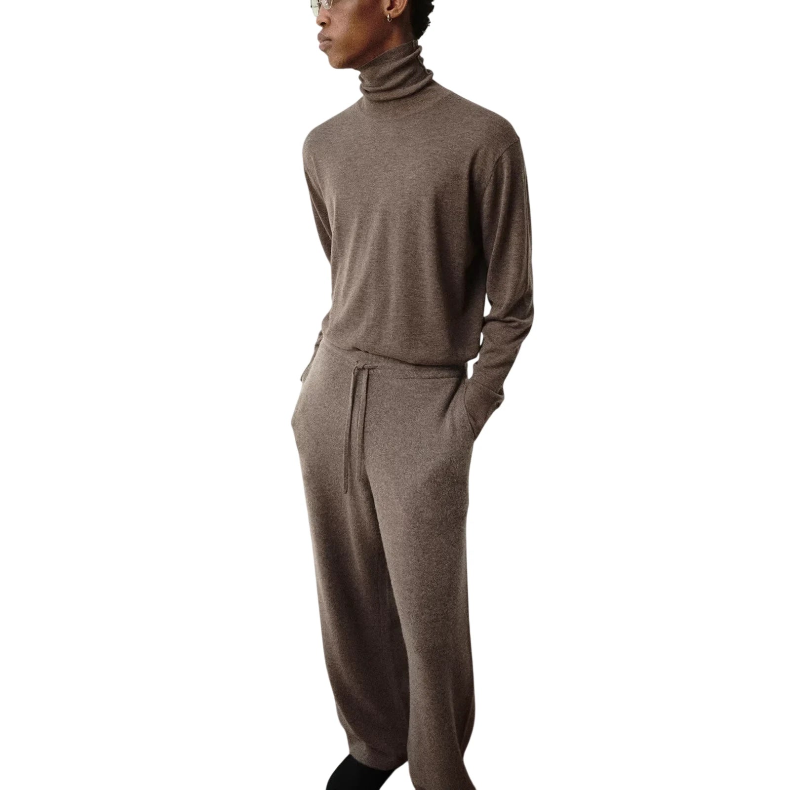 This men's turtleneck knit base layer is crafted from premium 16.5-micron fine-spun cashmere wool, offering exceptional softness and warmth. Designed with a relaxed fit, this long-sleeve turtleneck provides both style and comfort, making it an ideal choice for layering or lounging. The coordinating loungewear set, in a soft taupe hue, includes a top and wide-leg drawstring pants for a minimal yet elegant look perfect for home or casual wear.