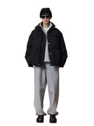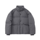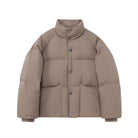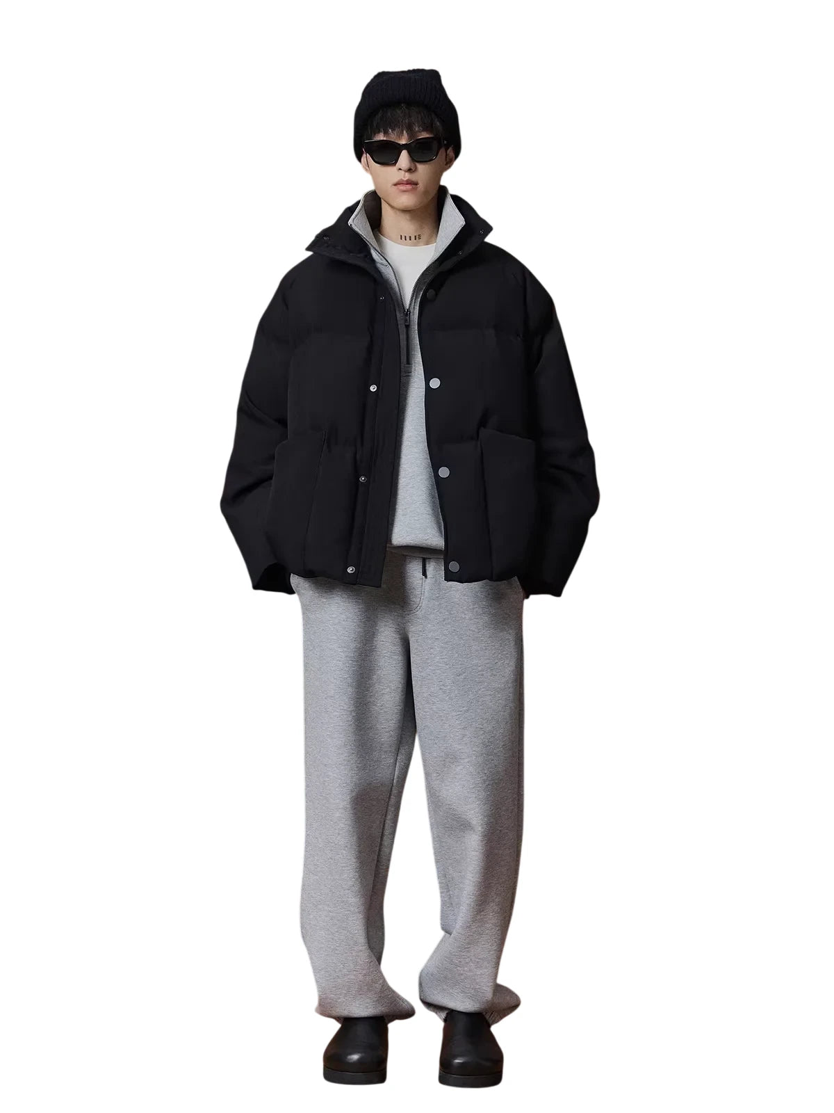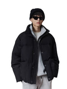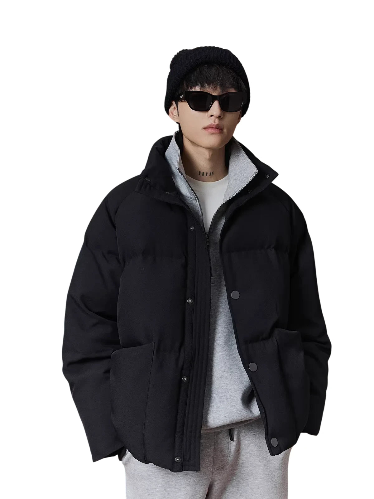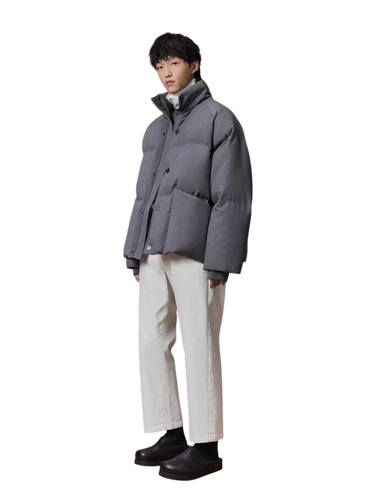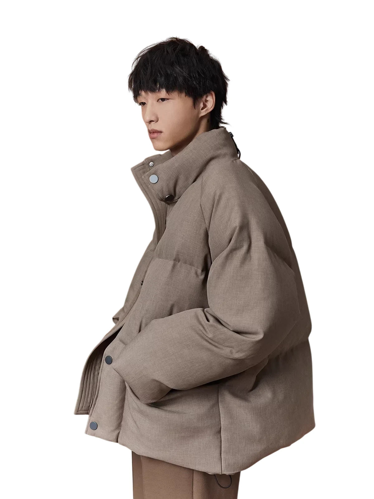 Designed for cold weather, this men's heavyweight down puffer jacket offers superior warmth and comfort. Crafted with a fine wool-feel blended fabric and a twill texture, it features raglan sleeves for ease of movement and a high-neck design to protect against the elements. The wide quilted construction and snap button closure add both style and insulation, making it perfect for modern, urban winter layering.