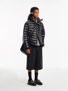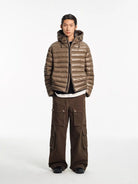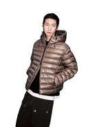 This men's hooded down jacket offers a sleek and modern silhouette with a glossy finish and lightweight feel. Designed with narrow horizontal quilting and curved panel construction, it provides both warmth and style for colder weather. The cropped length and minimalist design make it a versatile choice for urban and sporty outfits.