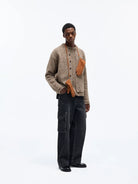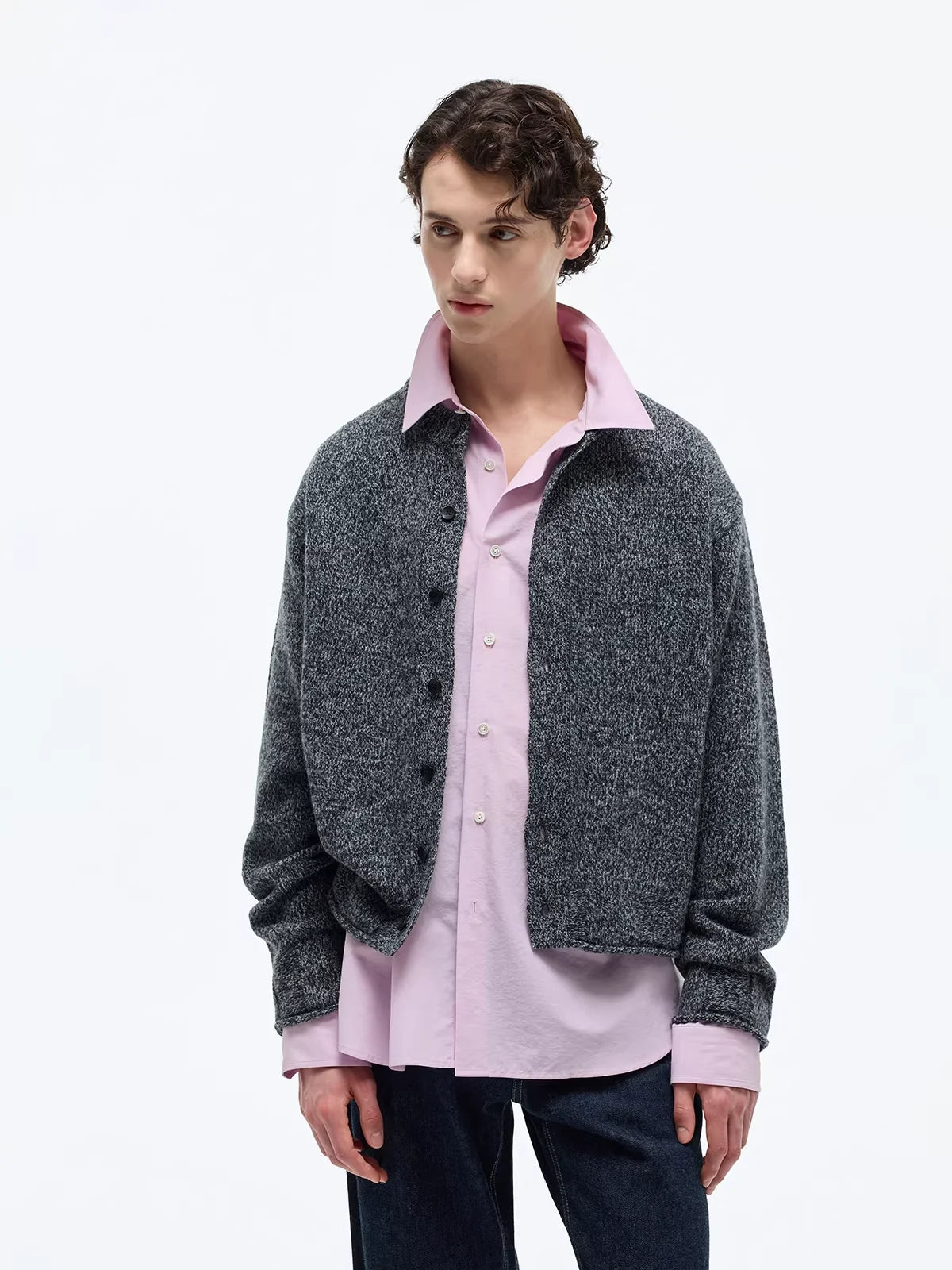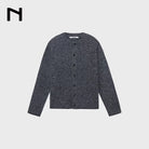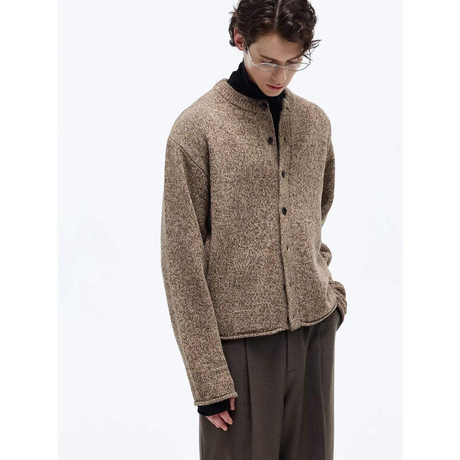 Elevate your everyday style with this men's slim crew neck cardigan, crafted from an extra fine merino wool blend for a soft and refined texture. Designed with a clean, collarless neckline and rolled-edge finishing, this classic knit features a button-up front with subtle black buttons. The heathered brown color adds warmth and versatility, perfect for layering over a turtleneck or shirt. Pair with relaxed trousers for a modern, polished look.