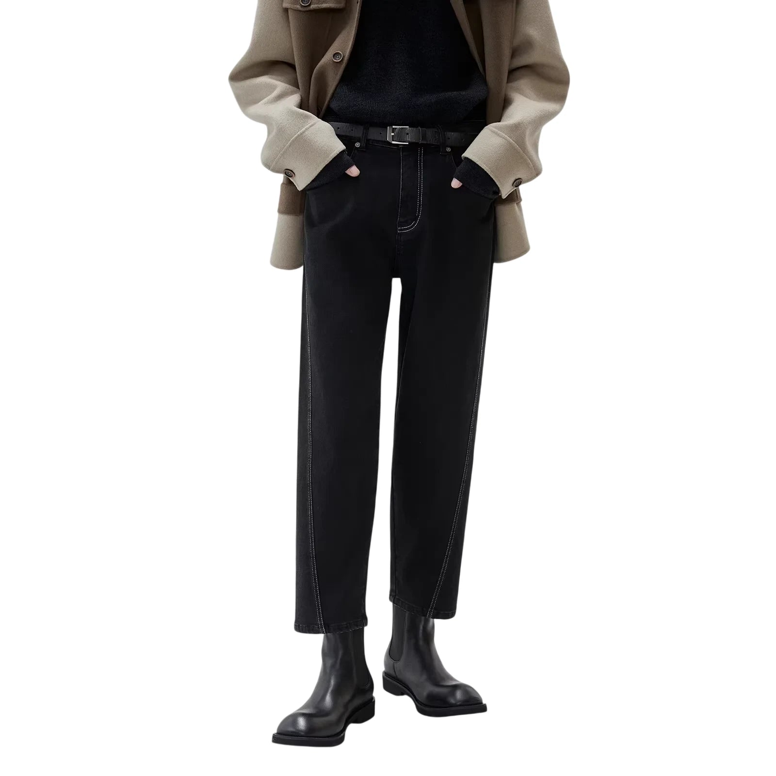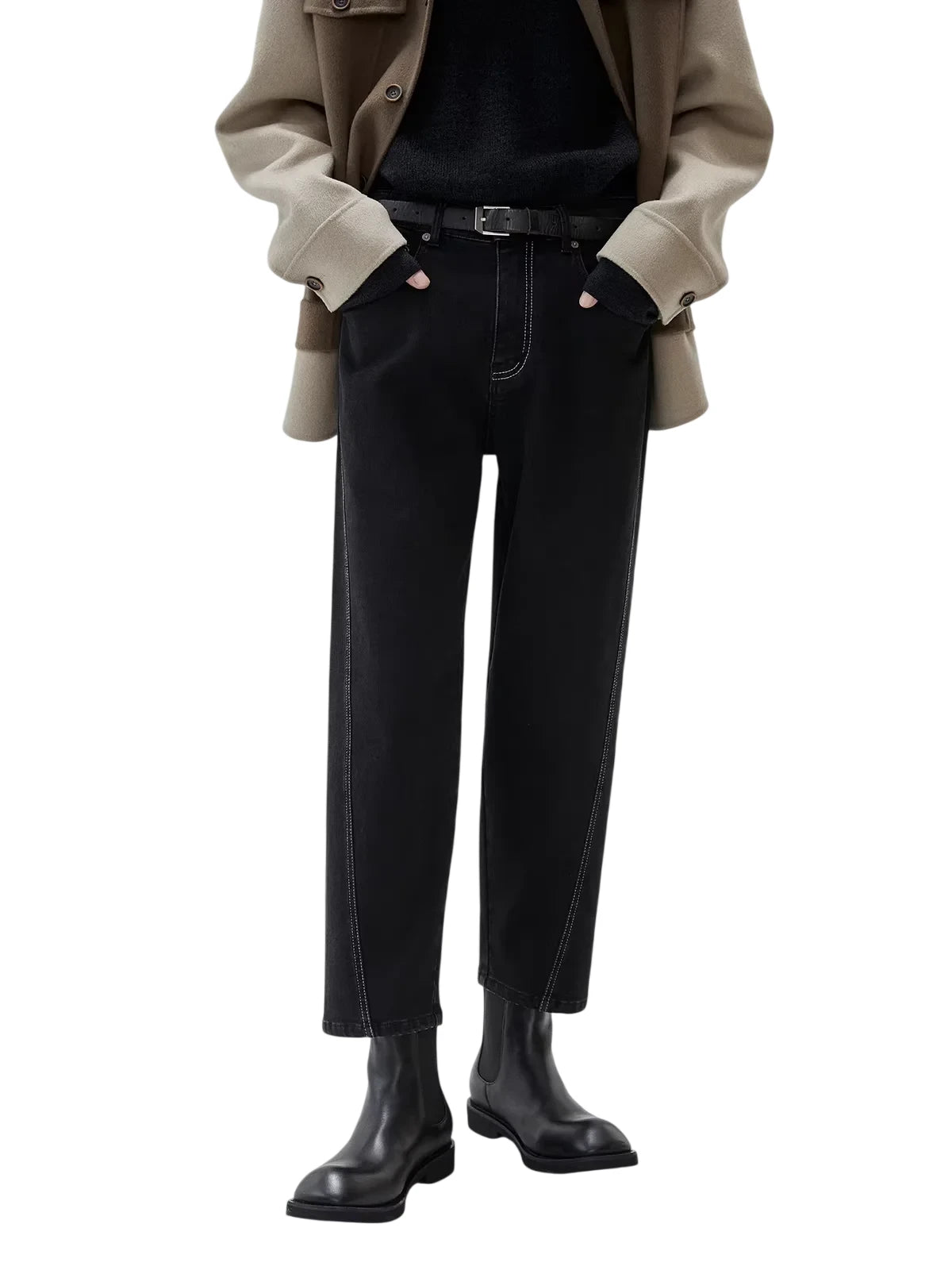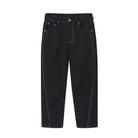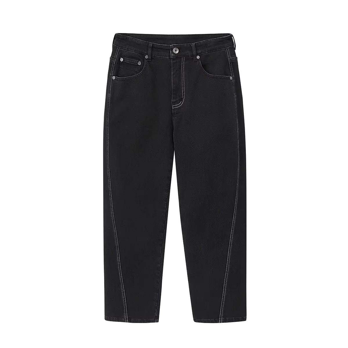Upgrade your winter wardrobe with these men's slim fit cropped jeans, crafted with a tapered leg and asymmetrical side seam design for a contemporary edge. Featuring a fleece lining for added warmth, these black jeans are accented with striking white contrast stitching. High-waisted and structured, they pair effortlessly with boots and outerwear for a refined cold-weather look.