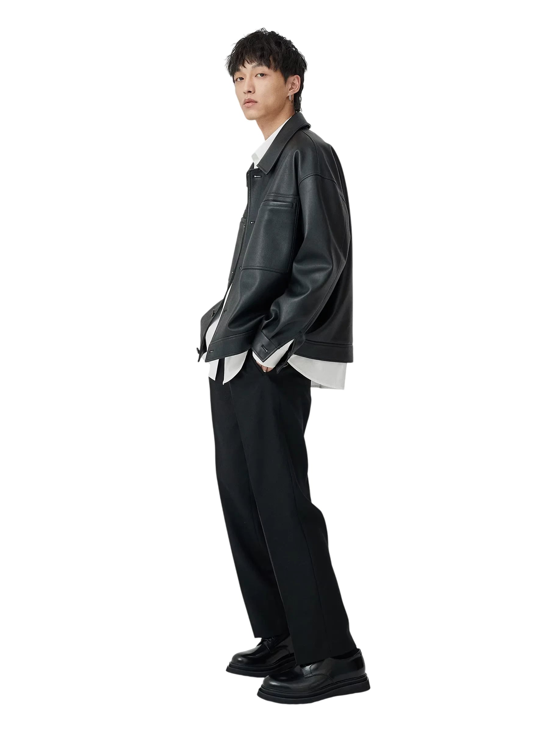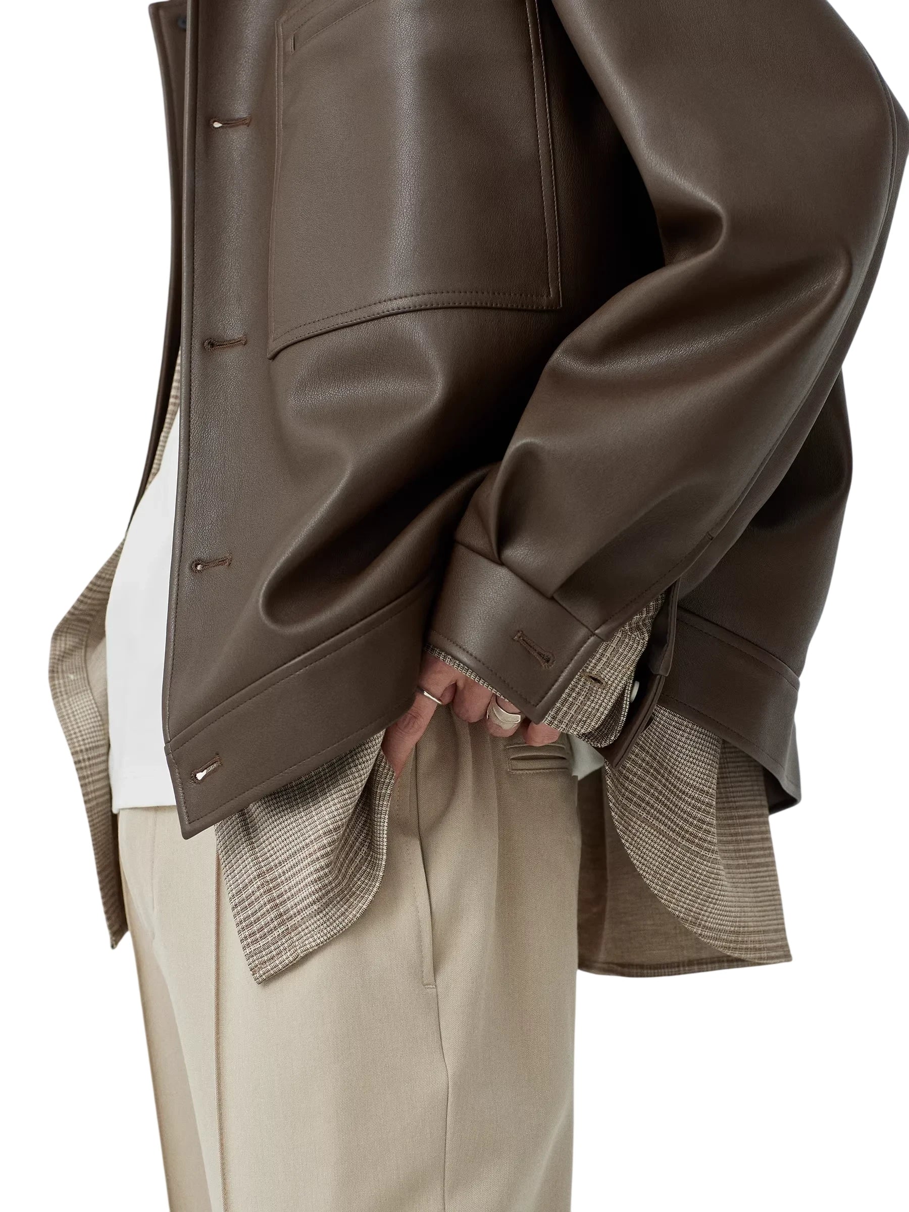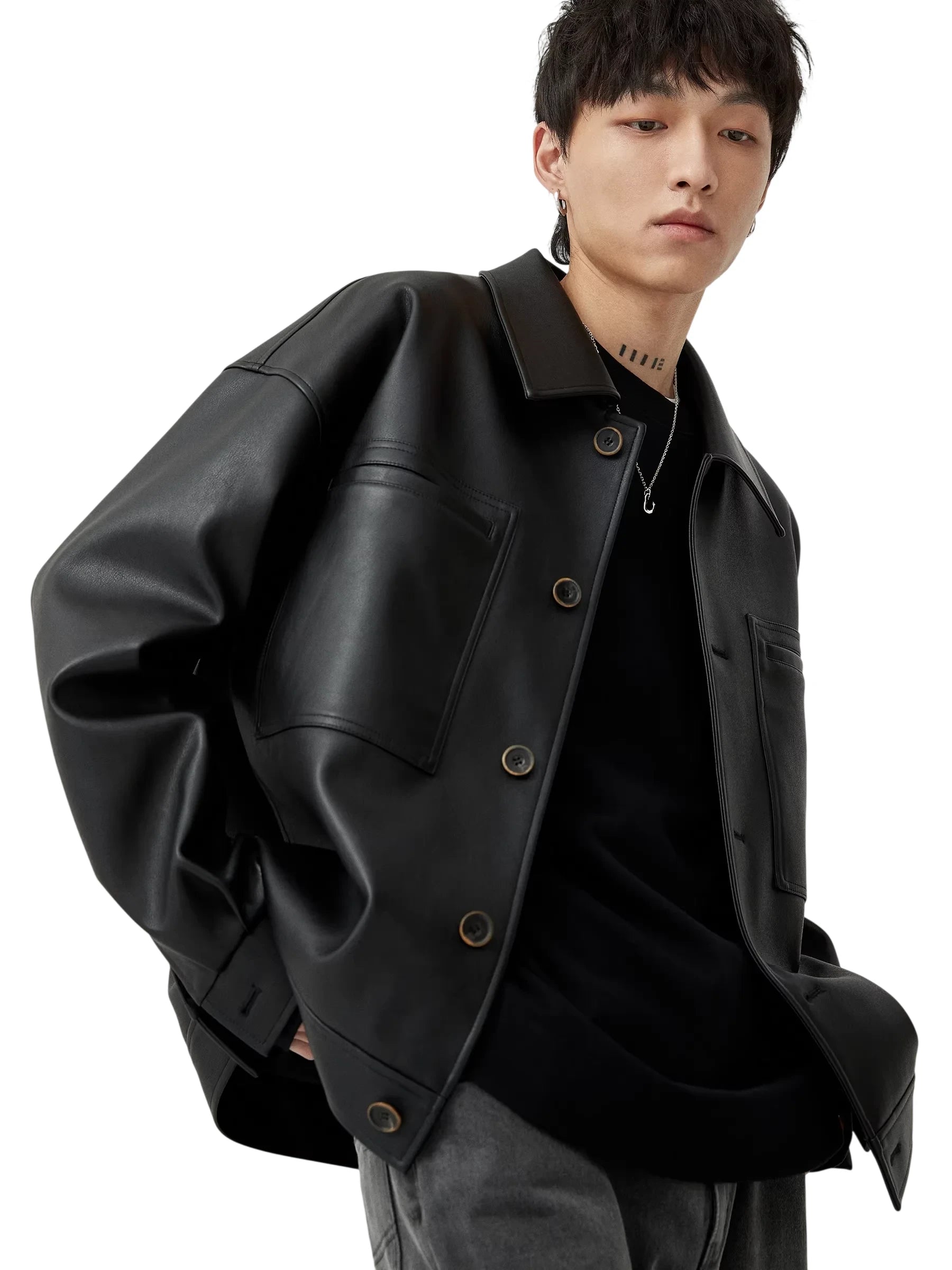 NANS Menswear Men's Oversized Faux Leather Jacket with Pocket and Square Collar