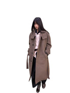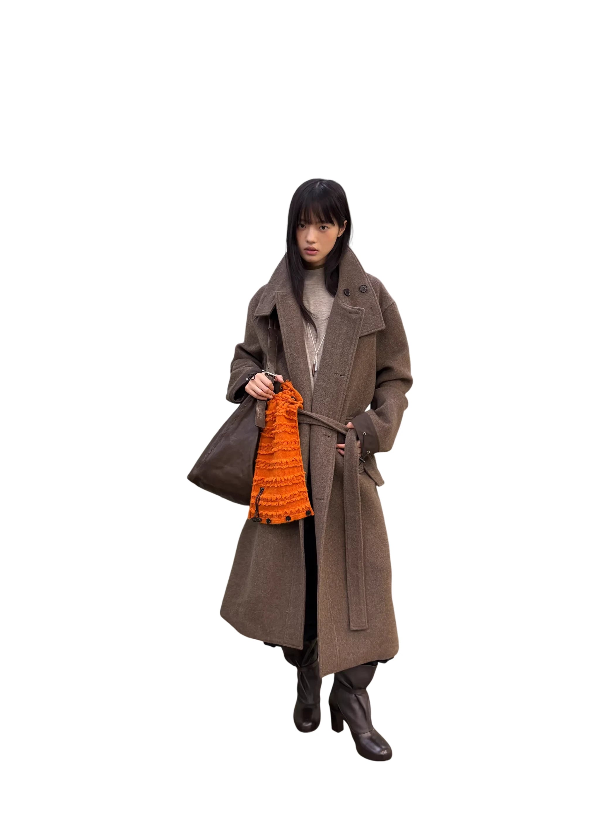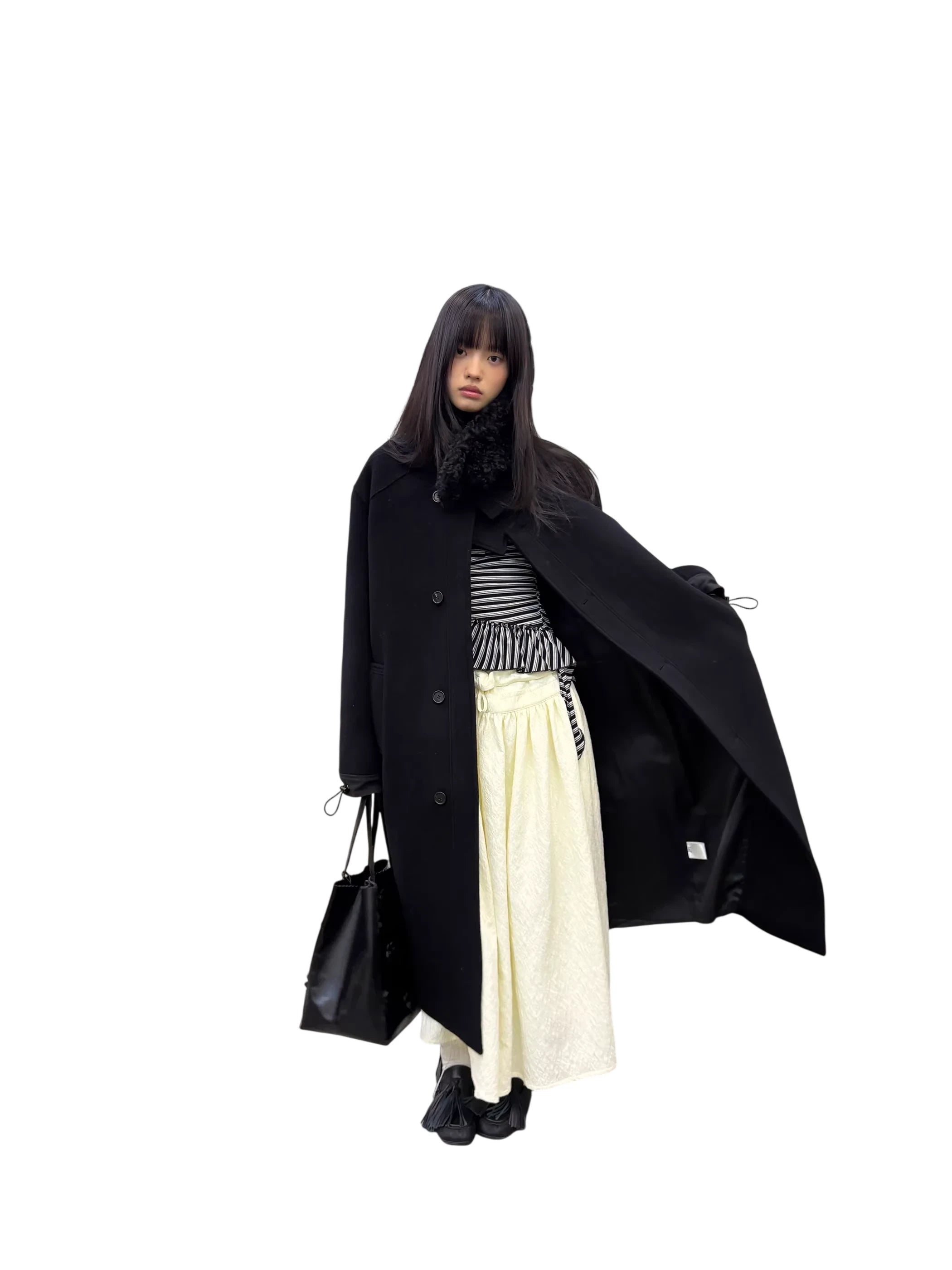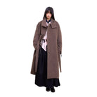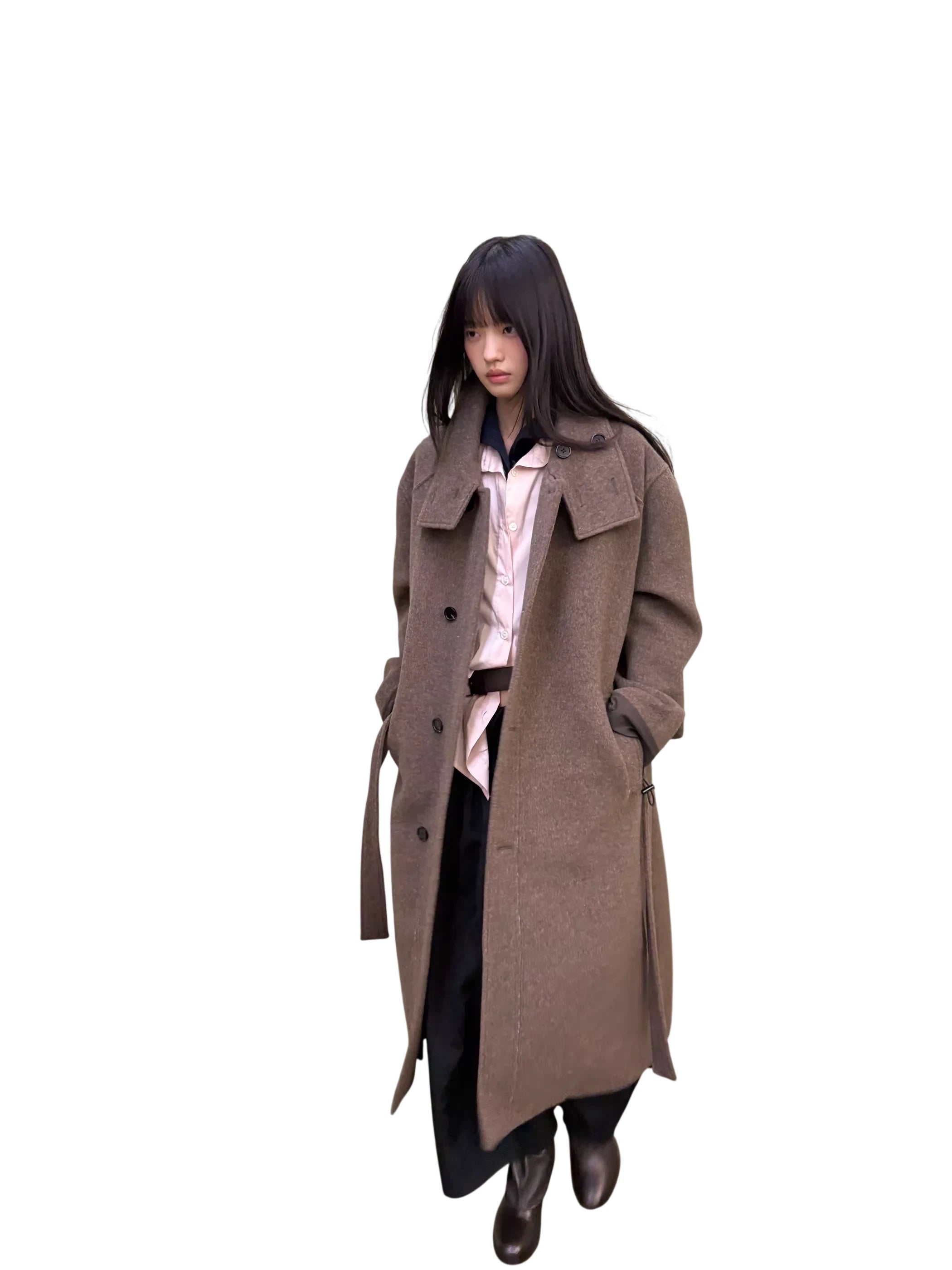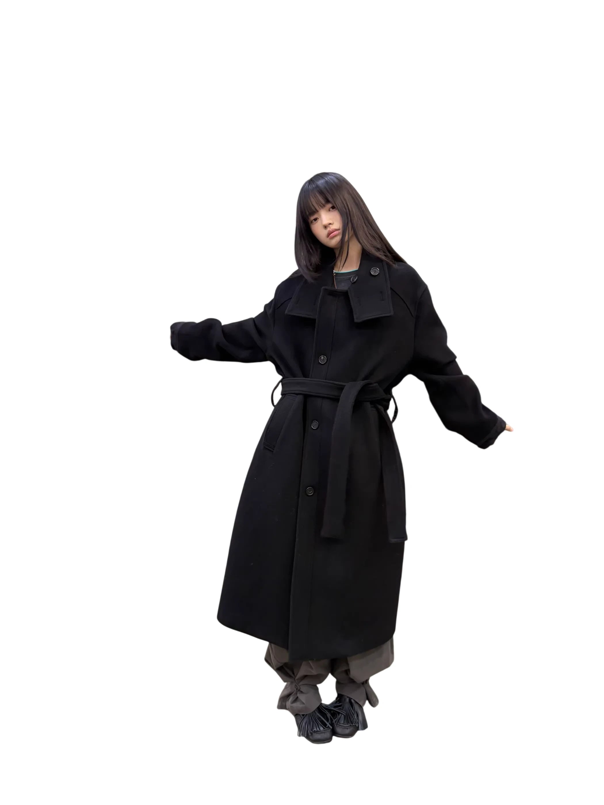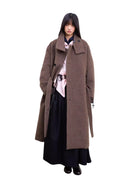 This stylish women's long coat features an asymmetrical button closure and a structured collar for a modern silhouette. Crafted from a warm wool-blend fabric, the design includes raw edges for a subtle contemporary twist. Perfect for colder seasons, this oversized coat layers effortlessly over a variety of outfits. Shown here with a soft pink blouse and high-waisted skirt, it embodies a minimalist aesthetic with a touch of androgynous sophistication.