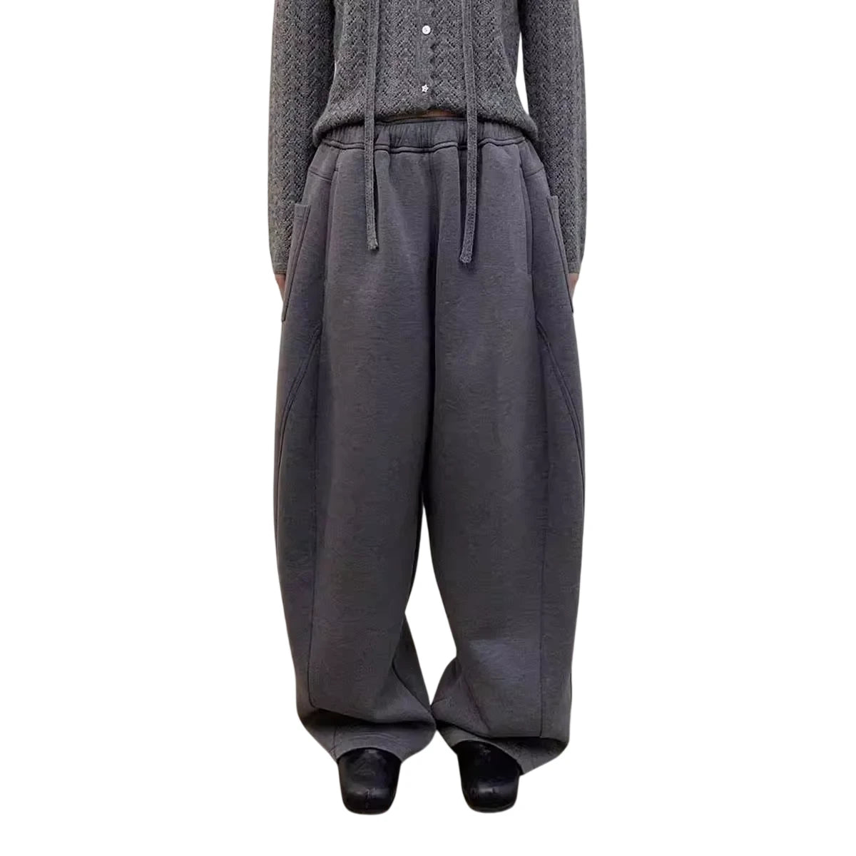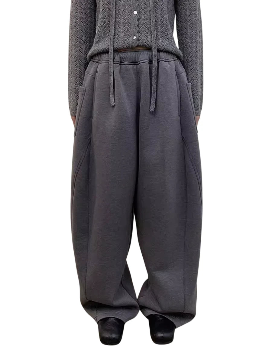 These women's wide-leg sweatpants are crafted from soft, thick cotton in a deep gray hue. Featuring a relaxed, oversized fit with a dropped crotch design, they offer ultimate comfort and a modern silhouette. The pants include large side pockets for functionality and an elastic waistband with a drawstring for an adjustable fit. Ideal for casual or athleisure wear, these sweatpants blend style and ease effortlessly.