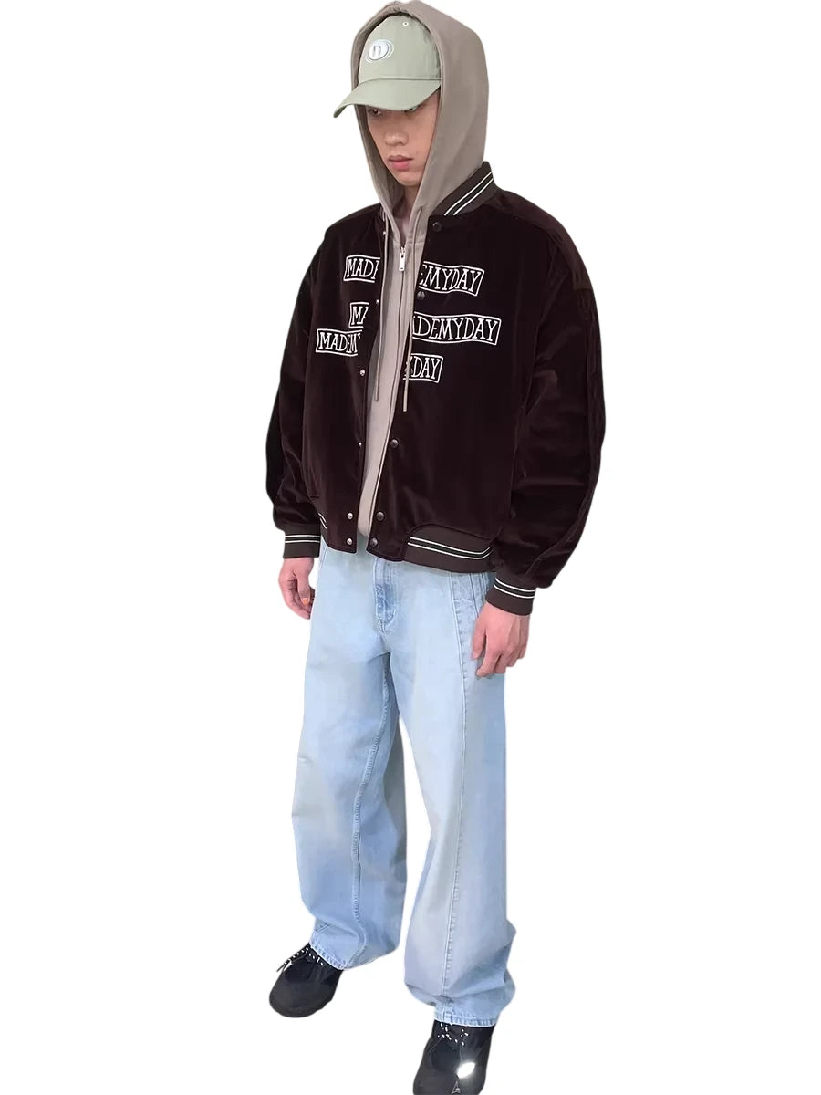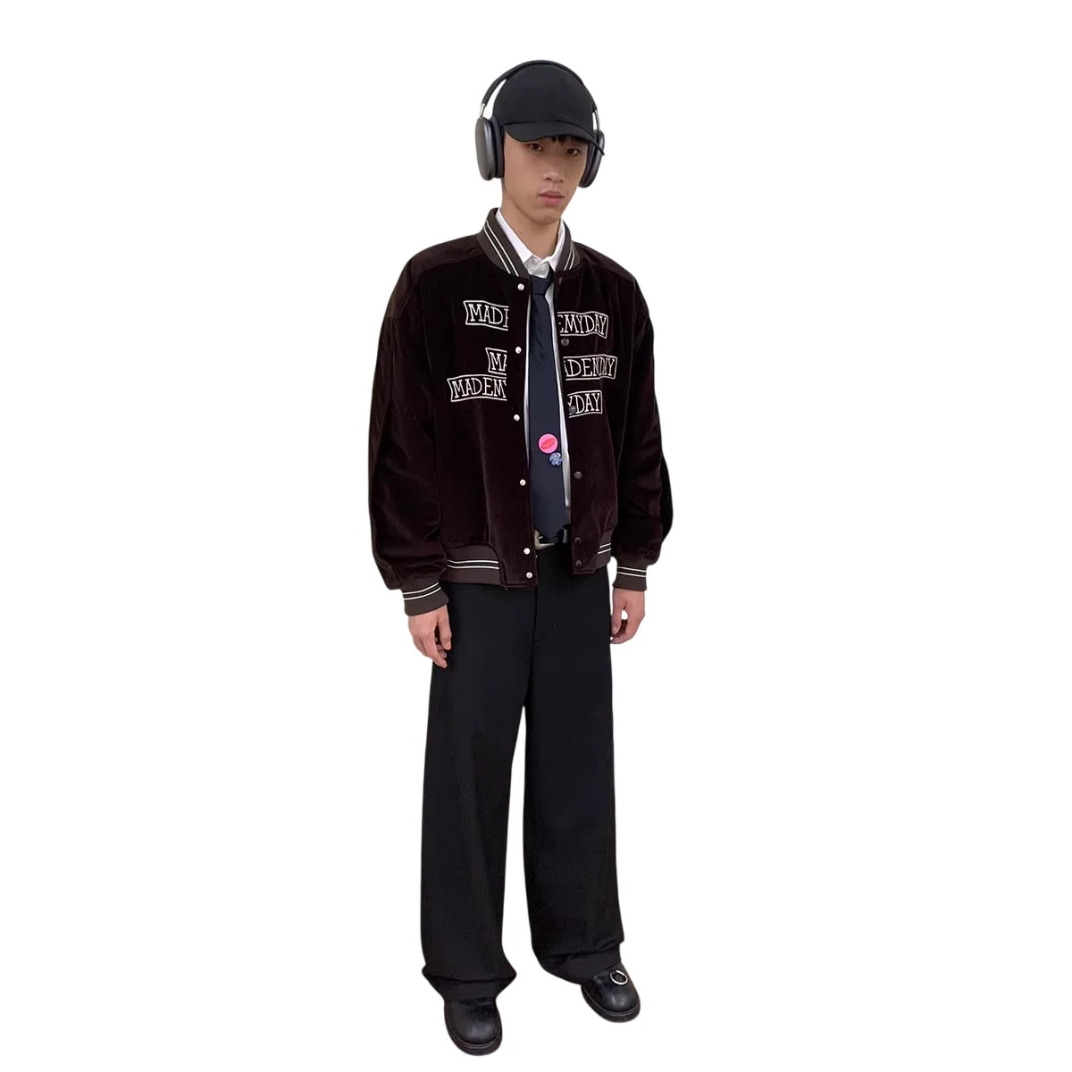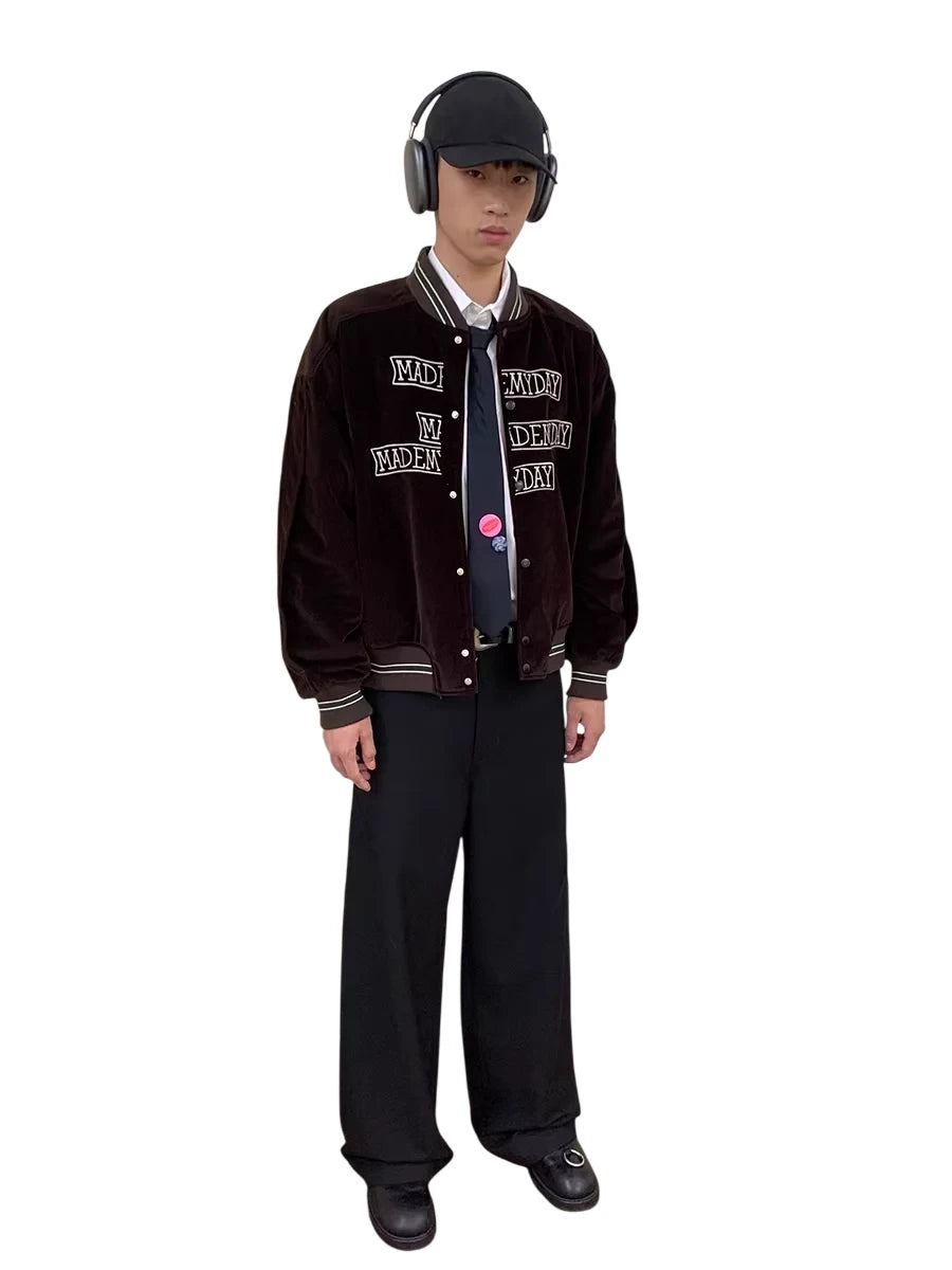 This men's MA1 padded jacket blends classic corduroy with plush velvet for a refined yet urban feel. Featuring a rich burgundy color and bold embroidered text detailing on the front, it offers a modern twist on a varsity silhouette. The jacket is designed with structured padding for warmth and comfort, ideal for layering during cooler months. Pair it effortlessly with tailored or casual pieces for a standout streetwear look.
